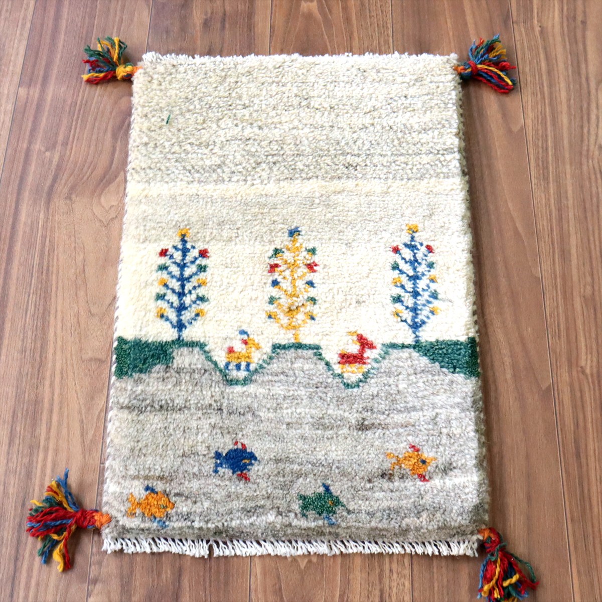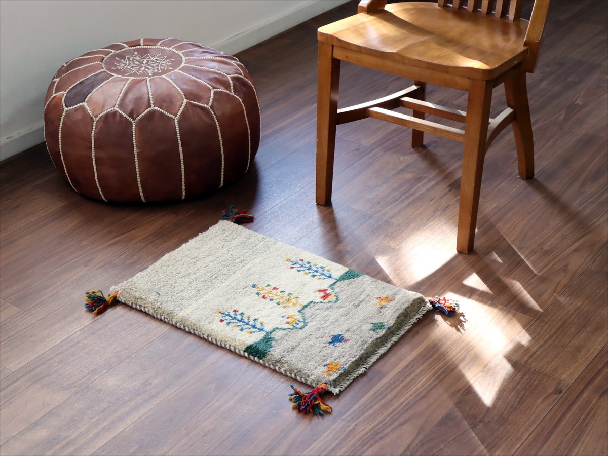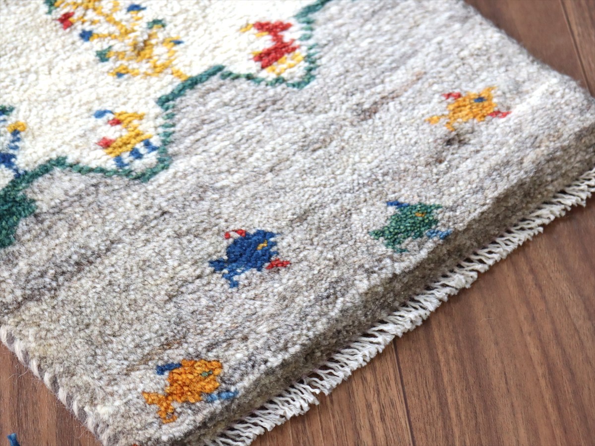 天然の羊毛の色をそのまま使ったアイボリーのギャッベ。ところどころグレーやベージュの毛糸も混ざっています。