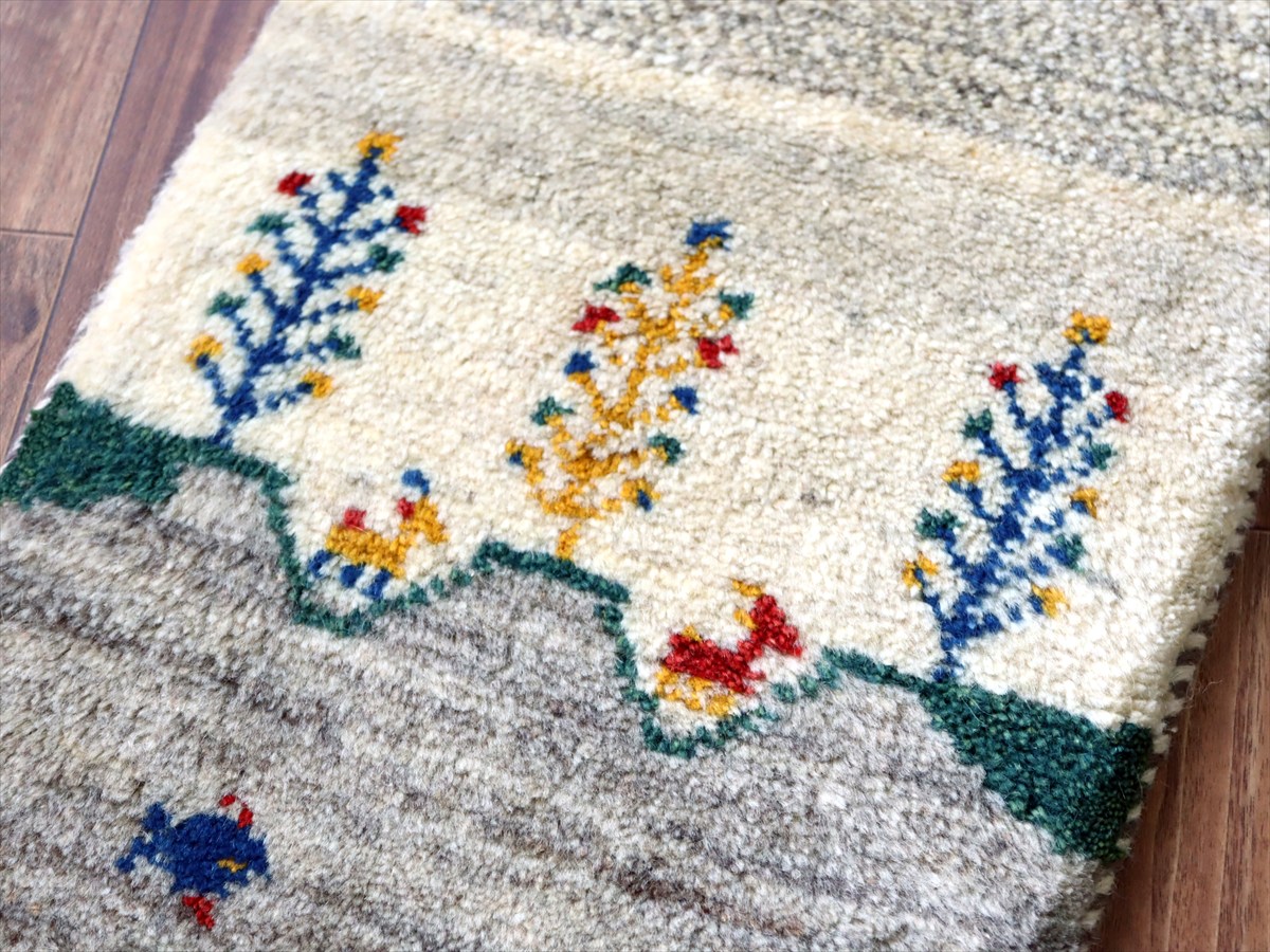 座布団サイズのギャッベとしては、すっきりとした毛足の刈り込みで、モチーフがくっきりと見えます。パイルを含めたギャベの厚みは、1.7-1.8cm程度です。
