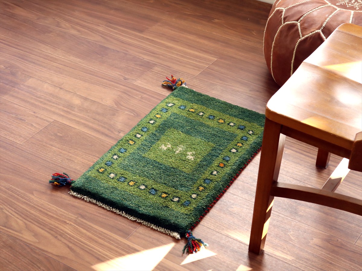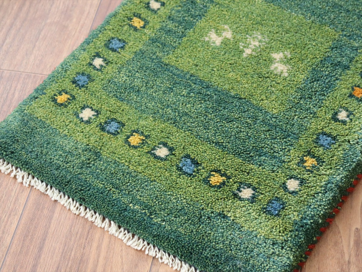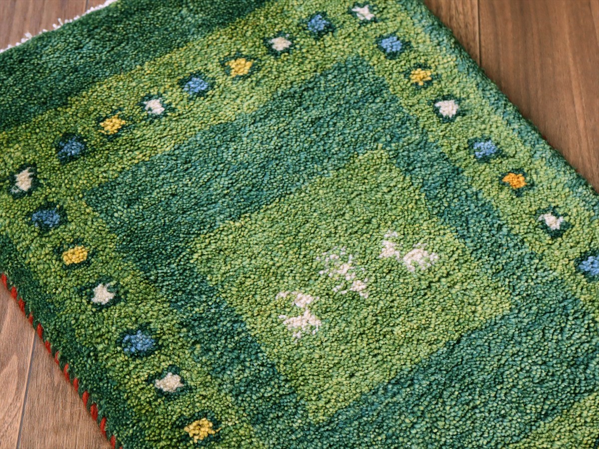 座布団サイズのギャッベとしては、すっきりとした毛足の刈り込みで、モチーフがくっきりと見えます。パイルを含めたギャベの厚みは、1.7-1.8cm程度です。