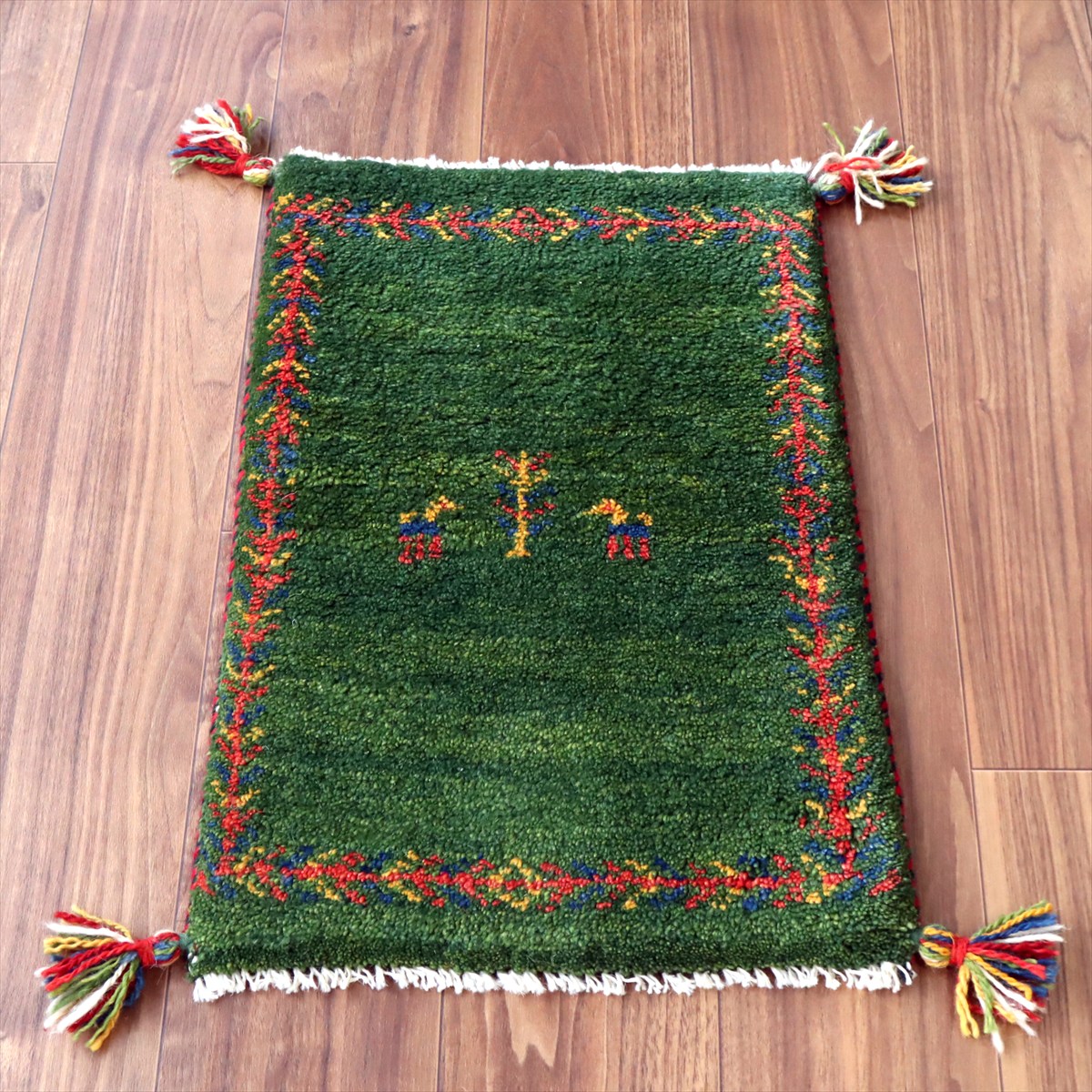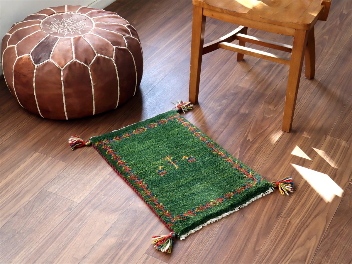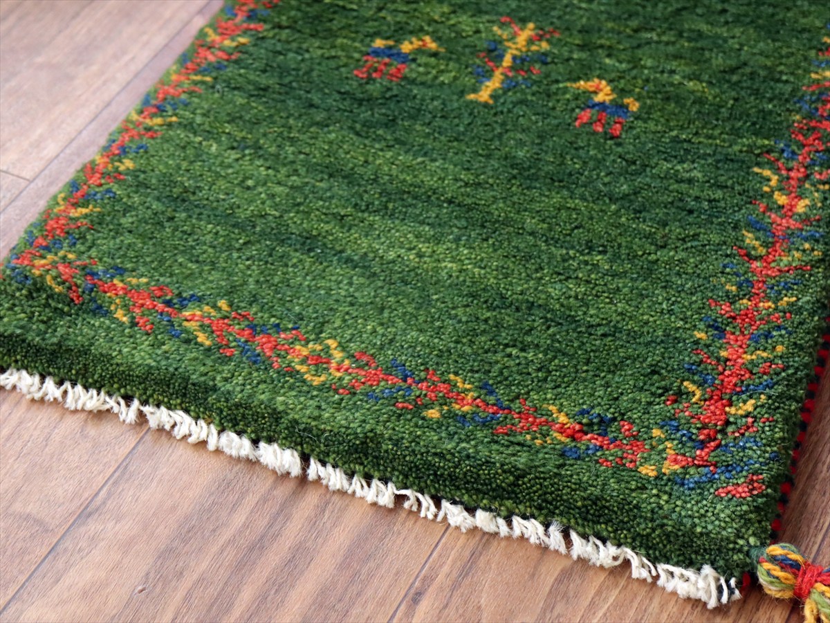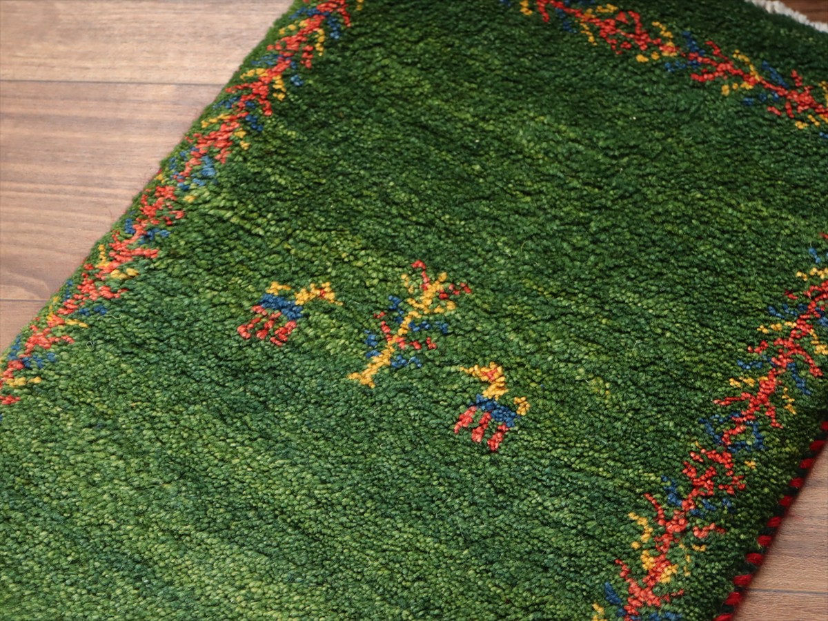 座布団サイズのギャッベとしては、すっきりとした毛足の刈り込みで、モチーフがくっきりと見えます。パイルを含めたギャベの厚みは、1.7-1.8cm程度です。