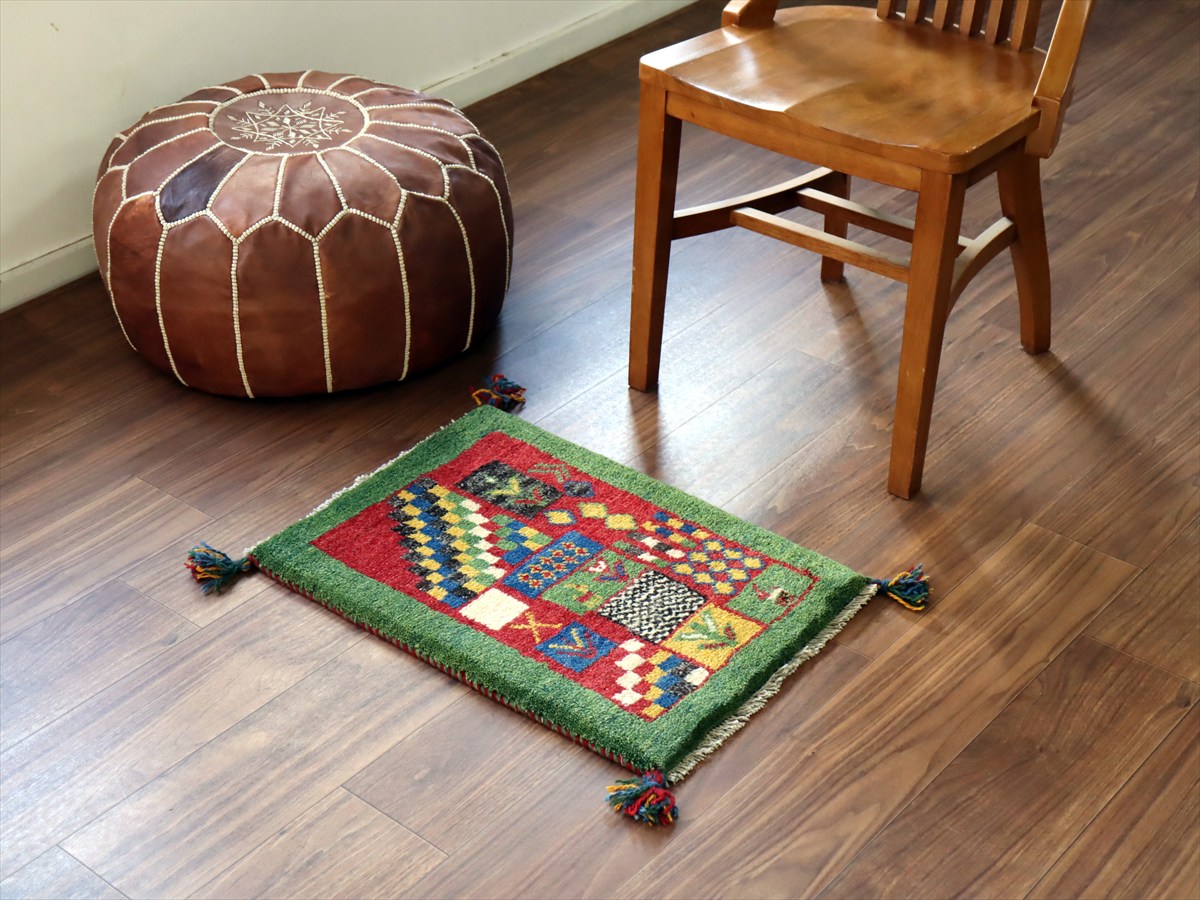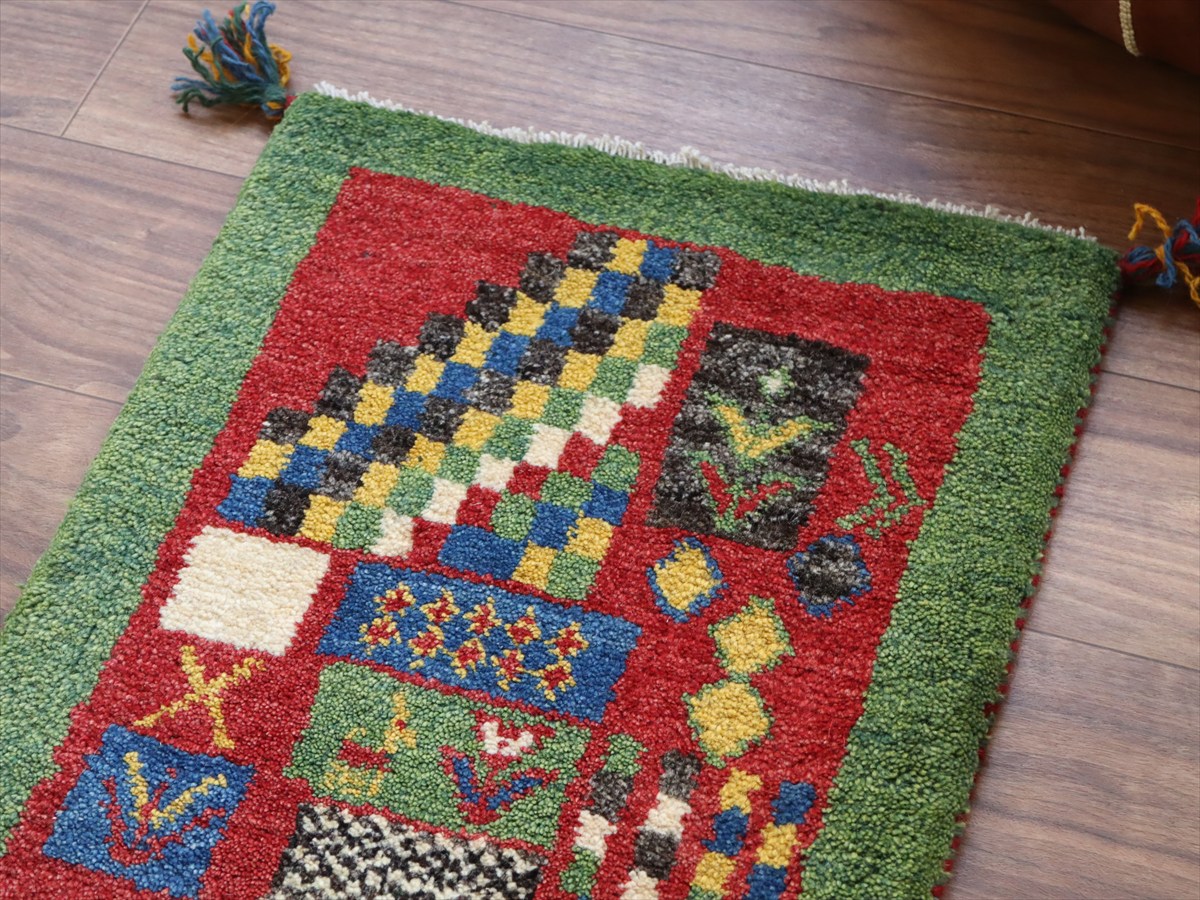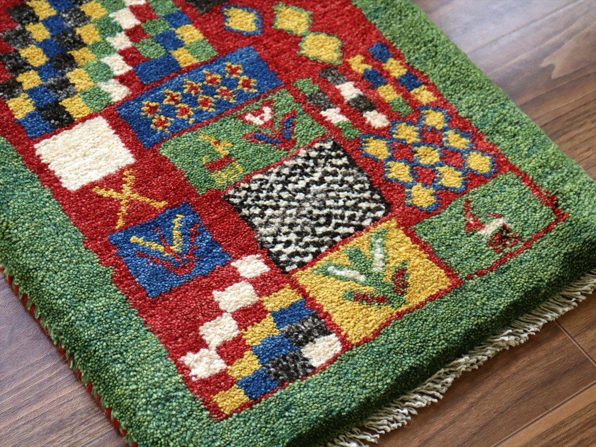 グリーンとレッドでカラフルなタイルの中に、生命の樹や動物モチーフが織られている独創的な一枚に仕上がっています。