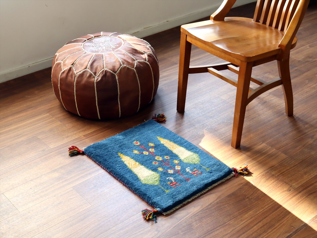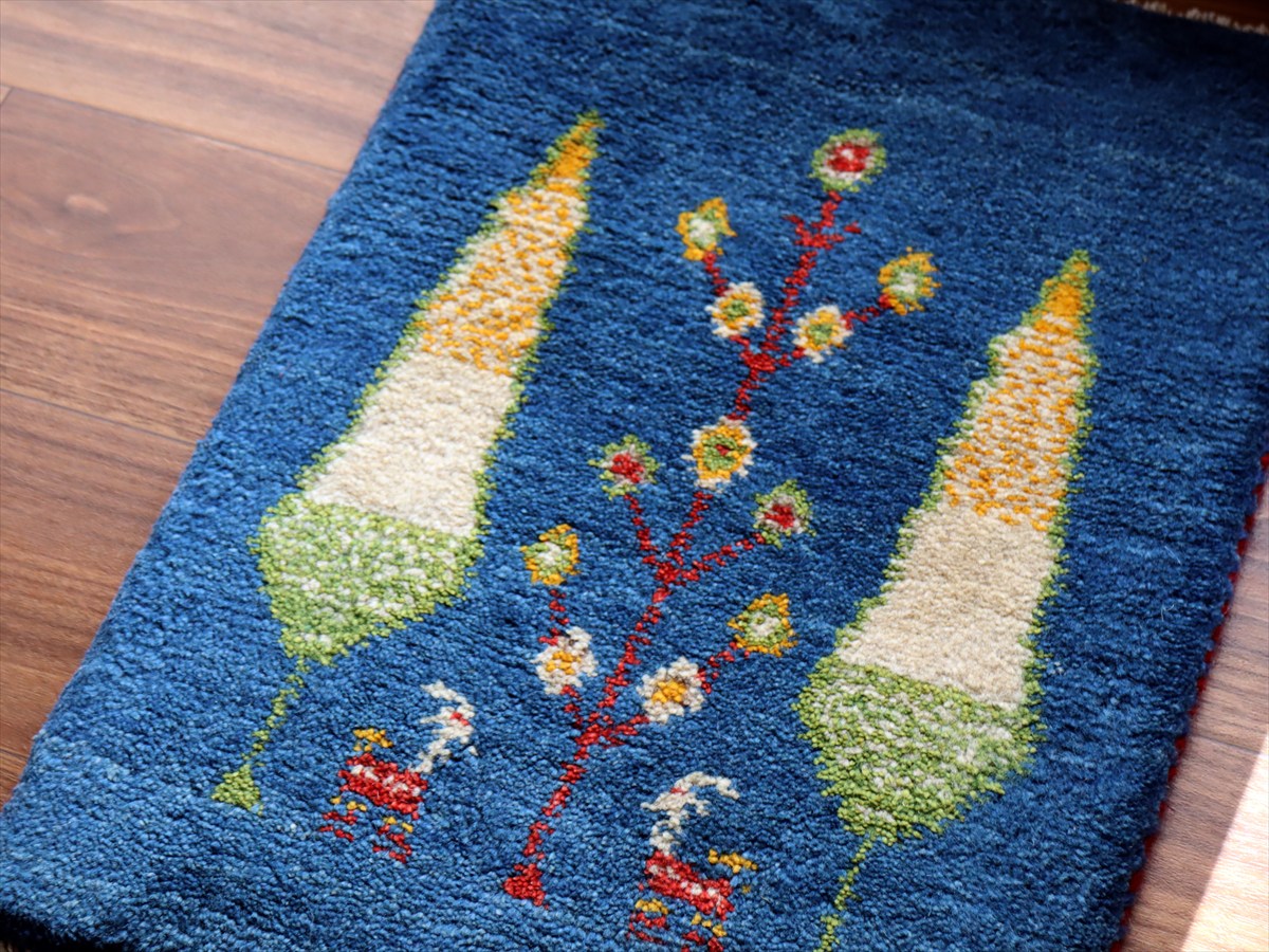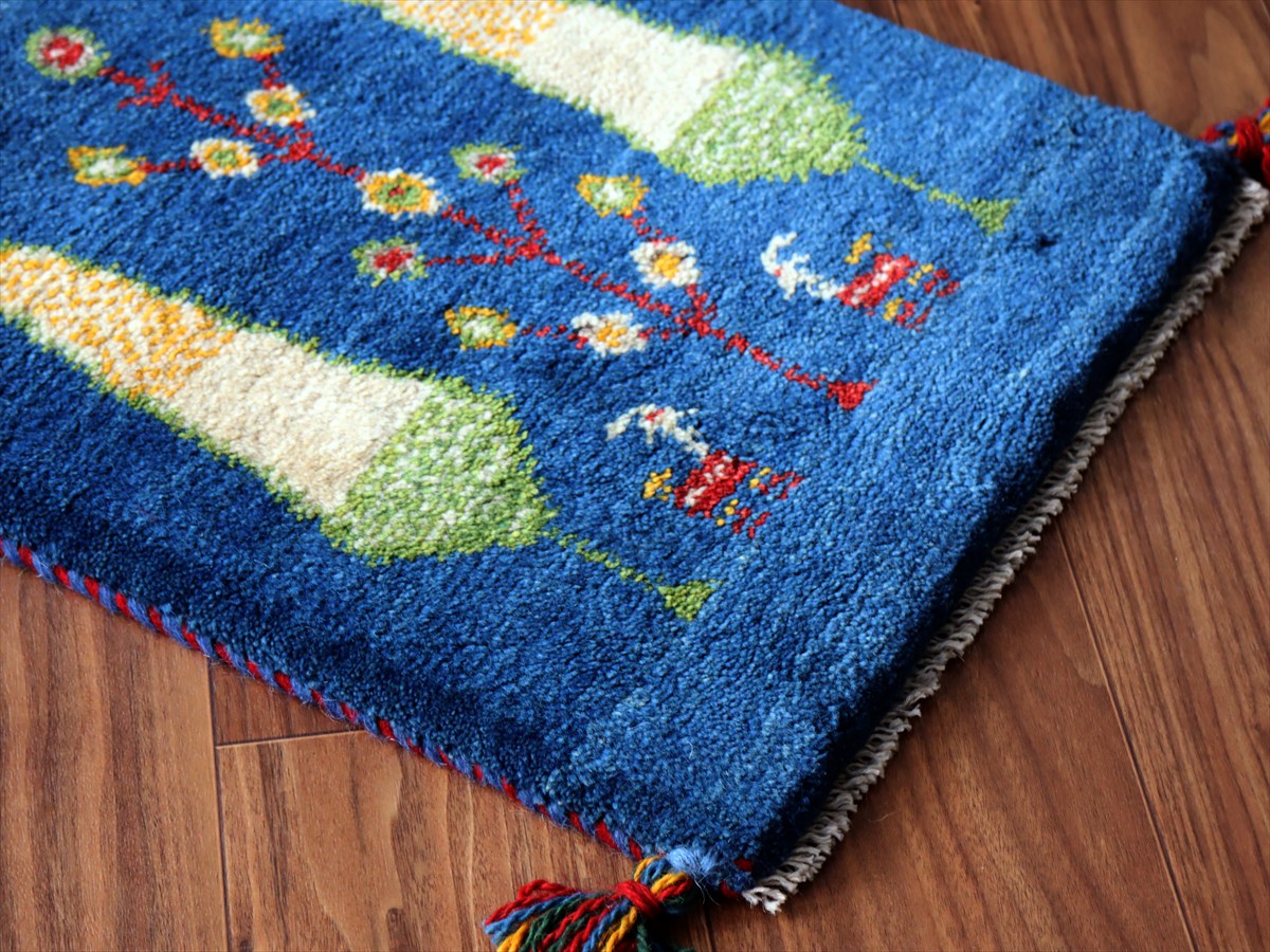 明るいブルーのベースは色ムラによる自然なグラデーションができています。糸杉は長寿を願う意味を持っていて、ギャベでは多用されるモチーフのひとつです。