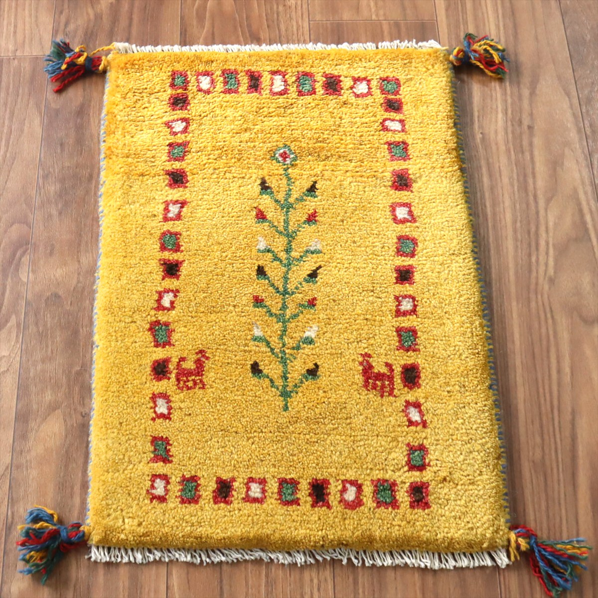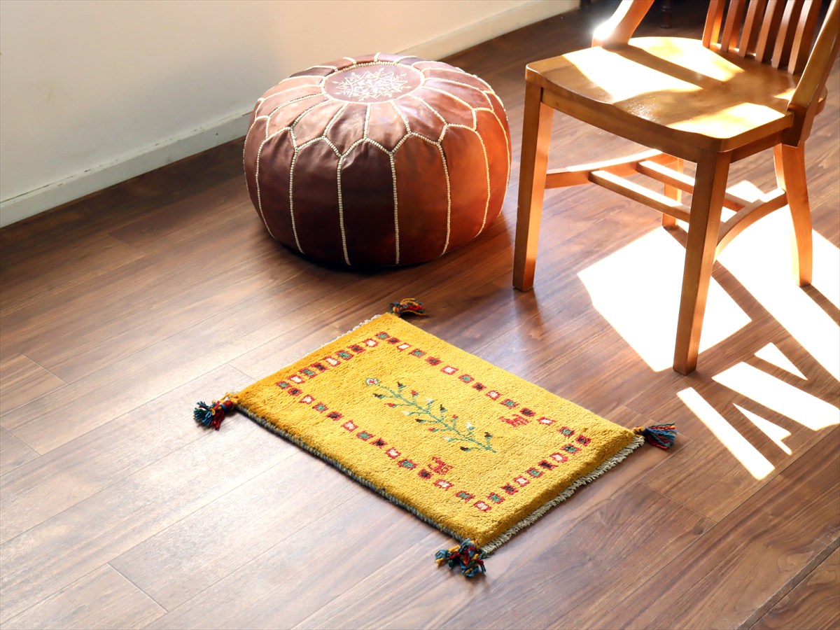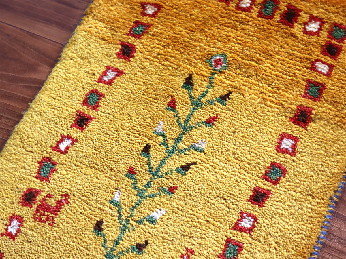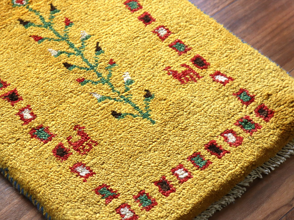 座布団サイズのギャッベとしては、すっきりとした毛足の刈り込みで、モチーフがくっきりと見えます。パイルを含めたギャベの厚みは、1.7-1.8cm程度です。