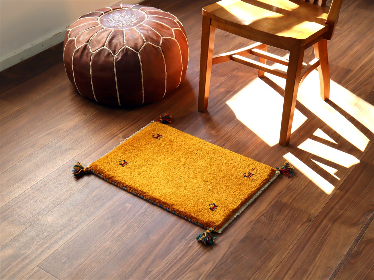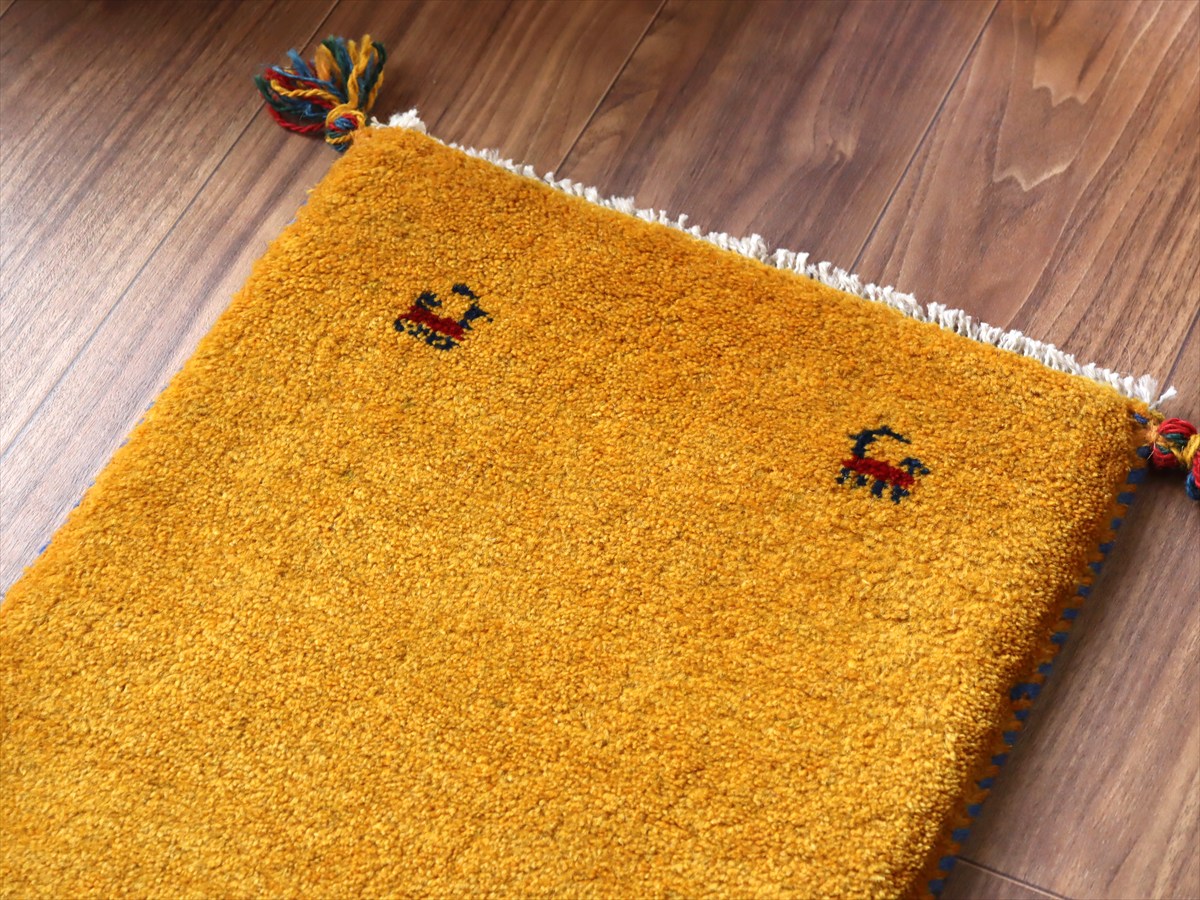 ザクロの実の皮などで染めた発色の良い明るいイエローとオレンジをベースに、四隅に動物モチーフが織られているシンプルな一枚。