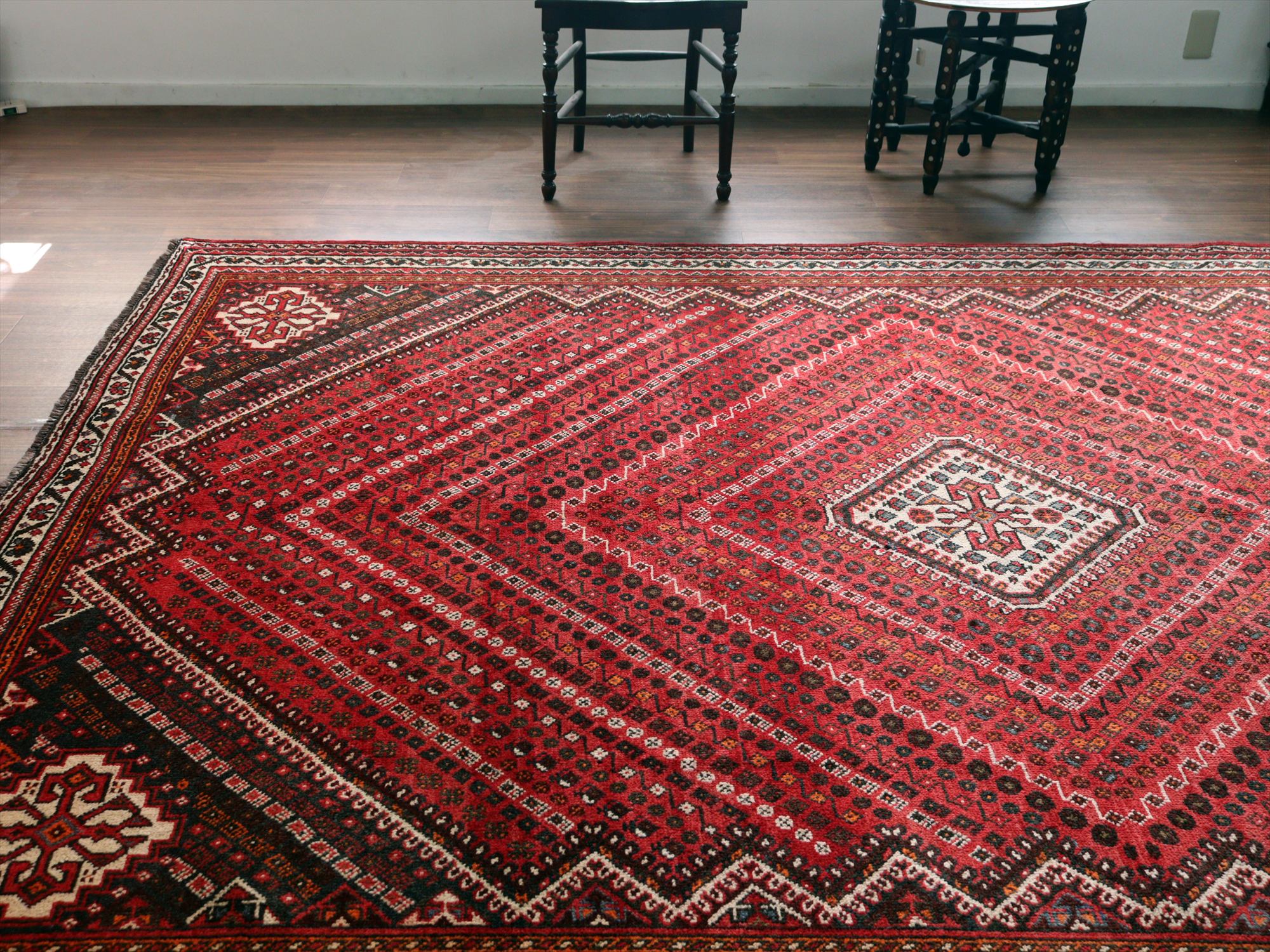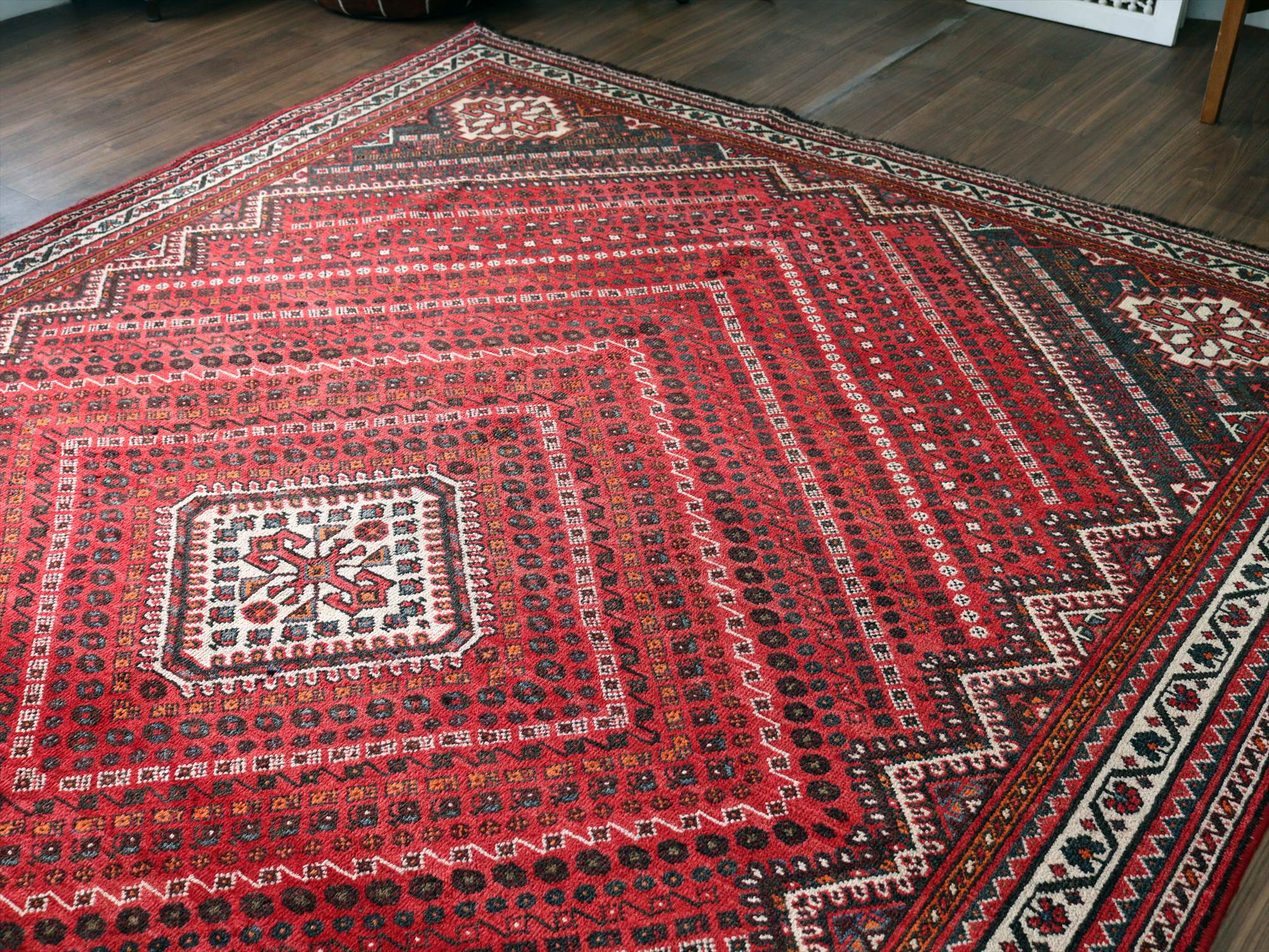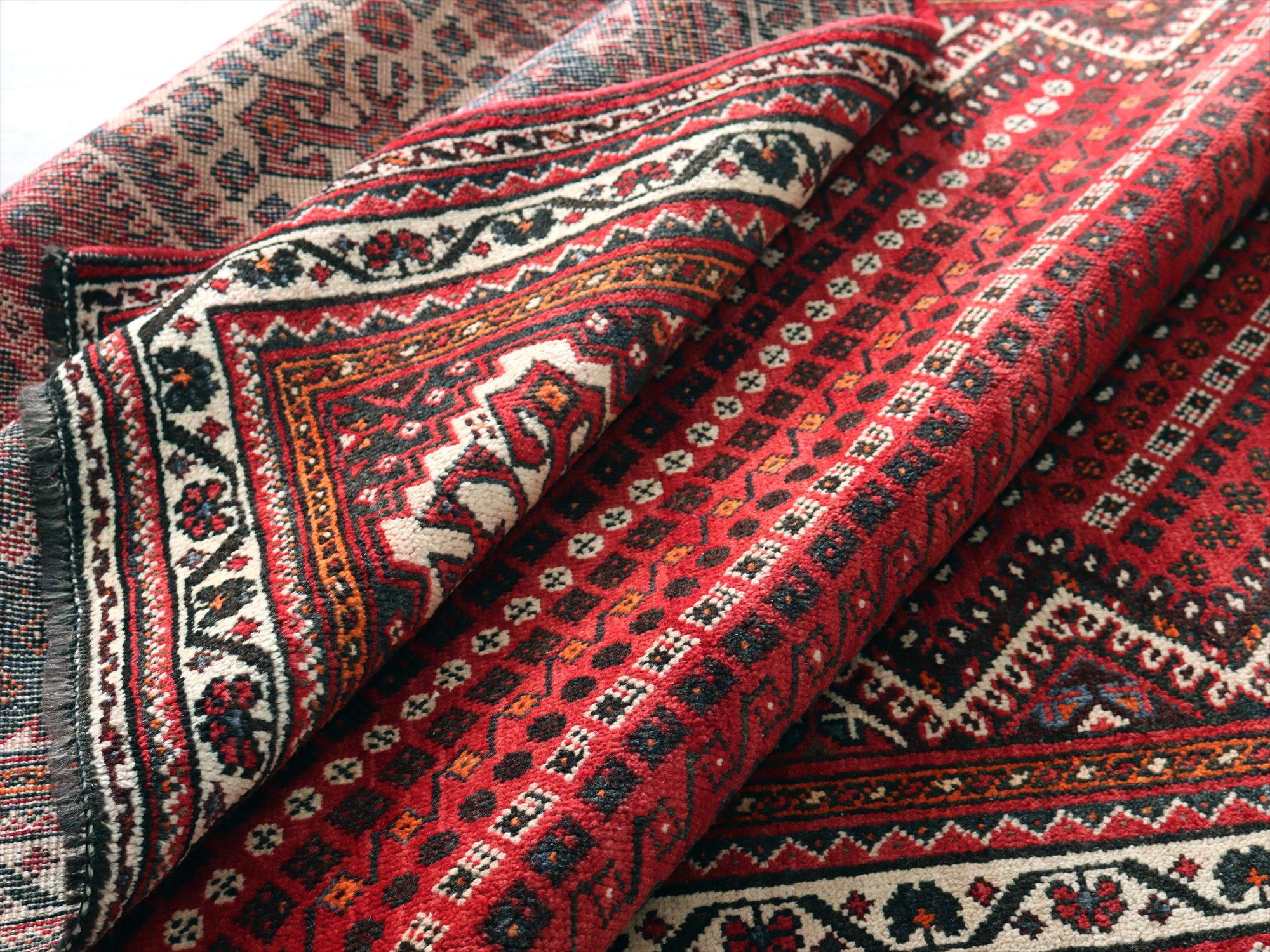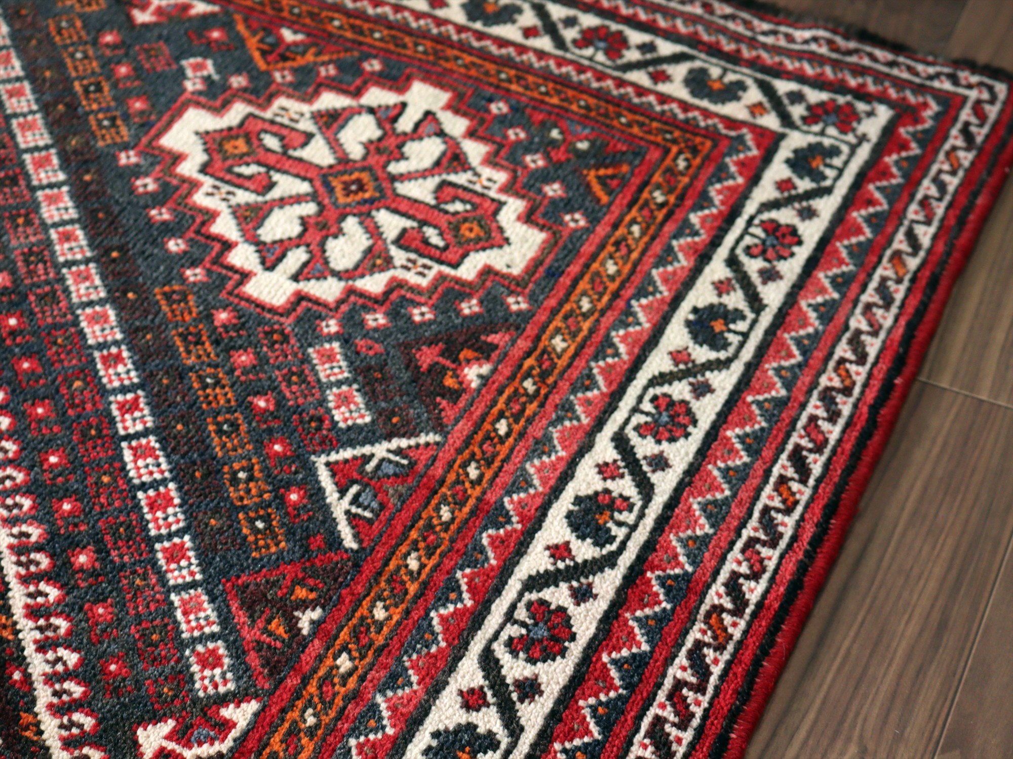 ベースを含めたラグの厚みは1cm弱で、毛足はすっきりとしていてモチーフがきれいに表現されています。また、縦糸にヤギの毛を使用していることから、当時商業用に織られたものではなく家庭で織られ丁寧に保管されていたものと推測できます。