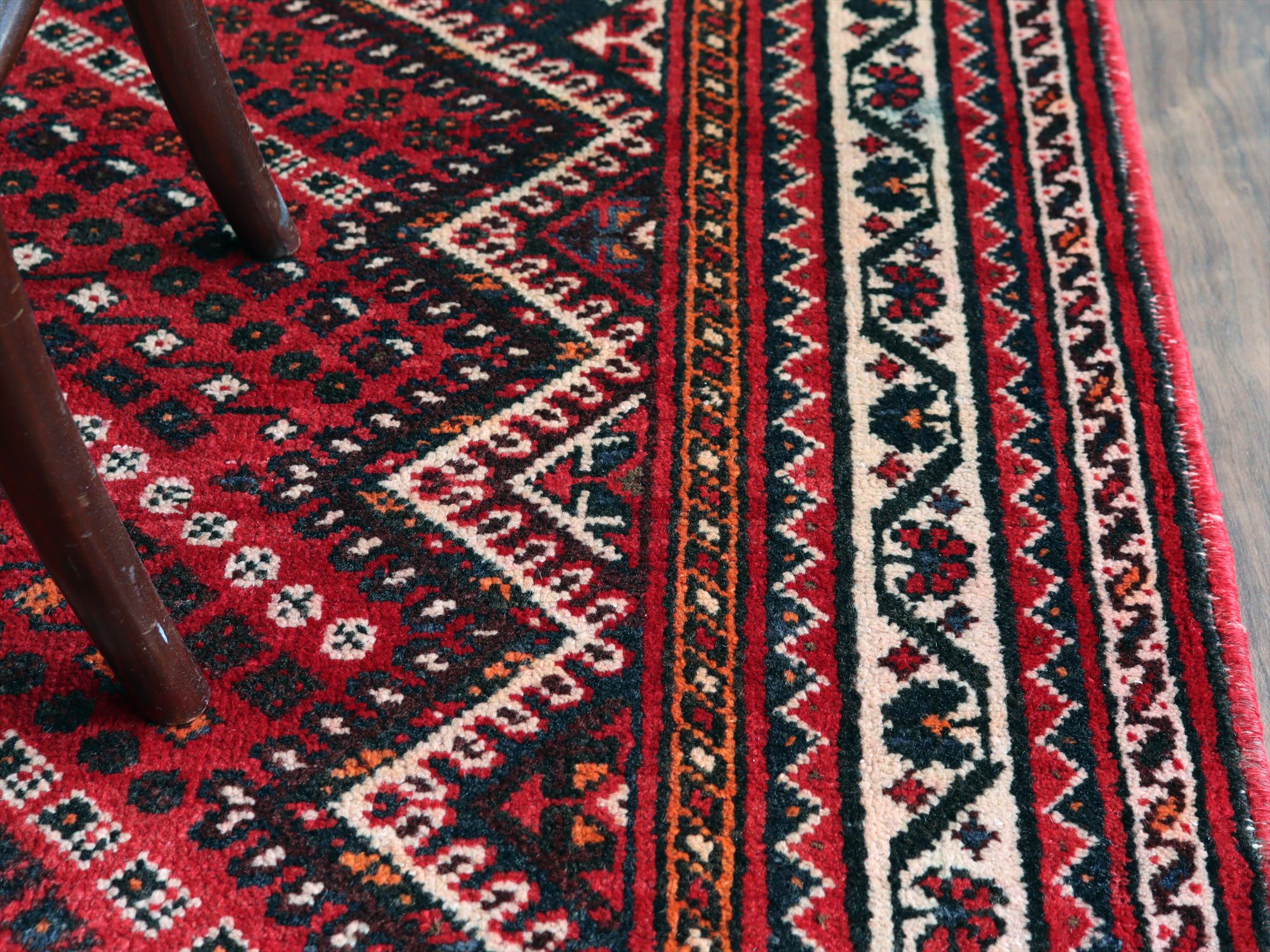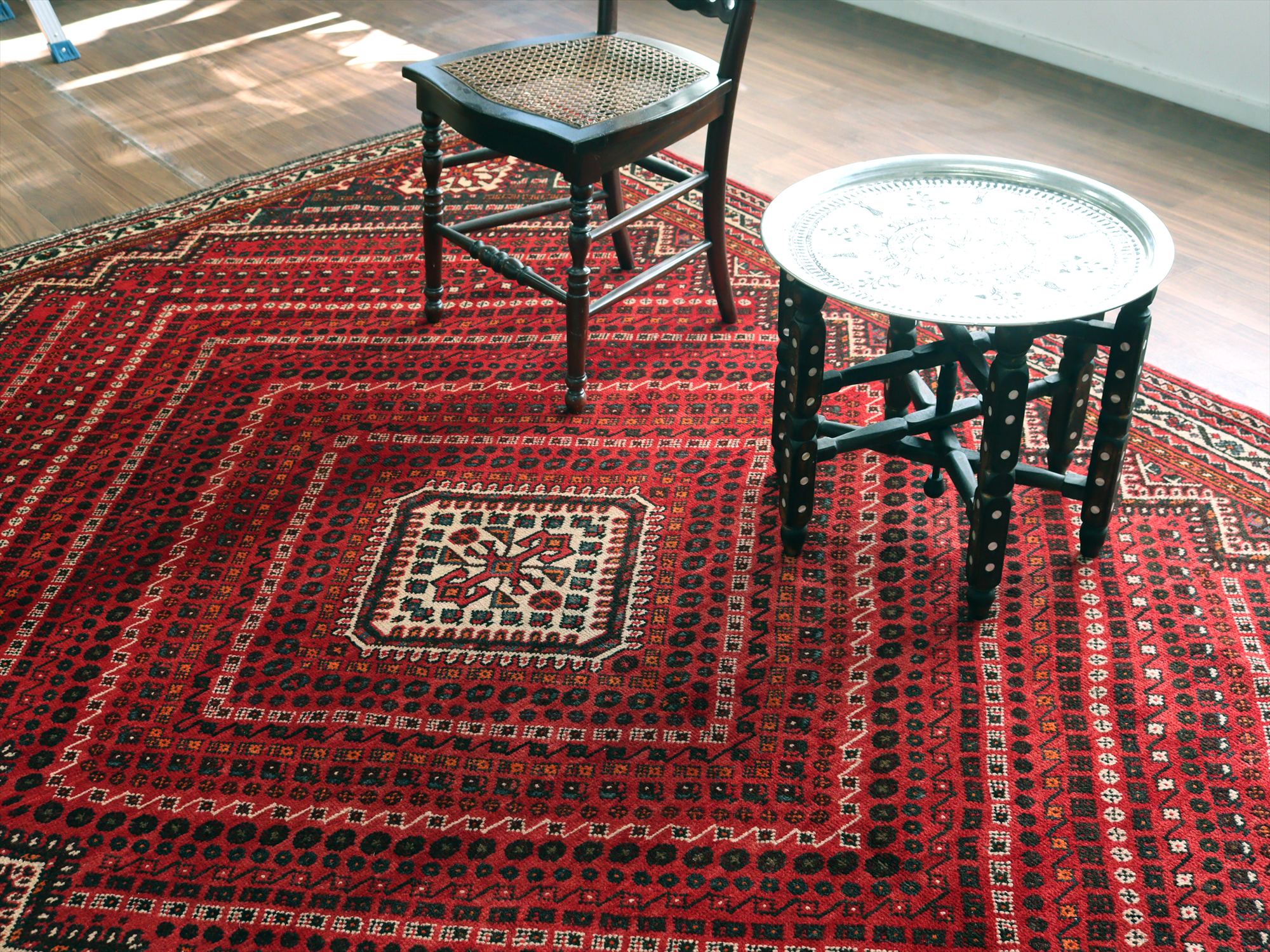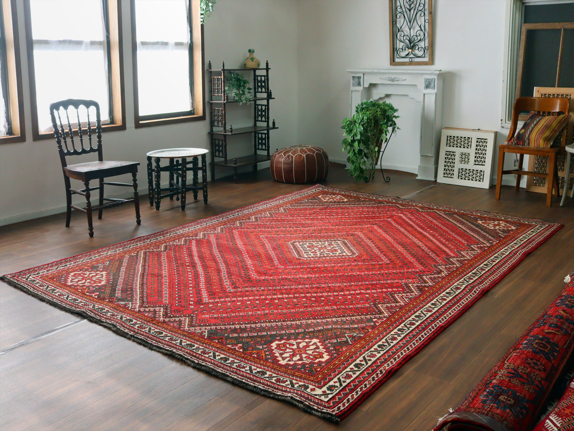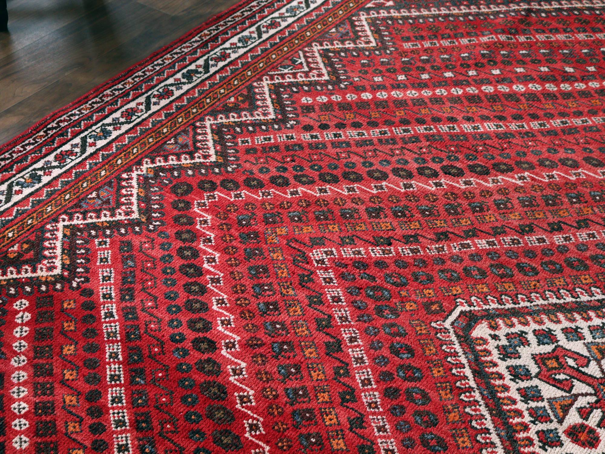 ベースを含めたラグの厚みは1cm弱で、毛足はすっきりとしていてモチーフがきれいに表現されています。また、縦糸にヤギの毛を使用していることから、当時商業用に織られたものではなく家庭で織られ丁寧に保管されていたものと推測できます。