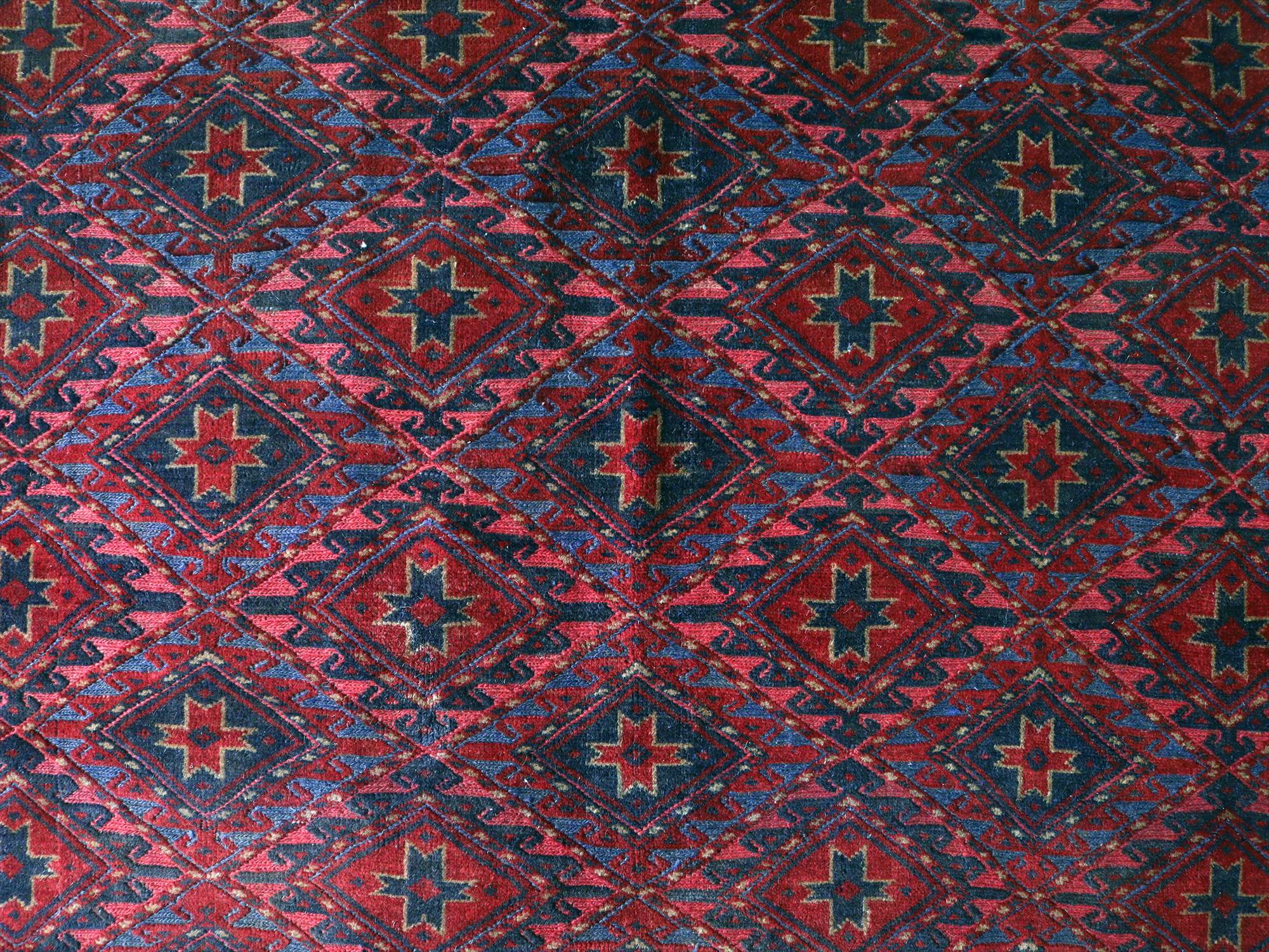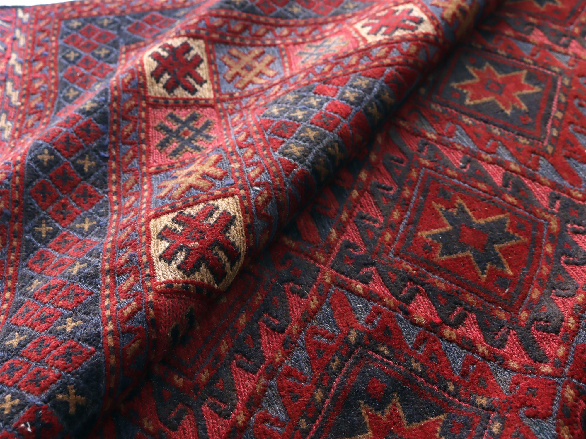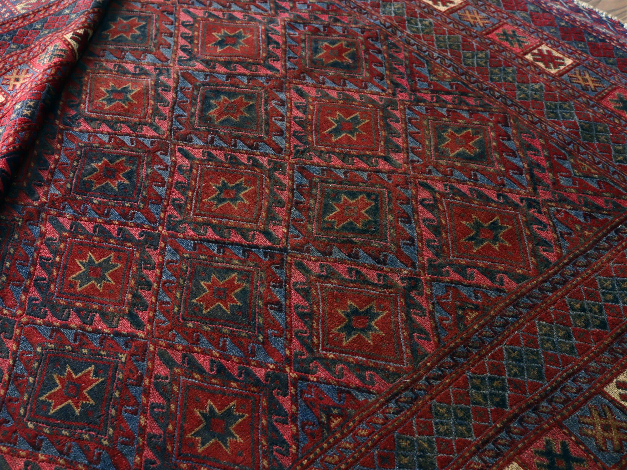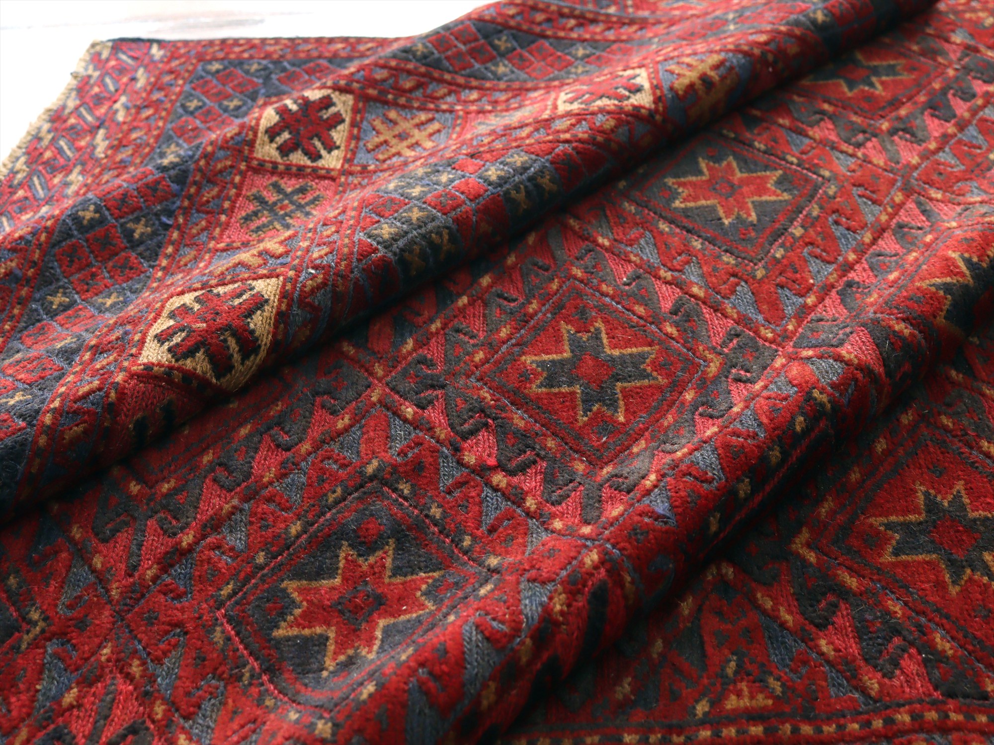 ベース地はスマック織りでしっかりとした織り地です。モチーフ部分はパイル(毛足)のある織りで、表面には立体感があります。