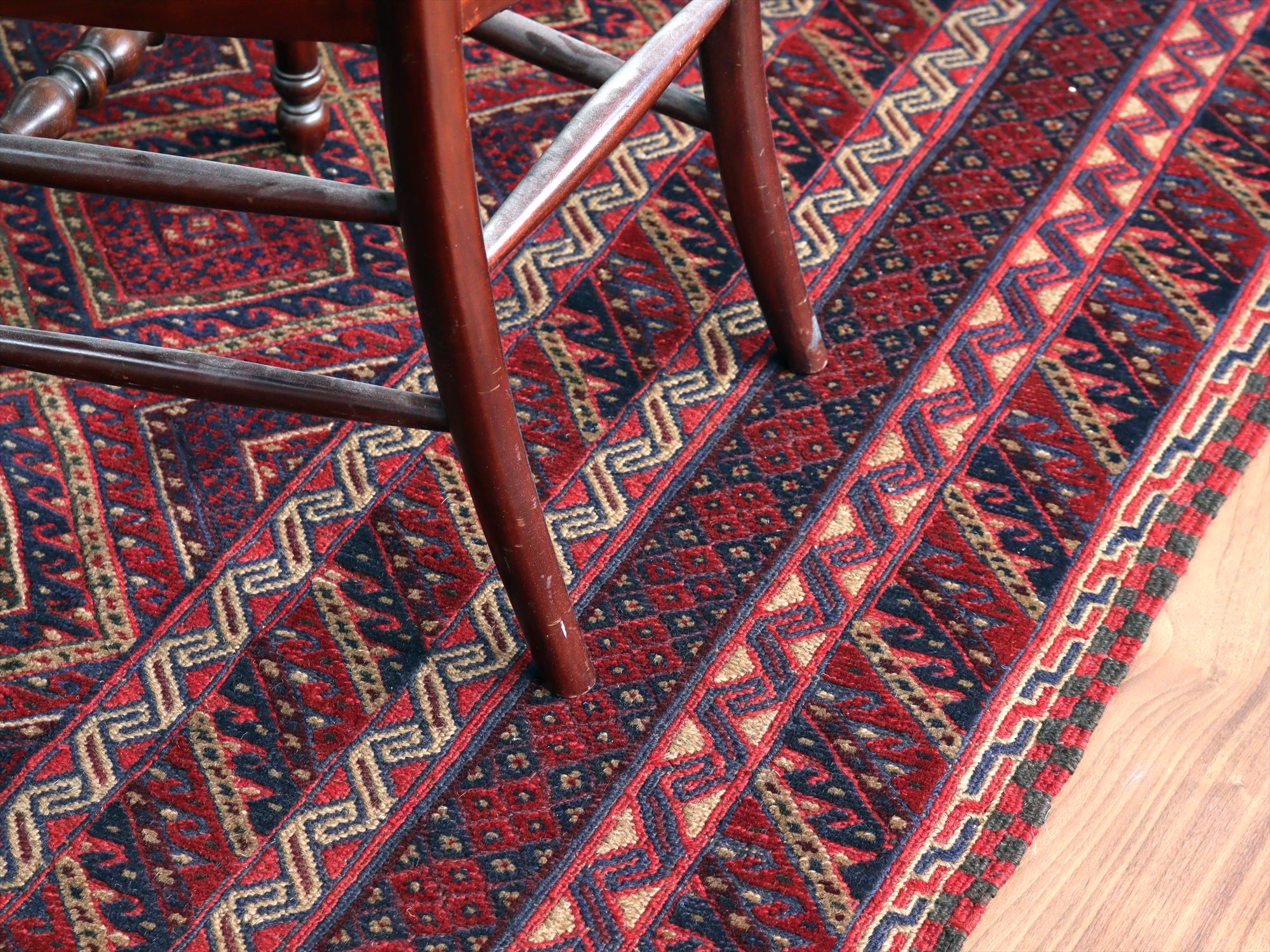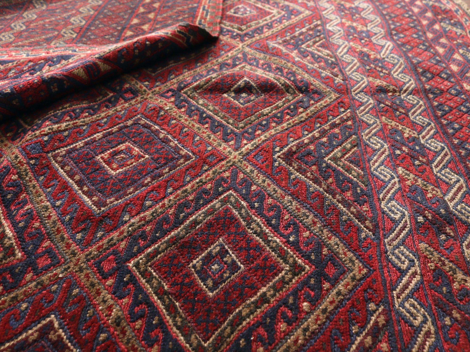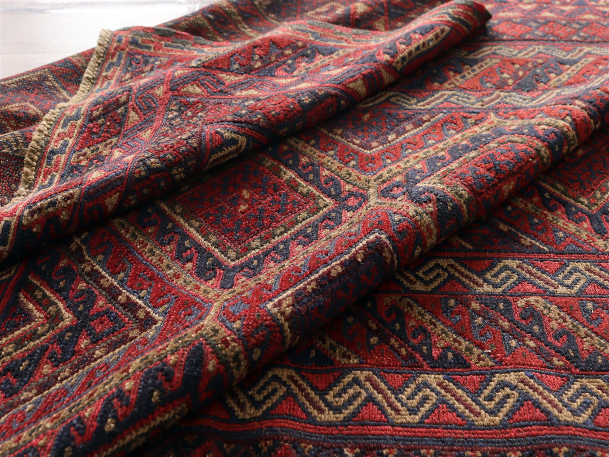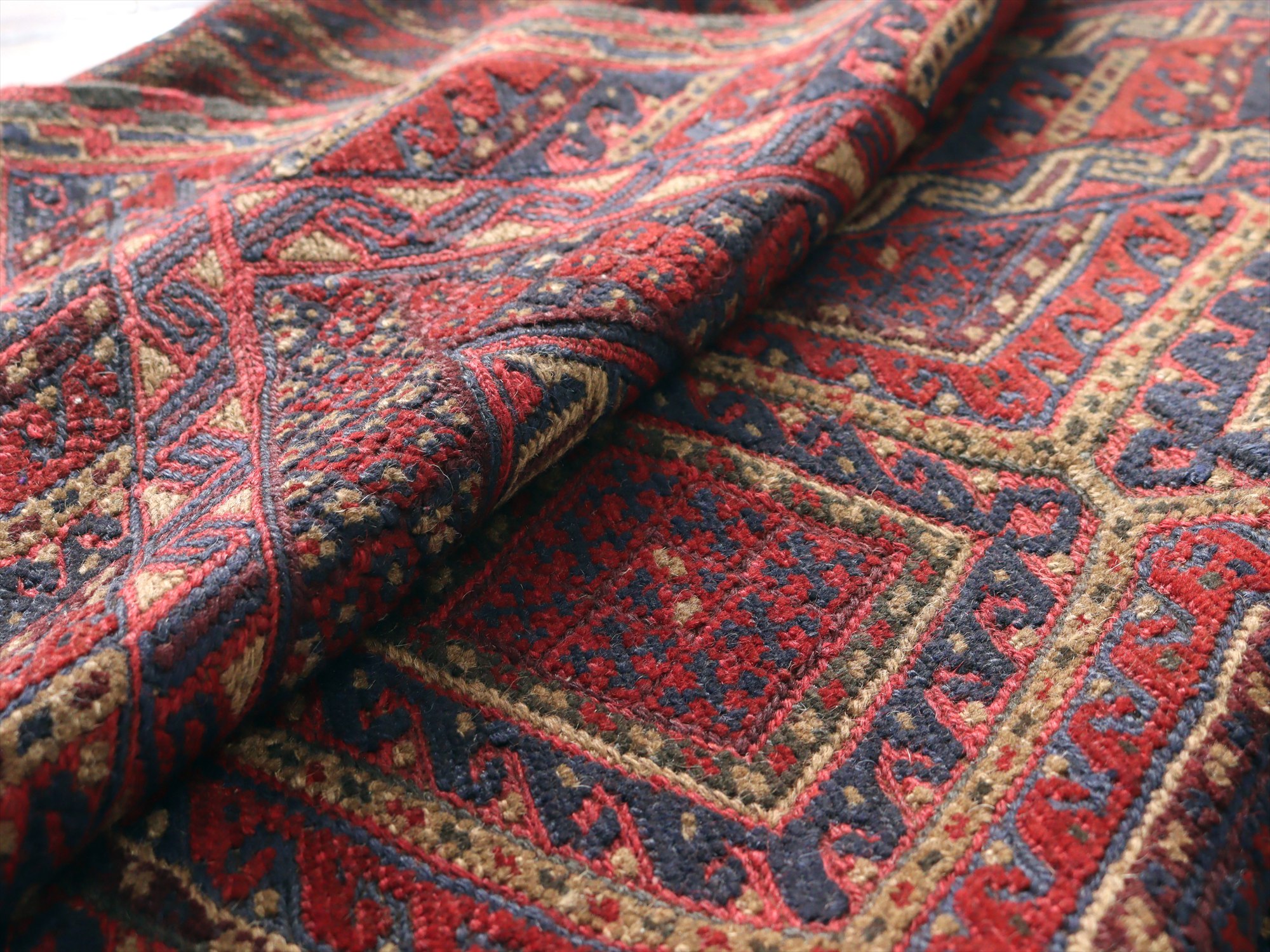 ベース地はスマック織りでしっかりとした織り地です。モチーフ部分はパイル(毛足)のある織りで、表面には立体感があります。