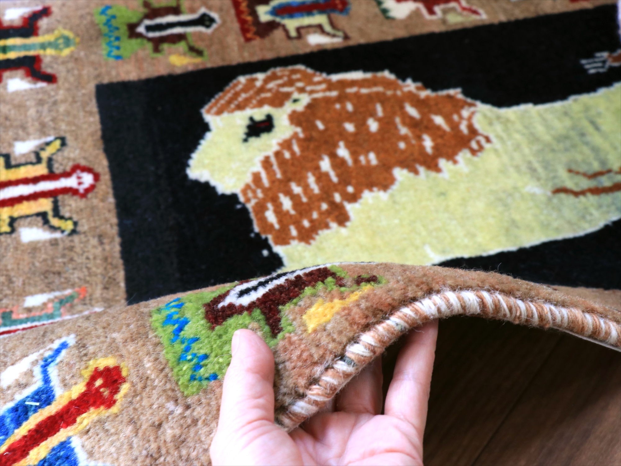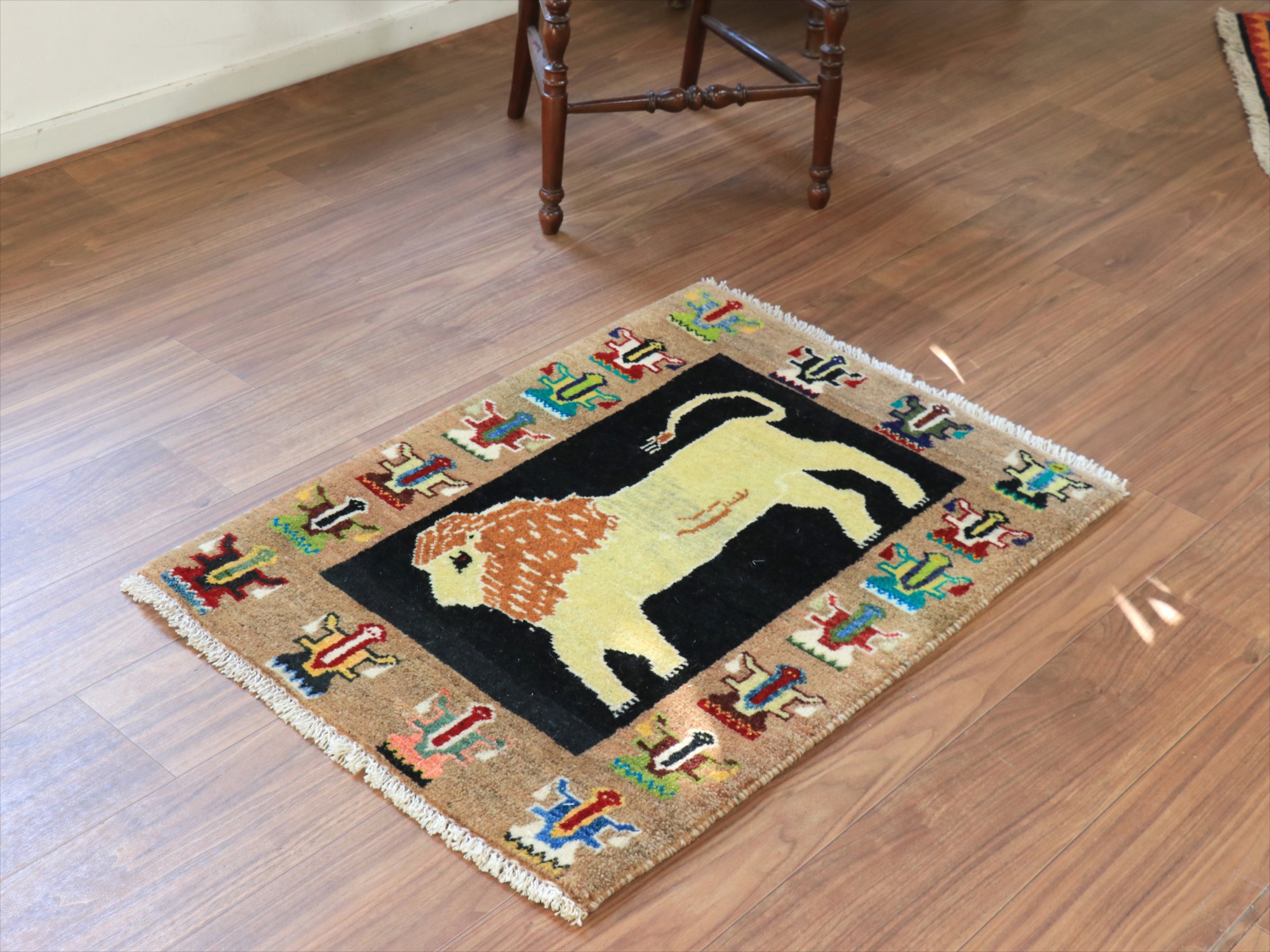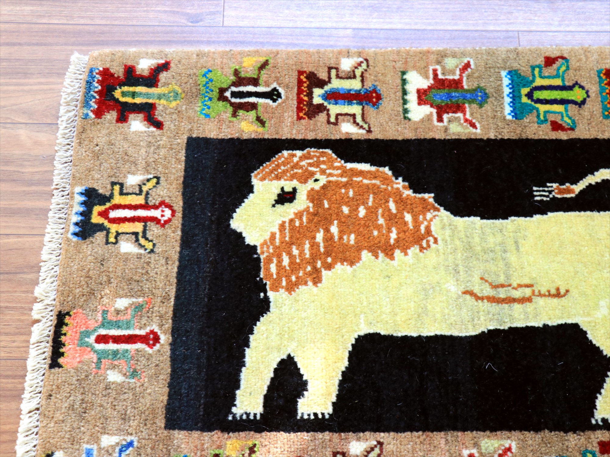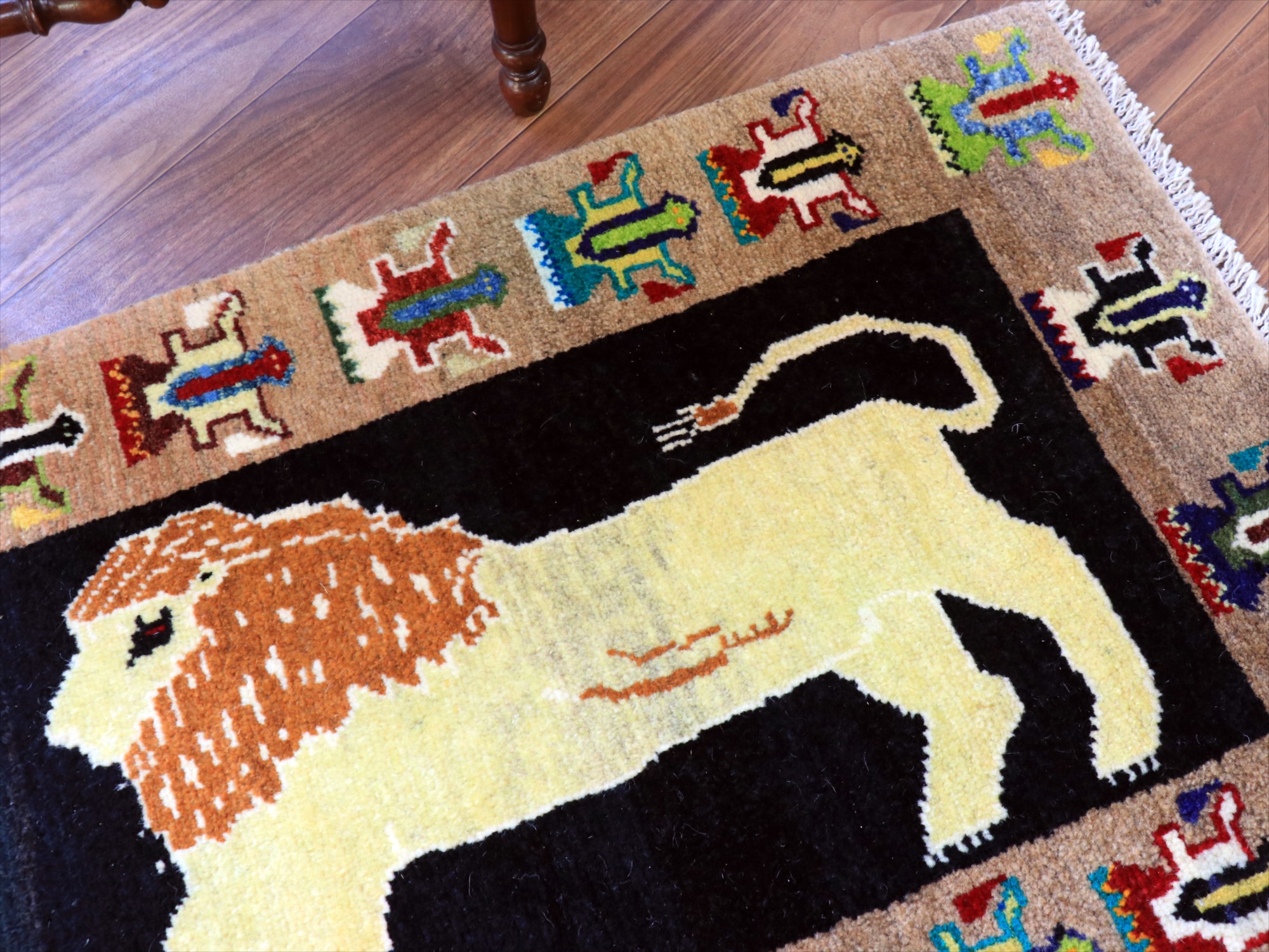 やさしいタッチのライオンギャッベ。黒をベースに、くっきりと描かれています。ユニークなのは、周囲のボーダーのデザインで、カシュカイ族の女性たちが両手にハンカチを持って、華やかな衣装で踊っている様子が織り込まれています。年代はさほど古いものではありませんが、何かの記念に織られたラグと思われます。