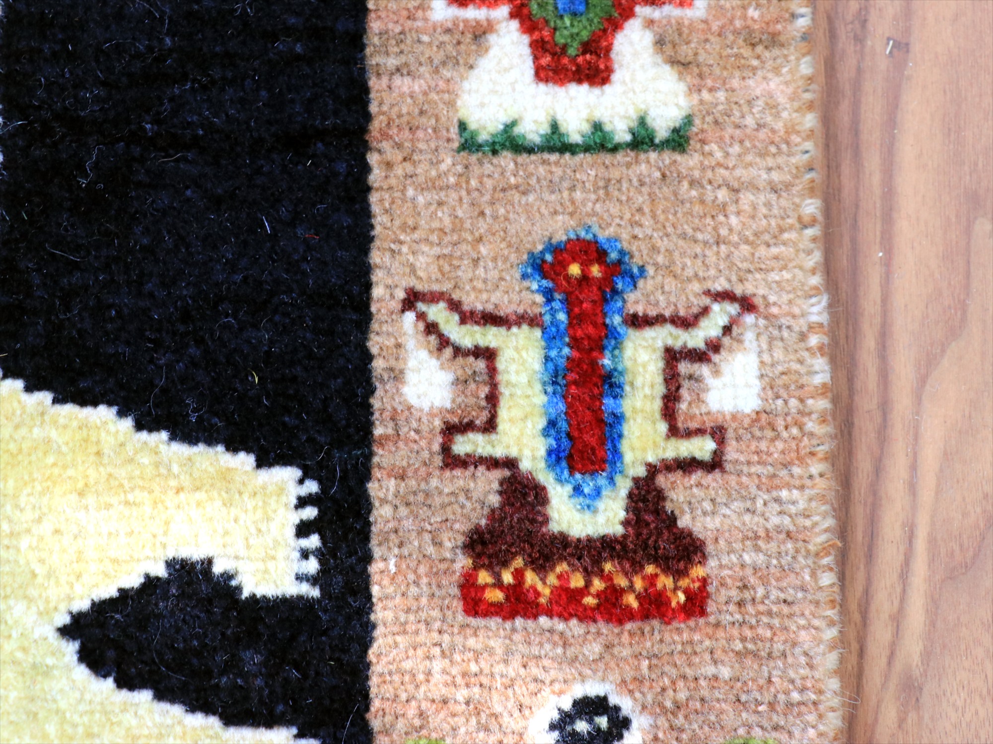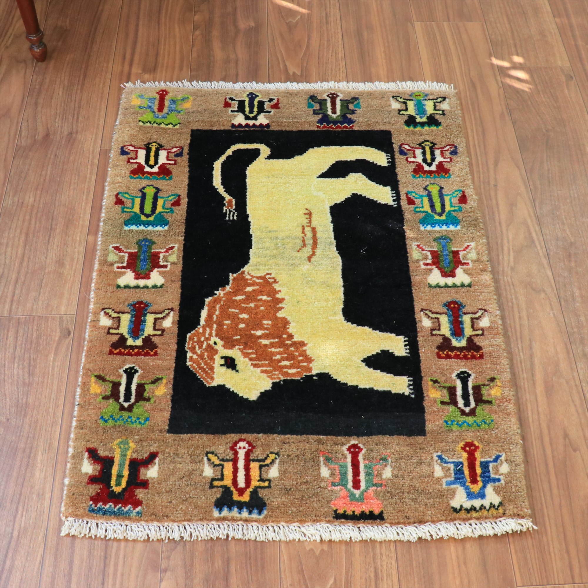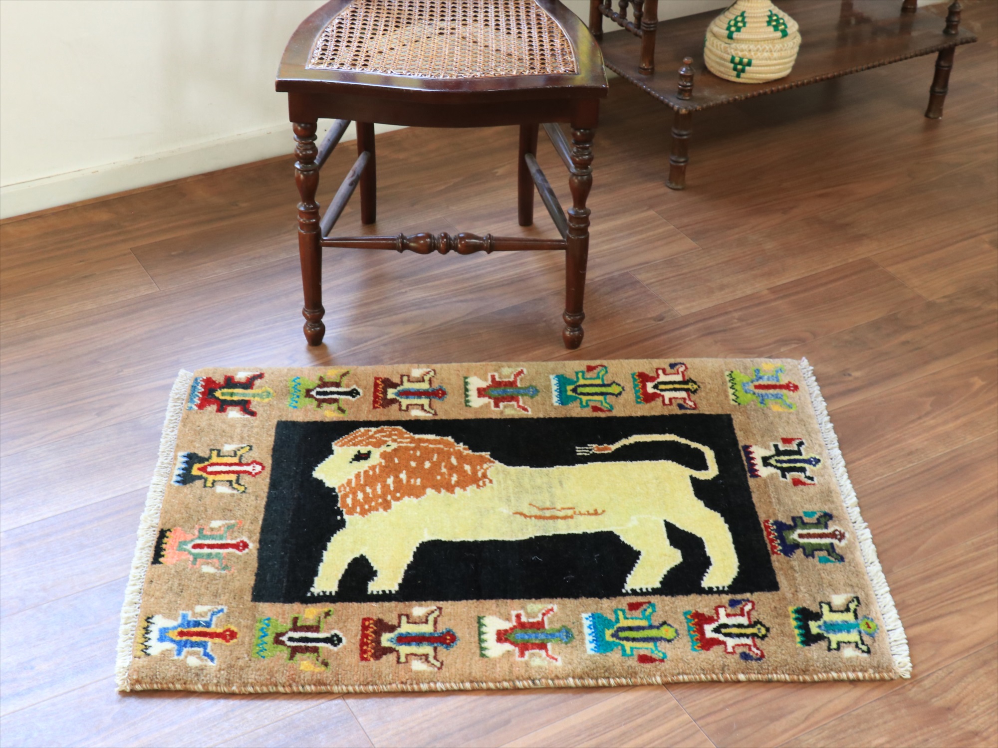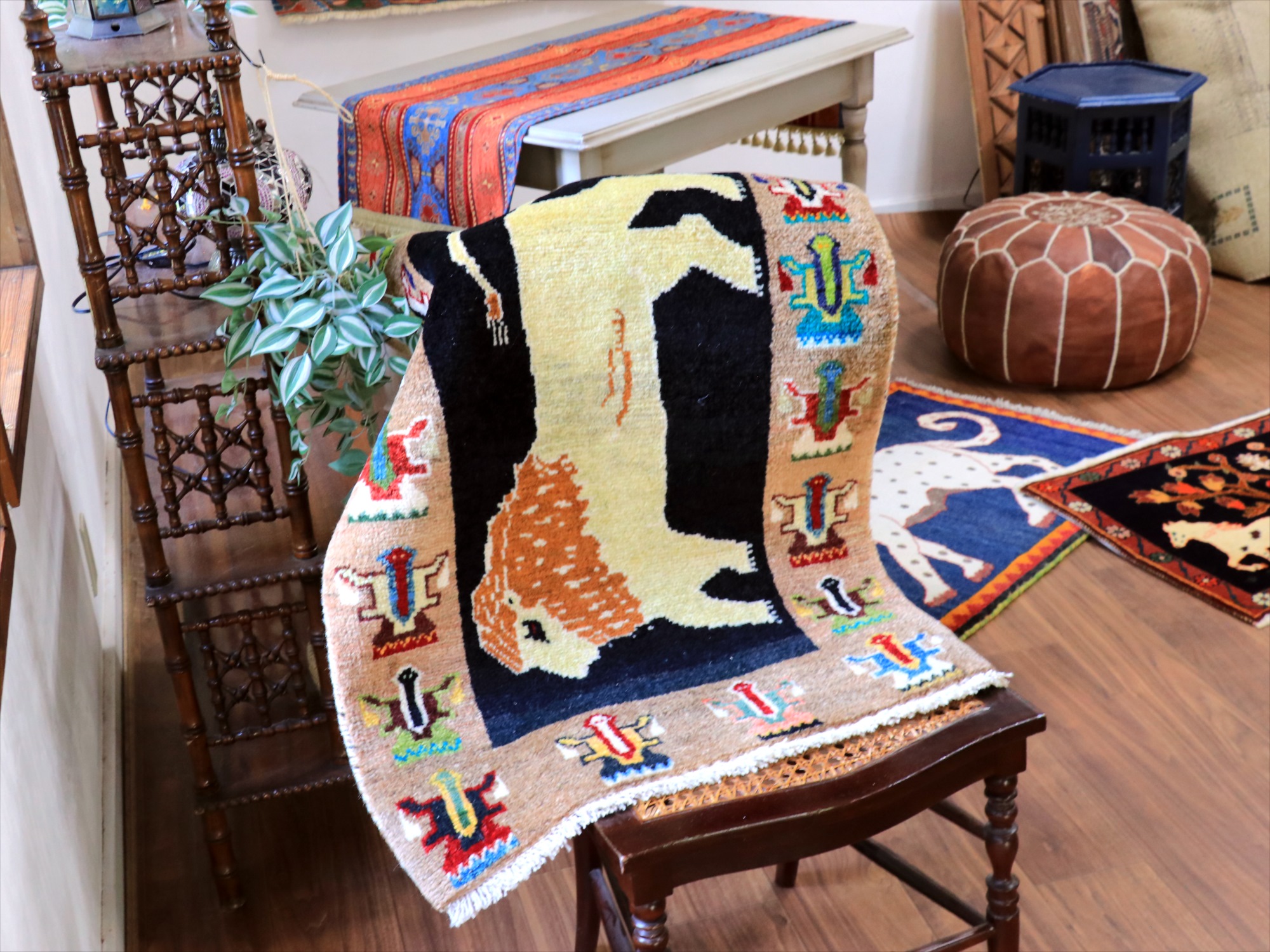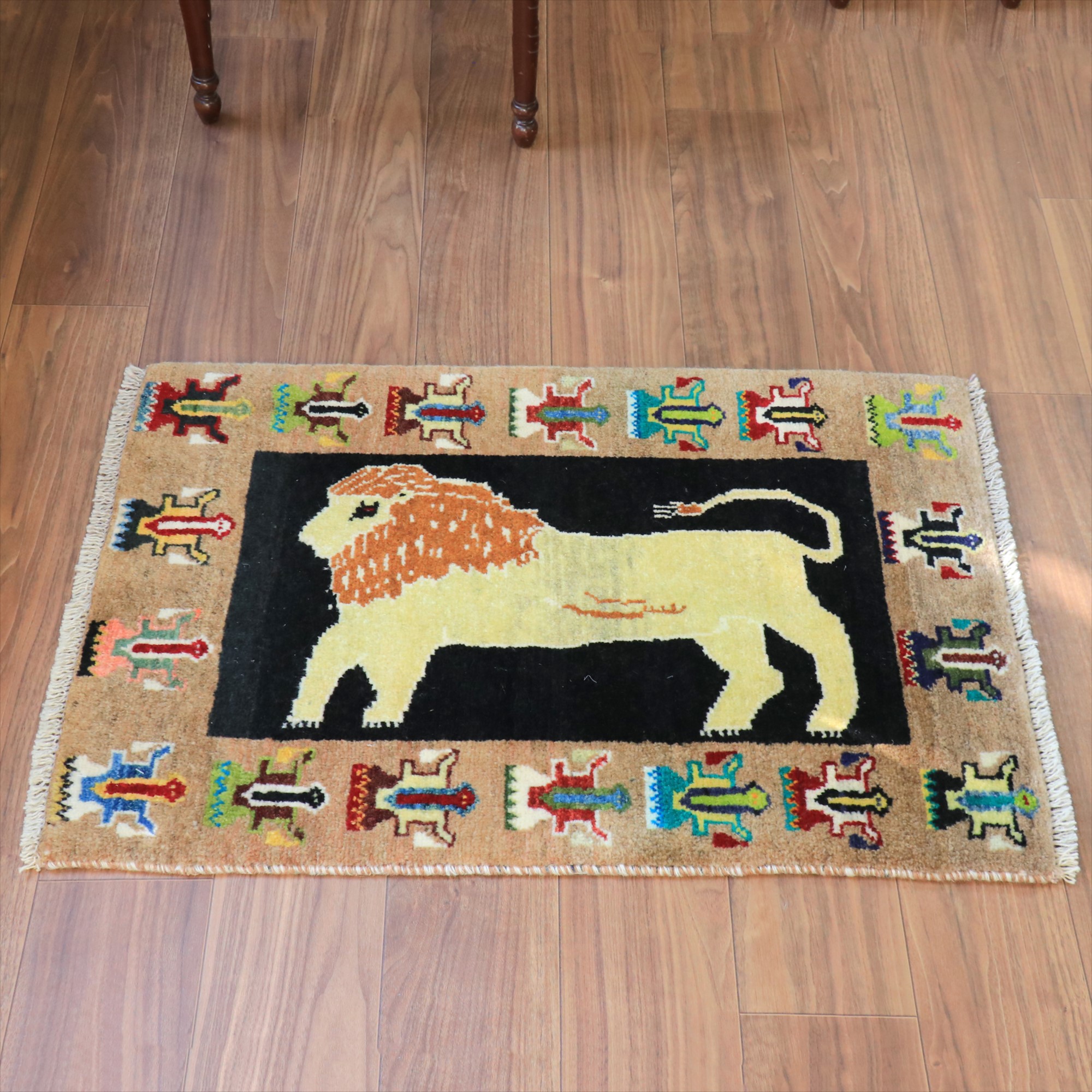 やさしいタッチのライオンギャッベ。黒をベースに、くっきりと描かれています。ユニークなのは、周囲のボーダーのデザインで、カシュカイ族の女性たちが両手にハンカチを持って、華やかな衣装で踊っている様子が織り込まれています。年代はさほど古いものではありませんが、何かの記念に織られたラグと思われます。