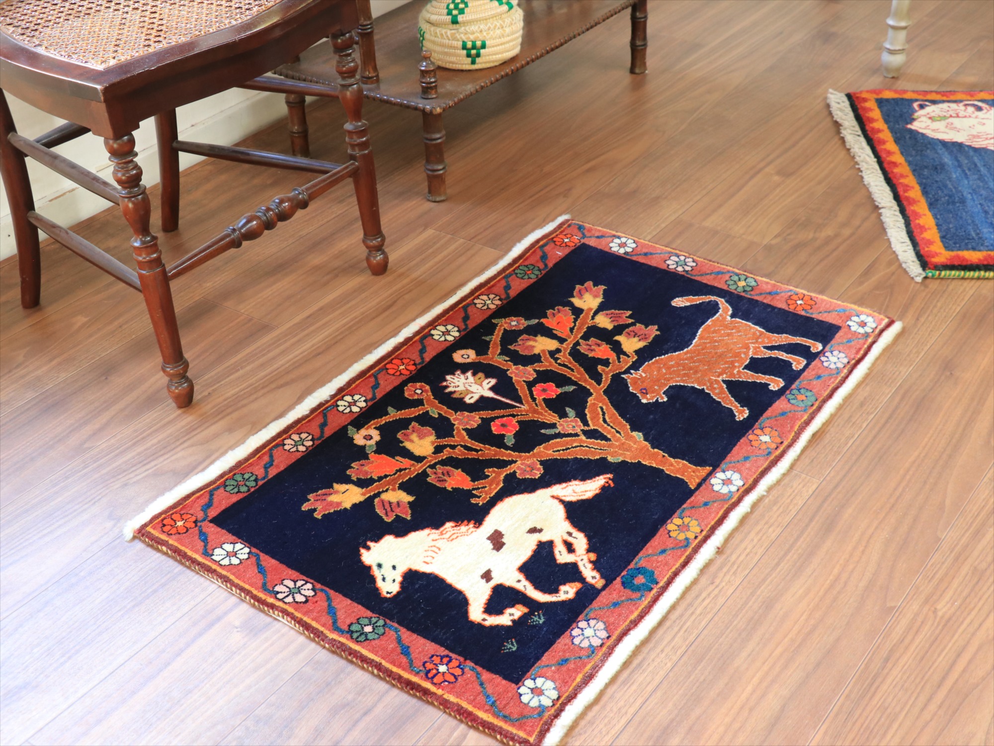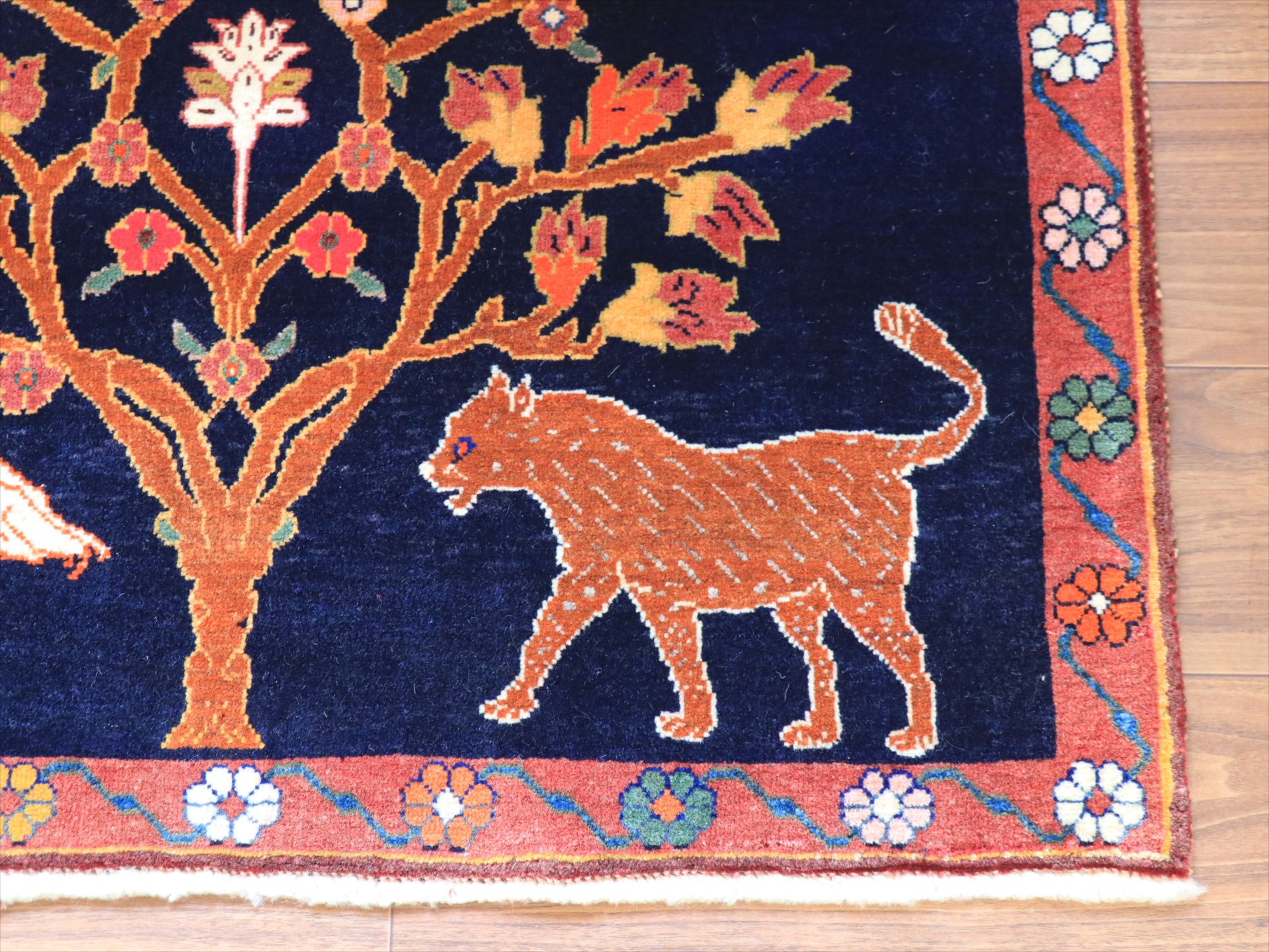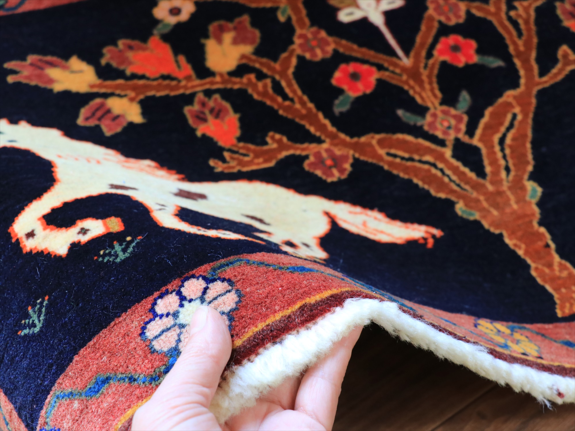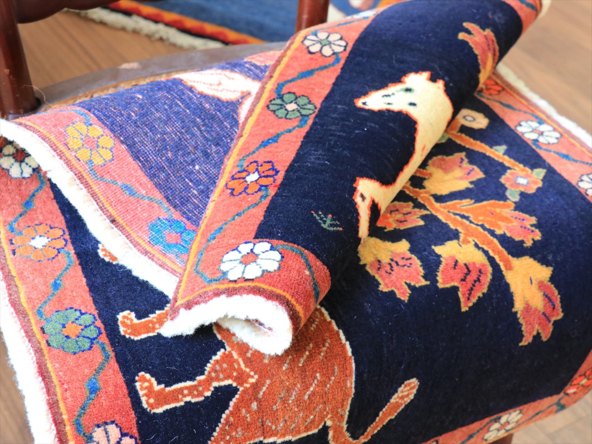 パイルを含めたラグの厚みは1cm強で、細かな織り。形に少しゆがみがあり、正面から見て左下の角が少し下に伸びています。