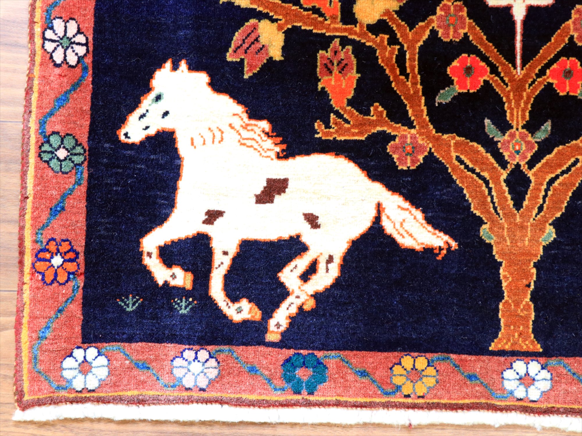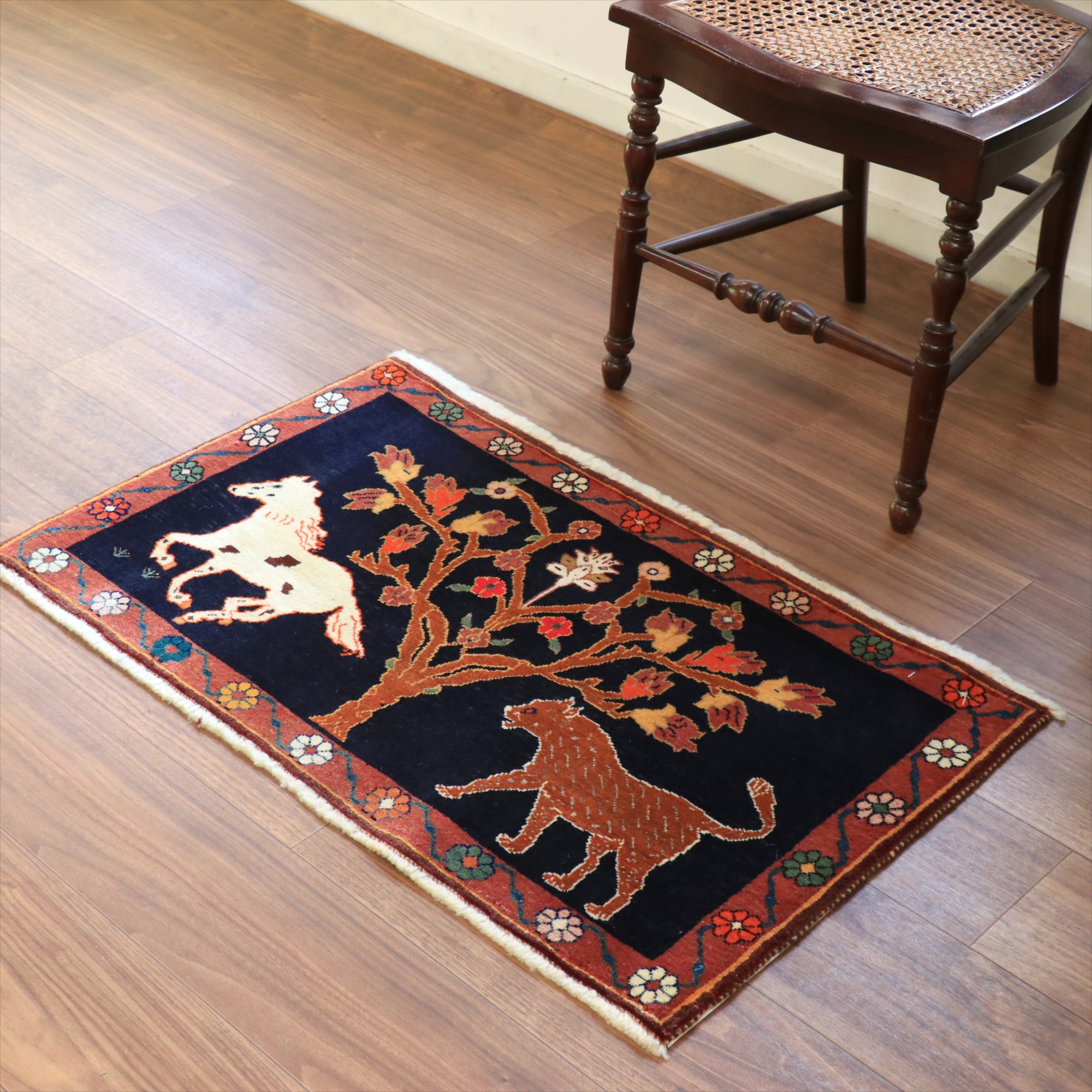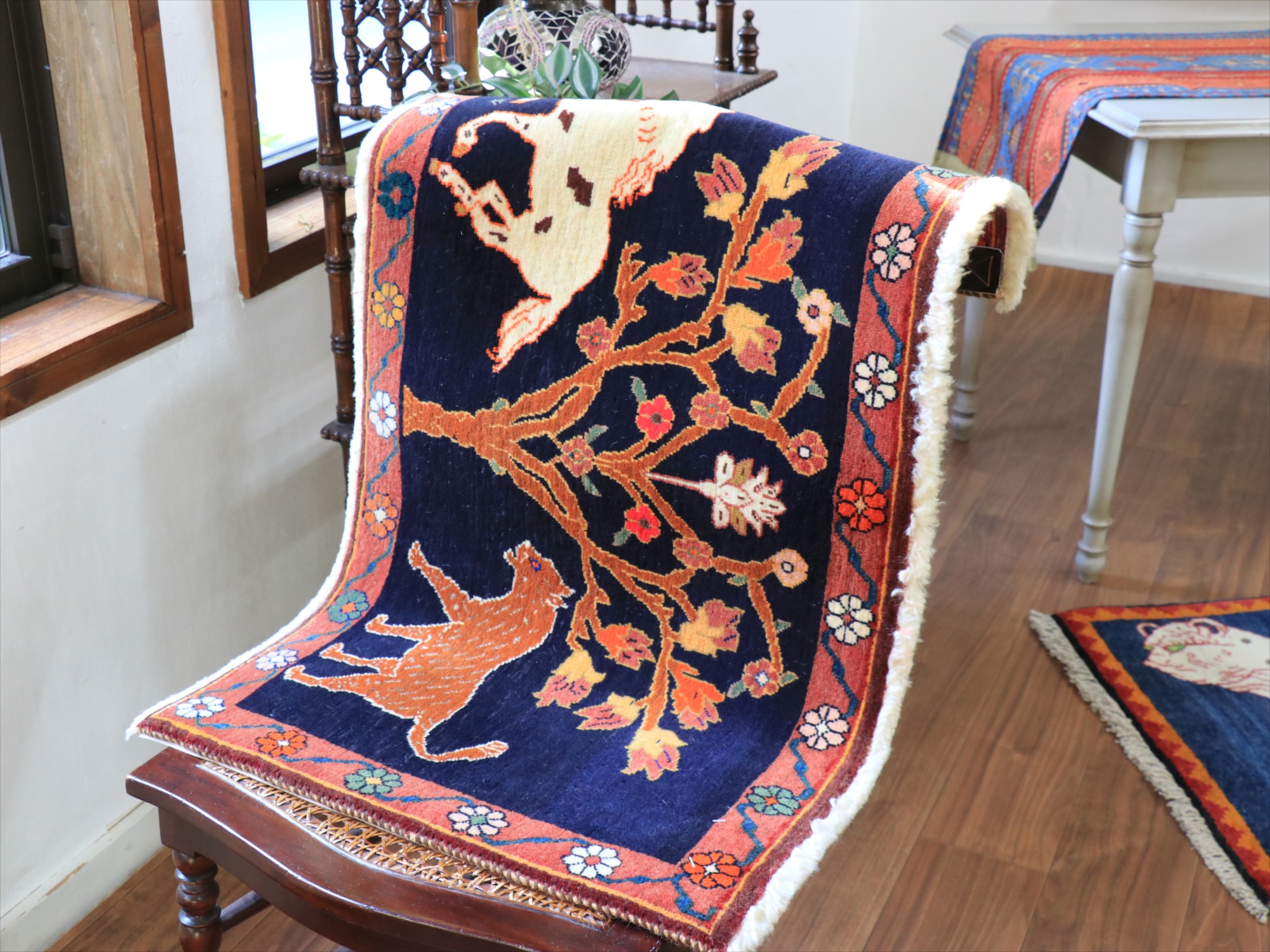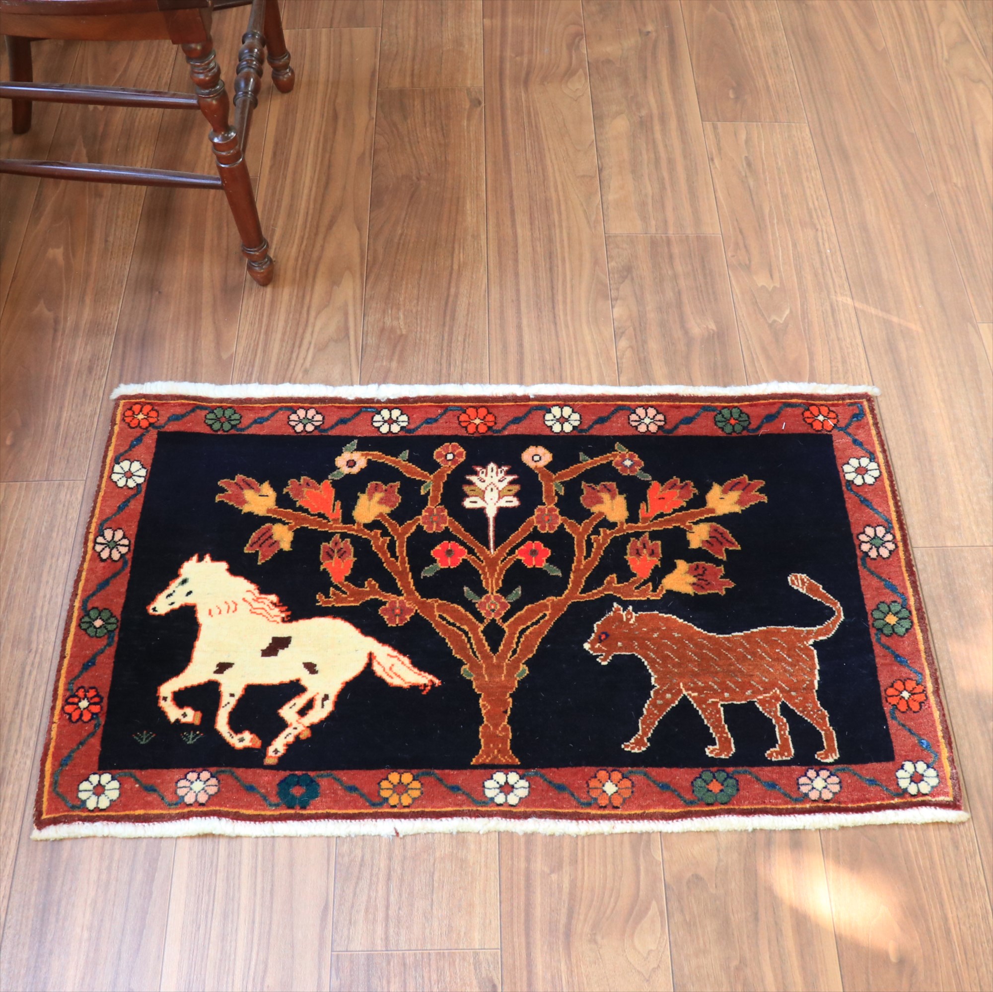 パイルを含めたラグの厚みは1cm強で、細かな織り。形に少しゆがみがあり、正面から見て左下の角が少し下に伸びています。