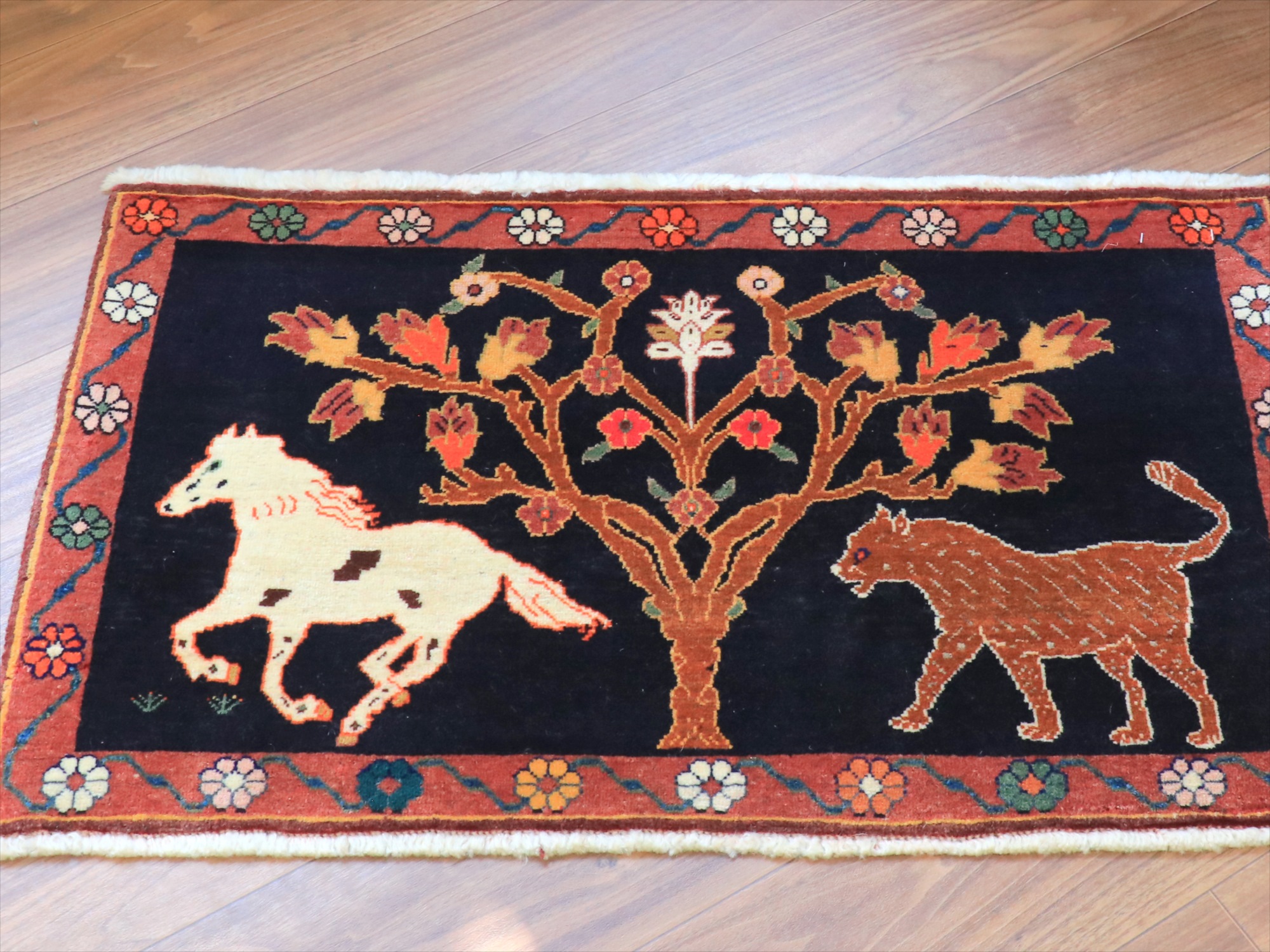 横長のサイズが珍しいデザイン。軽やかに走る馬と、それを追うライオンと言った構図でしょうか。黒っぽく見えるベースは紺色です。