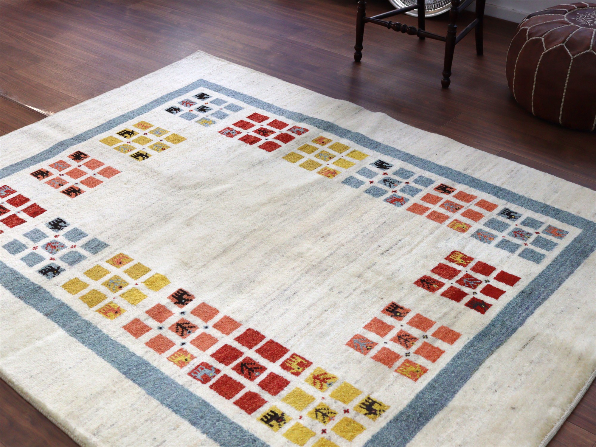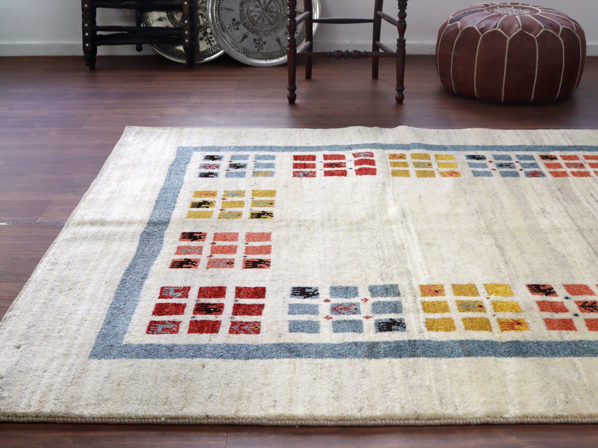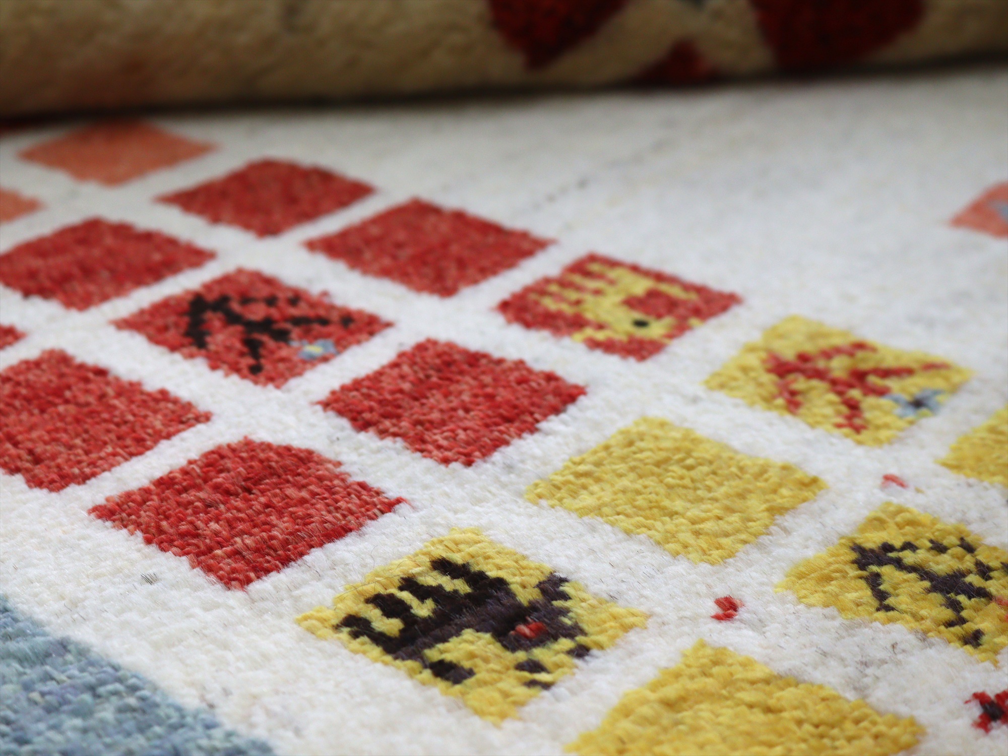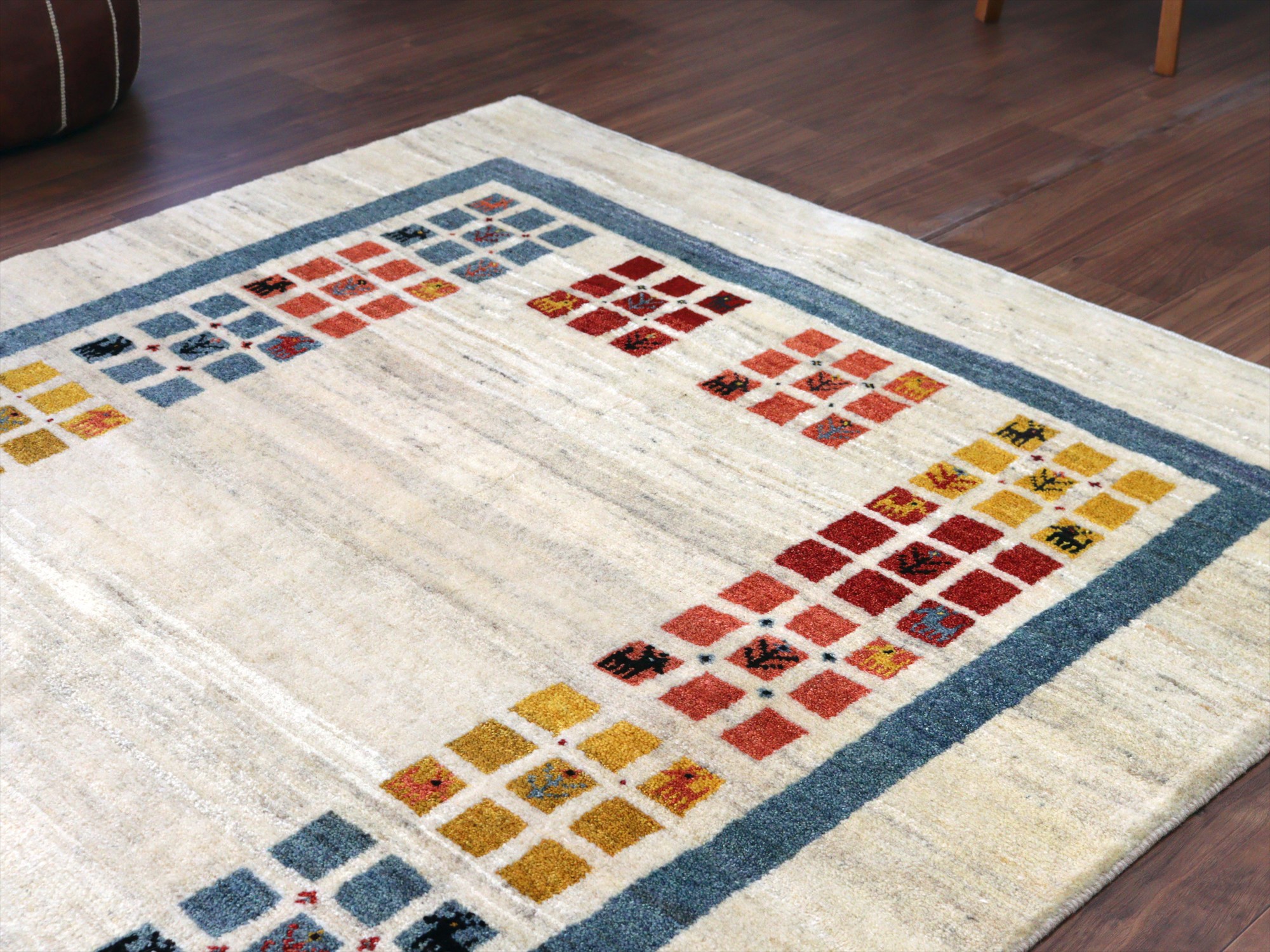 染めていない羊毛のフィールドにブルーグレーのフレーム、その内側にはレッド、イエロー、ブルーの小さなモチーフの織られたタイルが並び、それらが全体を通して、まるでモザイクタイルを成しているかと思わせるような美しいデザイン。