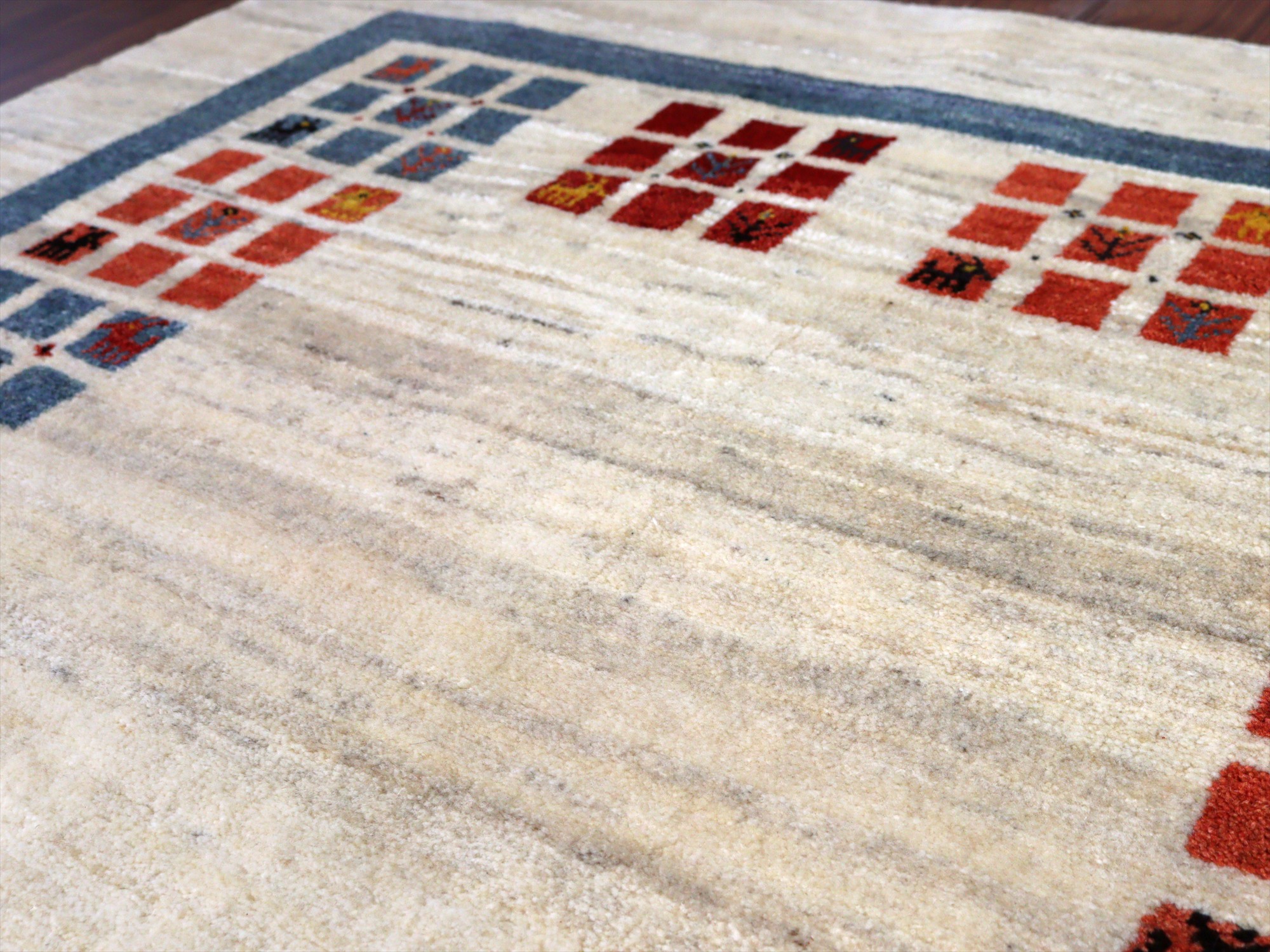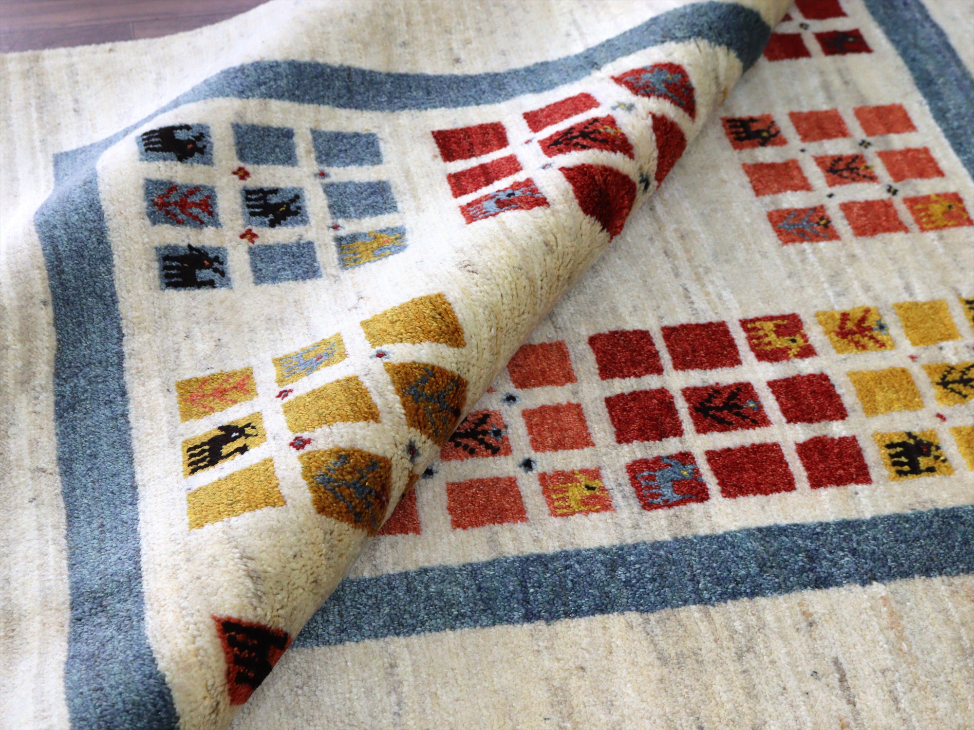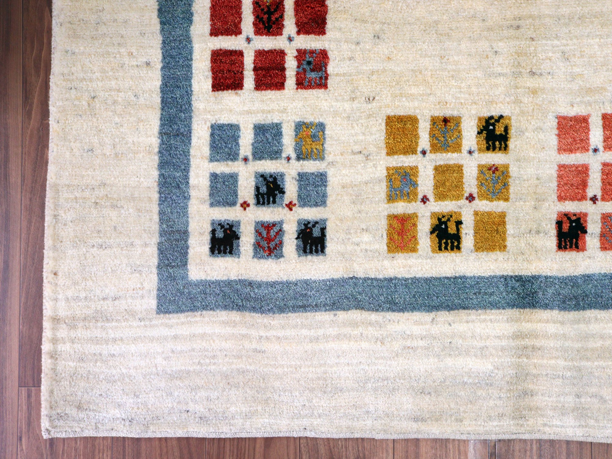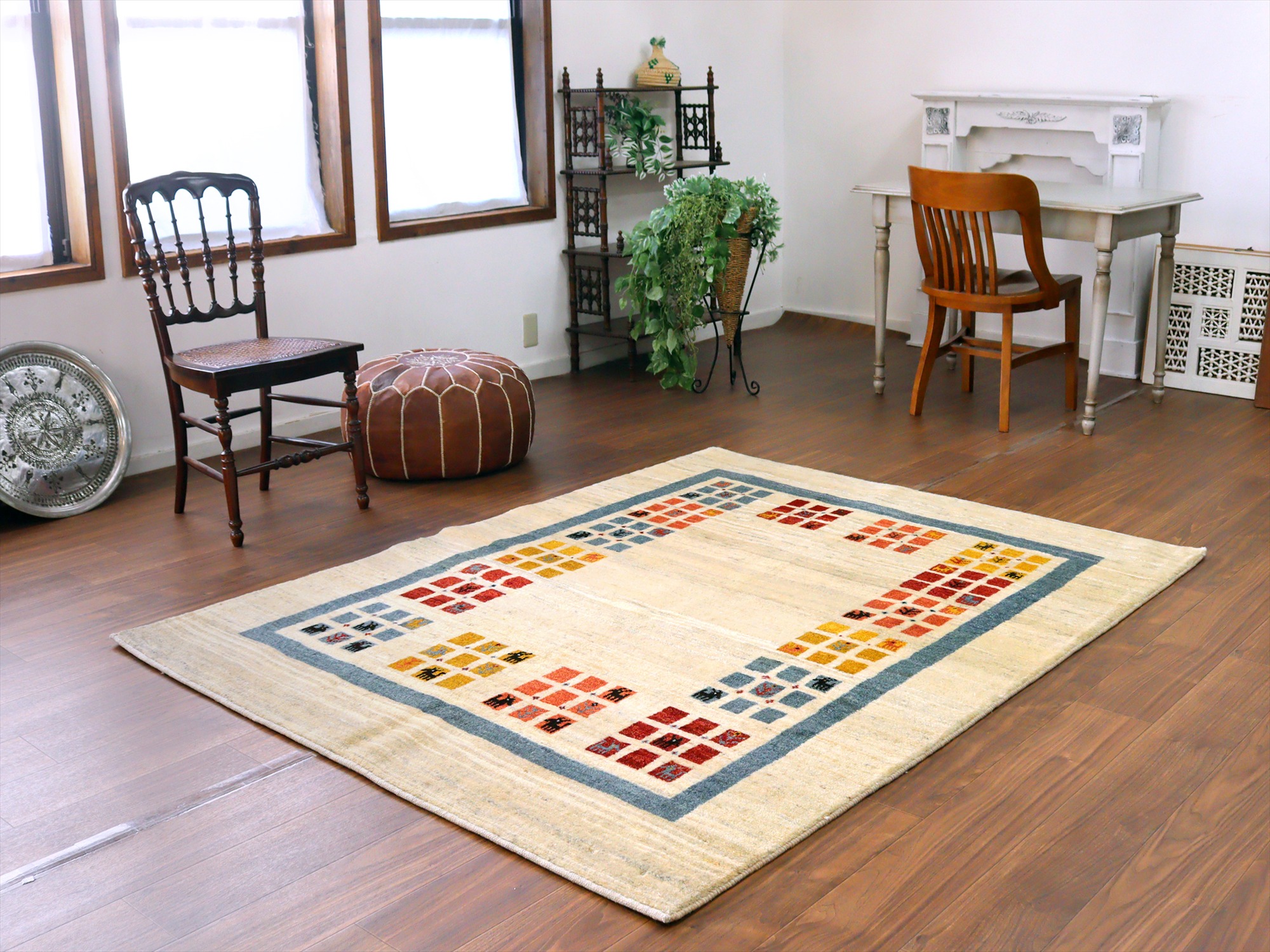 染めていない羊毛のフィールドにブルーグレーのフレーム、その内側にはレッド、イエロー、ブルーの小さなモチーフの織られたタイルが並び、それらが全体を通して、まるでモザイクタイルを成しているかと思わせるような美しいデザイン。