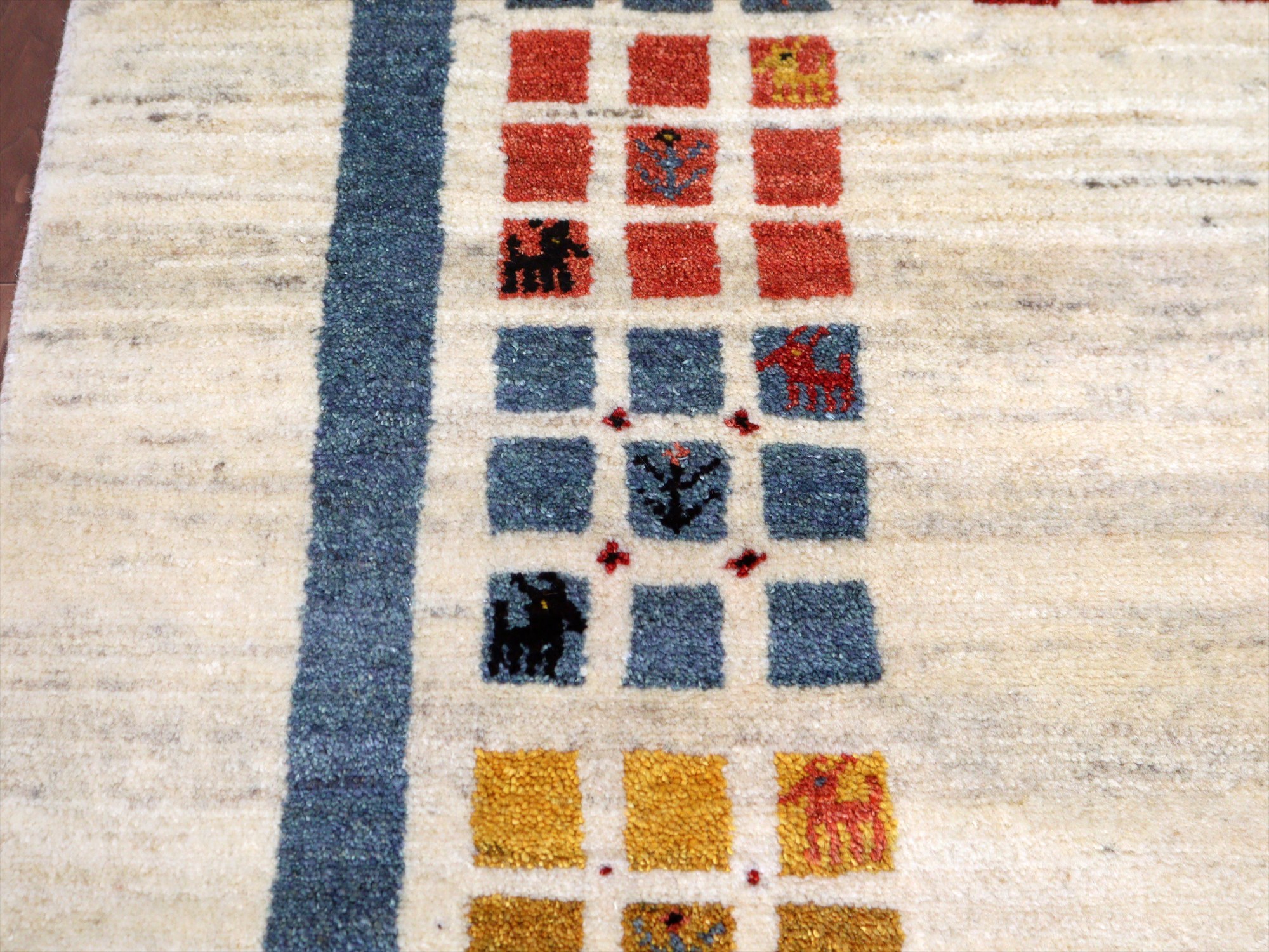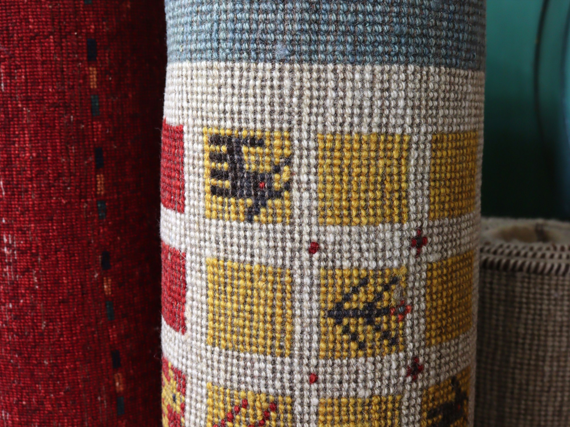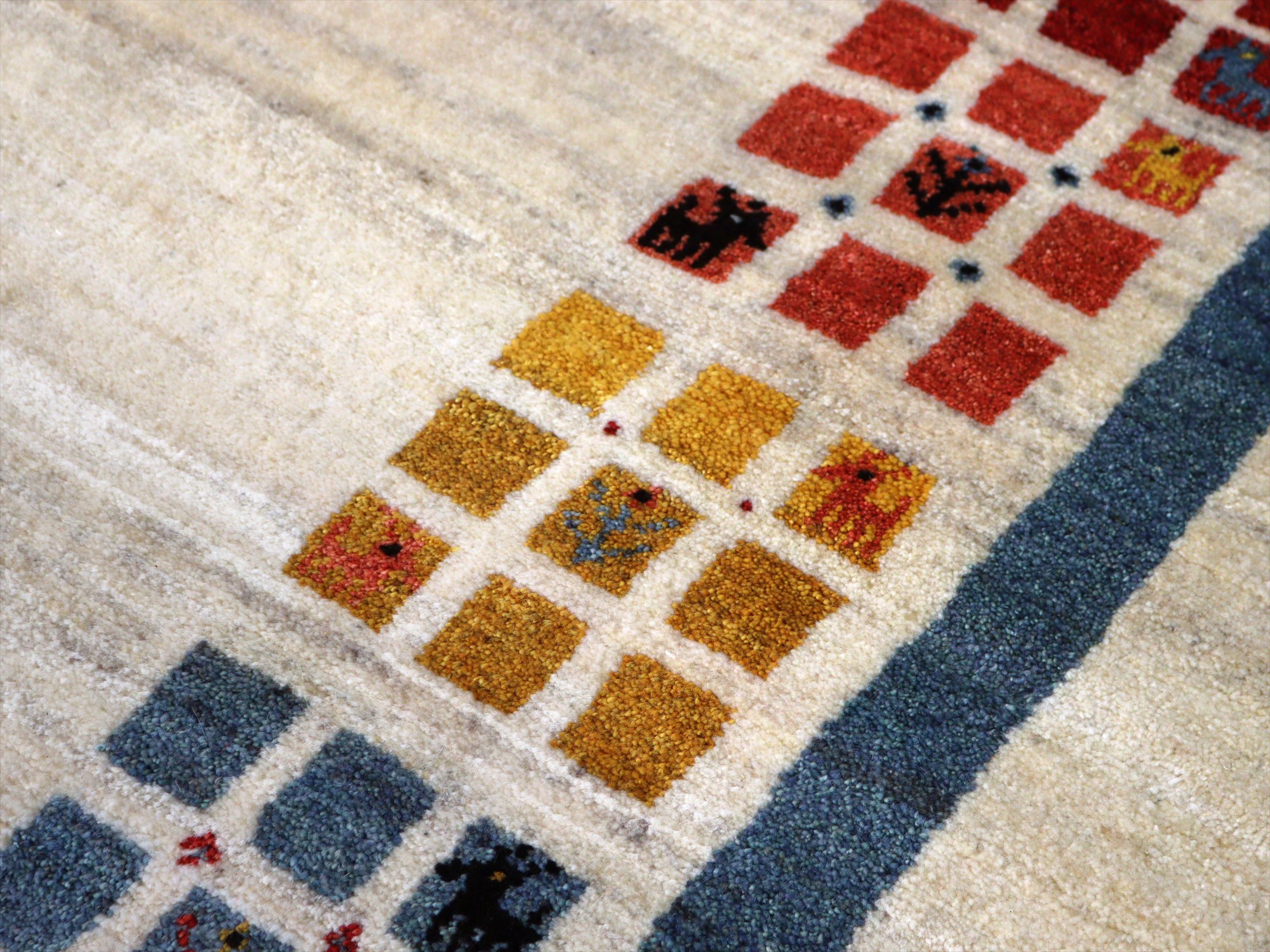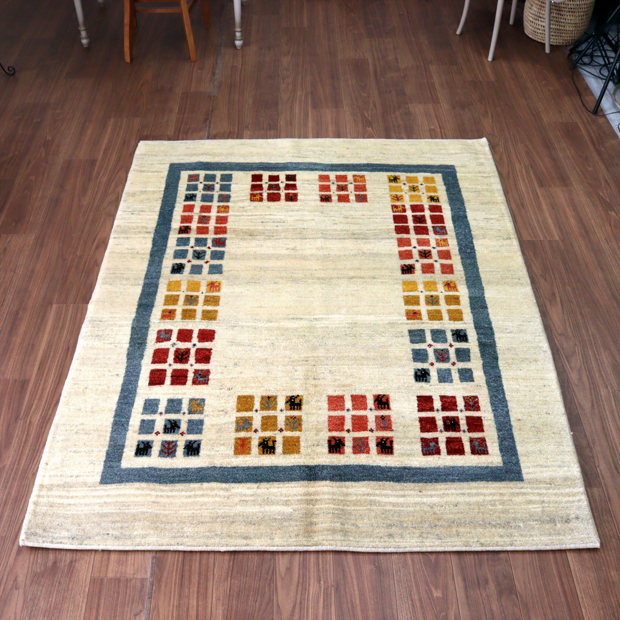 染めていない羊毛のフィールドにブルーグレーのフレーム、その内側にはレッド、イエロー、ブルーの小さなモチーフの織られたタイルが並び、それらが全体を通して、まるでモザイクタイルを成しているかと思わせるような美しいデザイン。