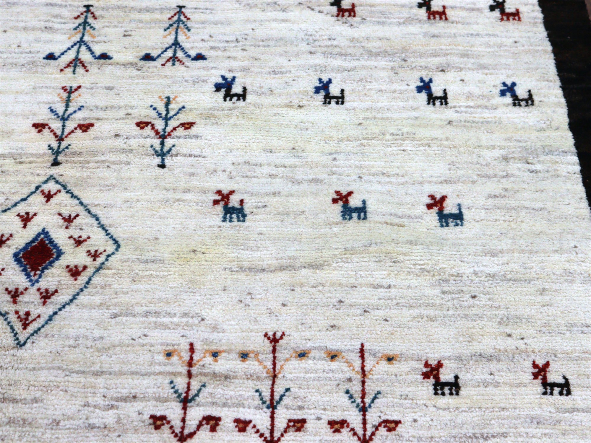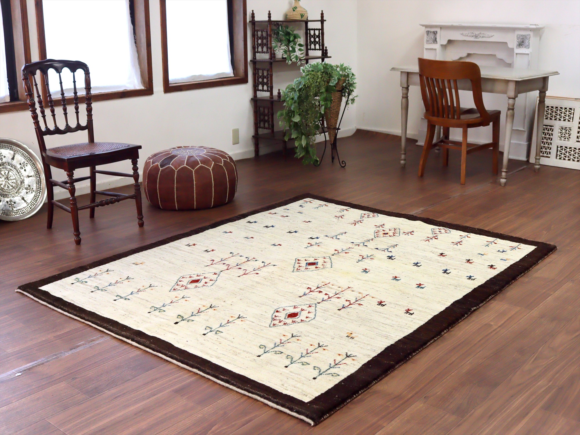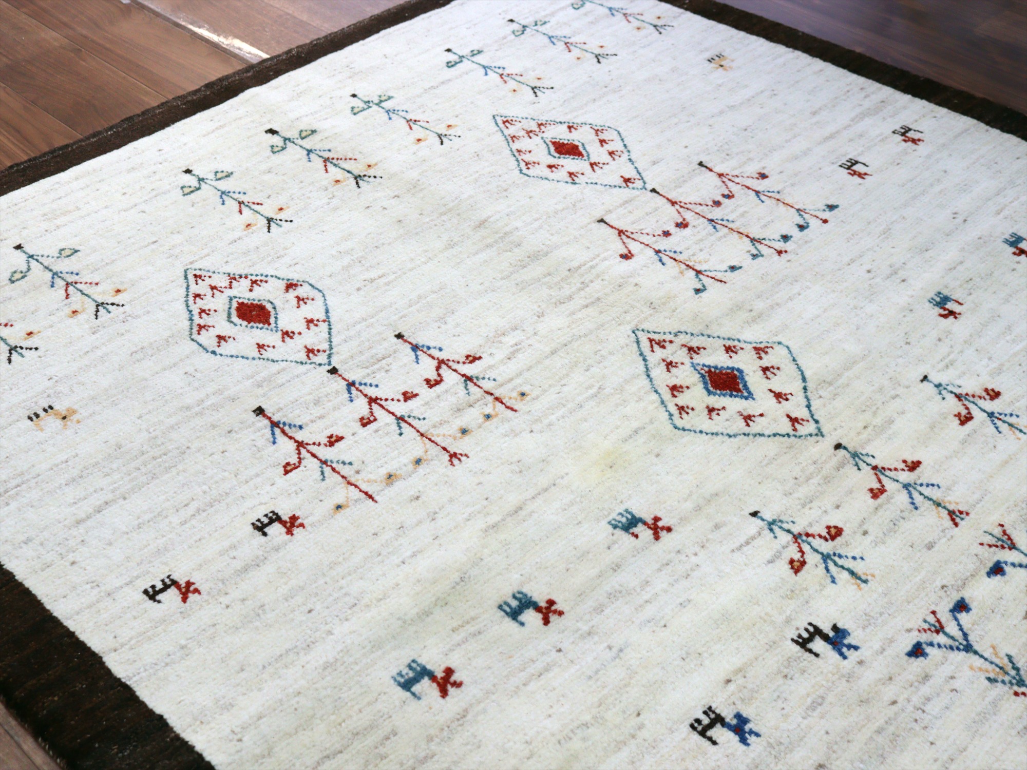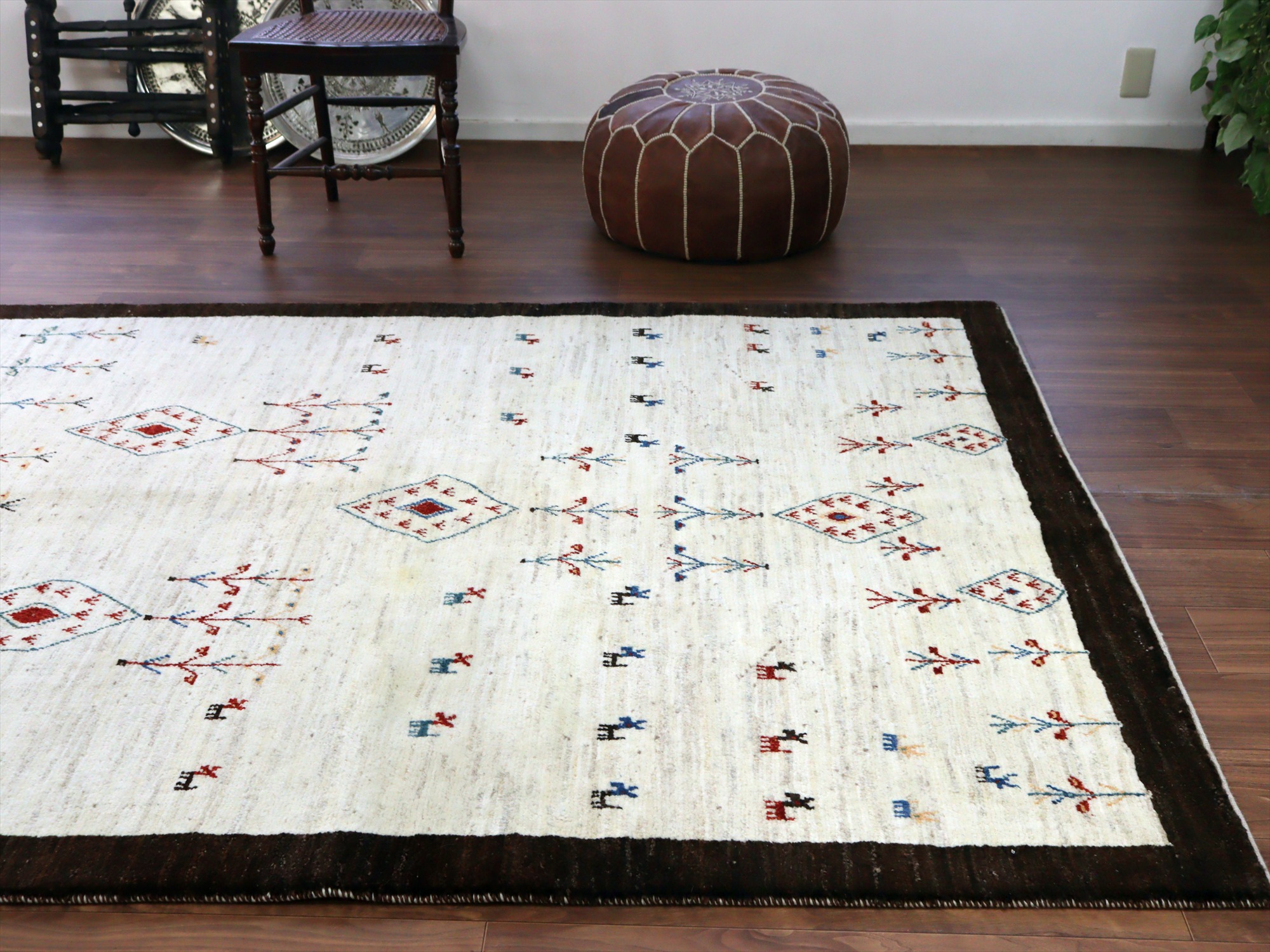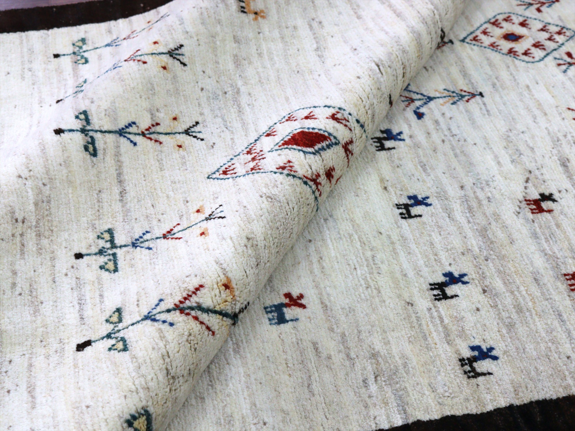 染めていない羊毛ベースに、生命の木、菱形文様、そして羊たちが織り込まれた、素朴な雰囲気のギャッベ。まるで遊牧民の村の風景を絵本のように表現した1枚です。