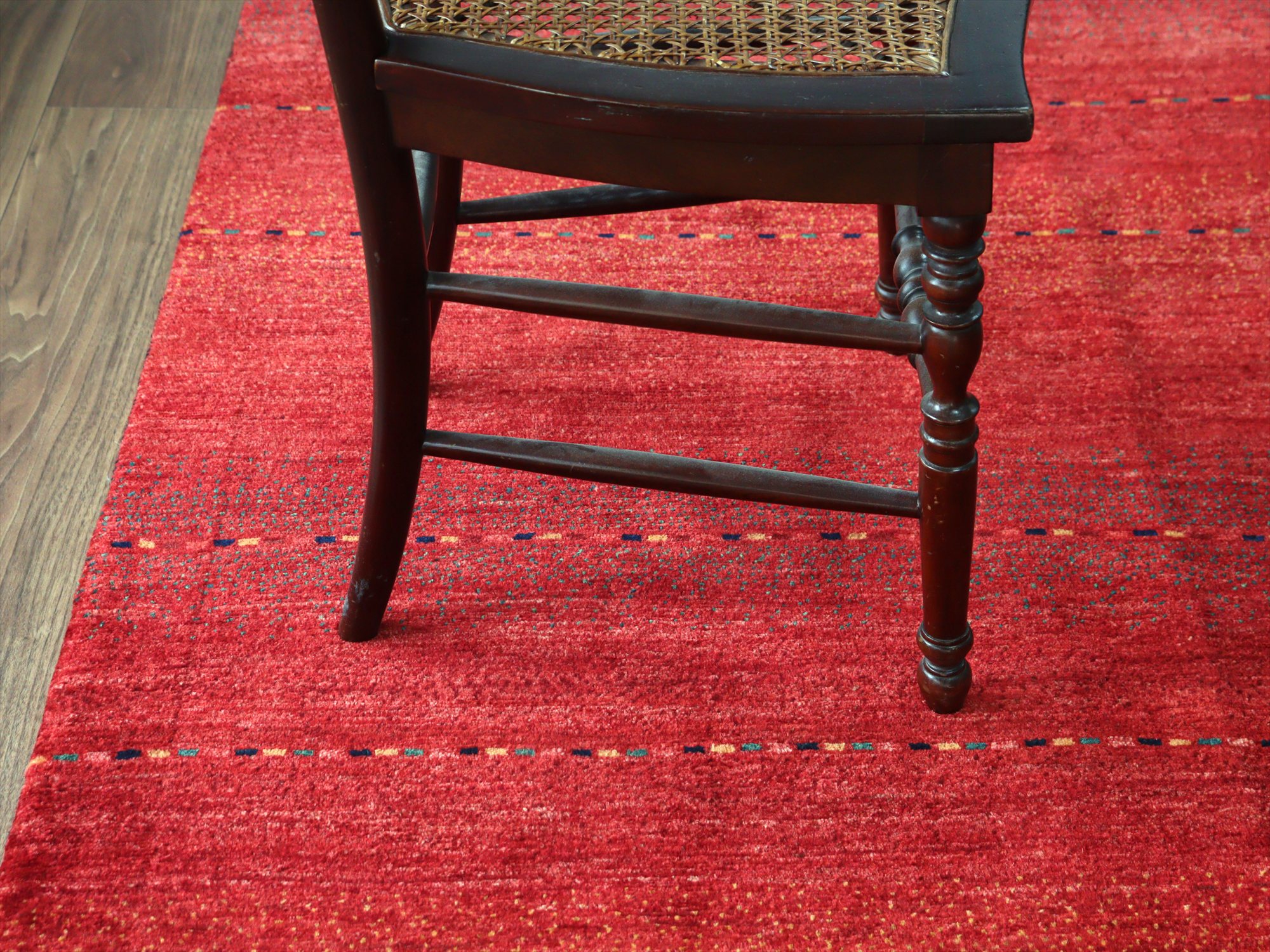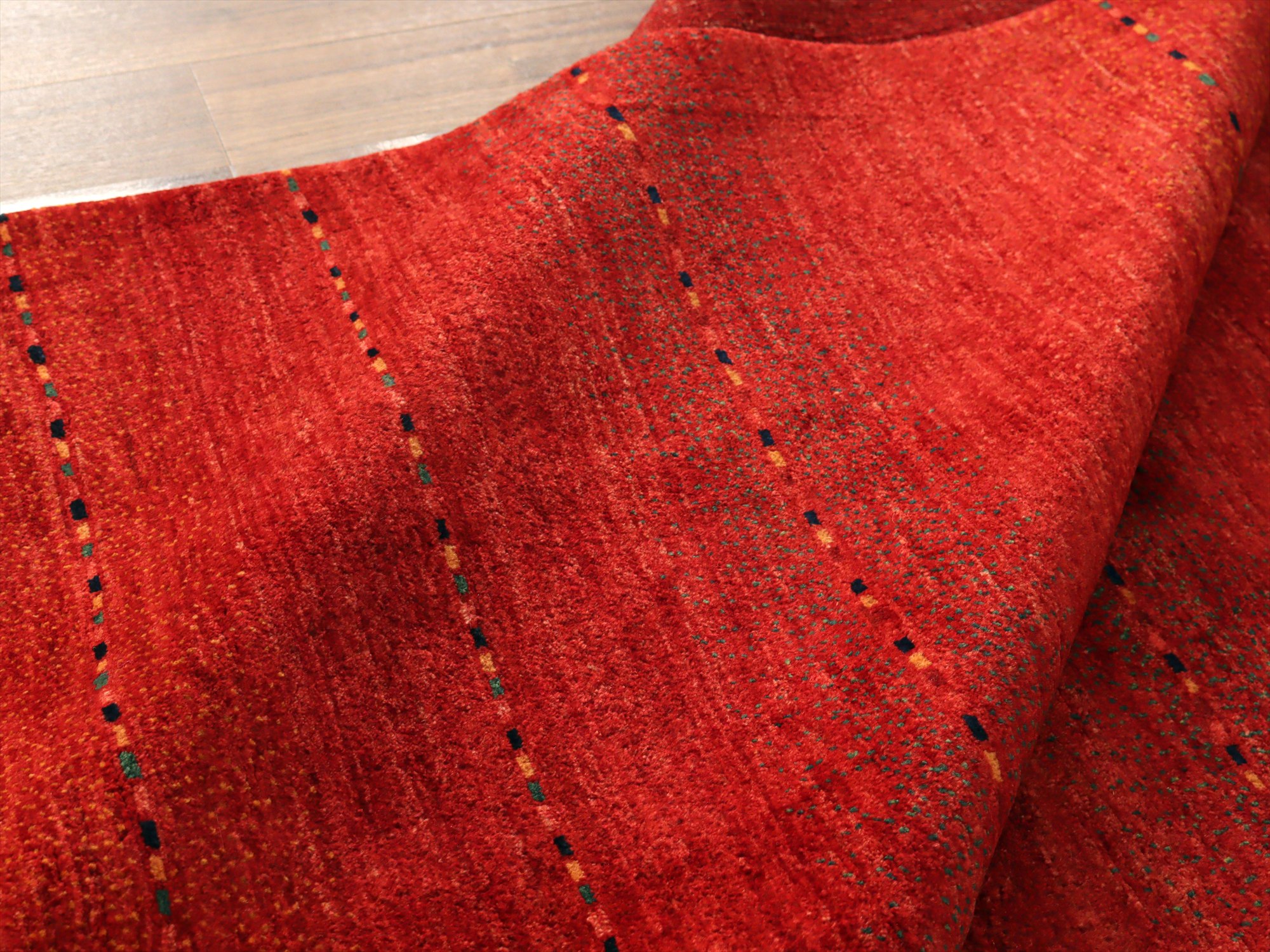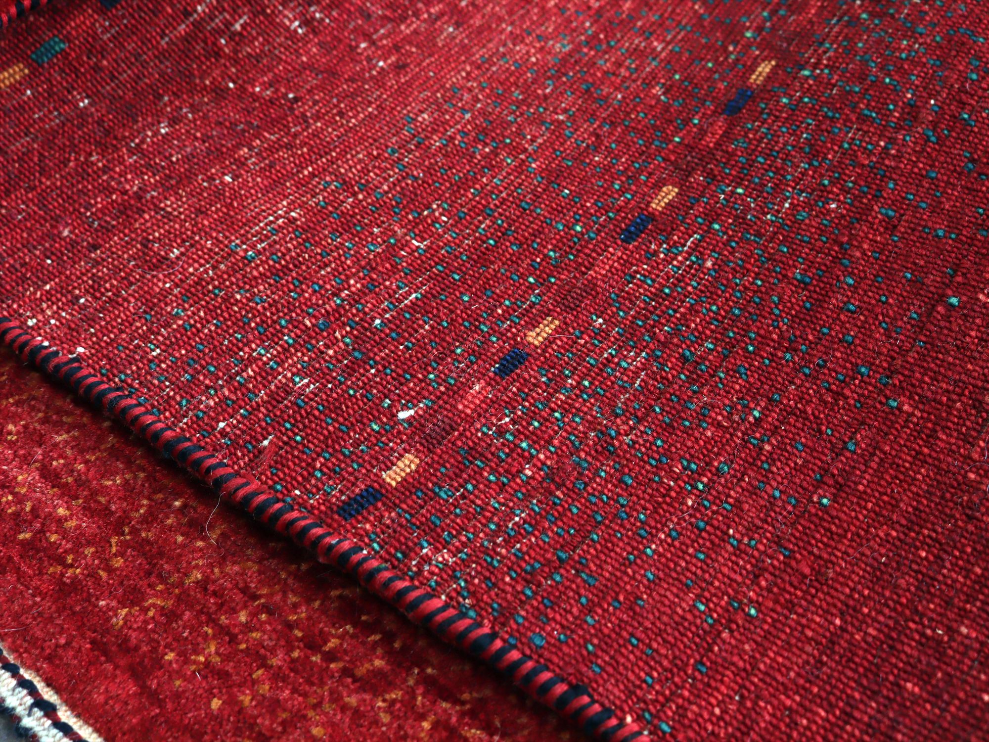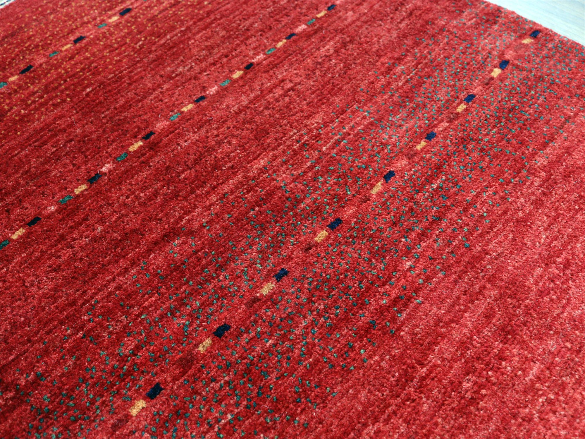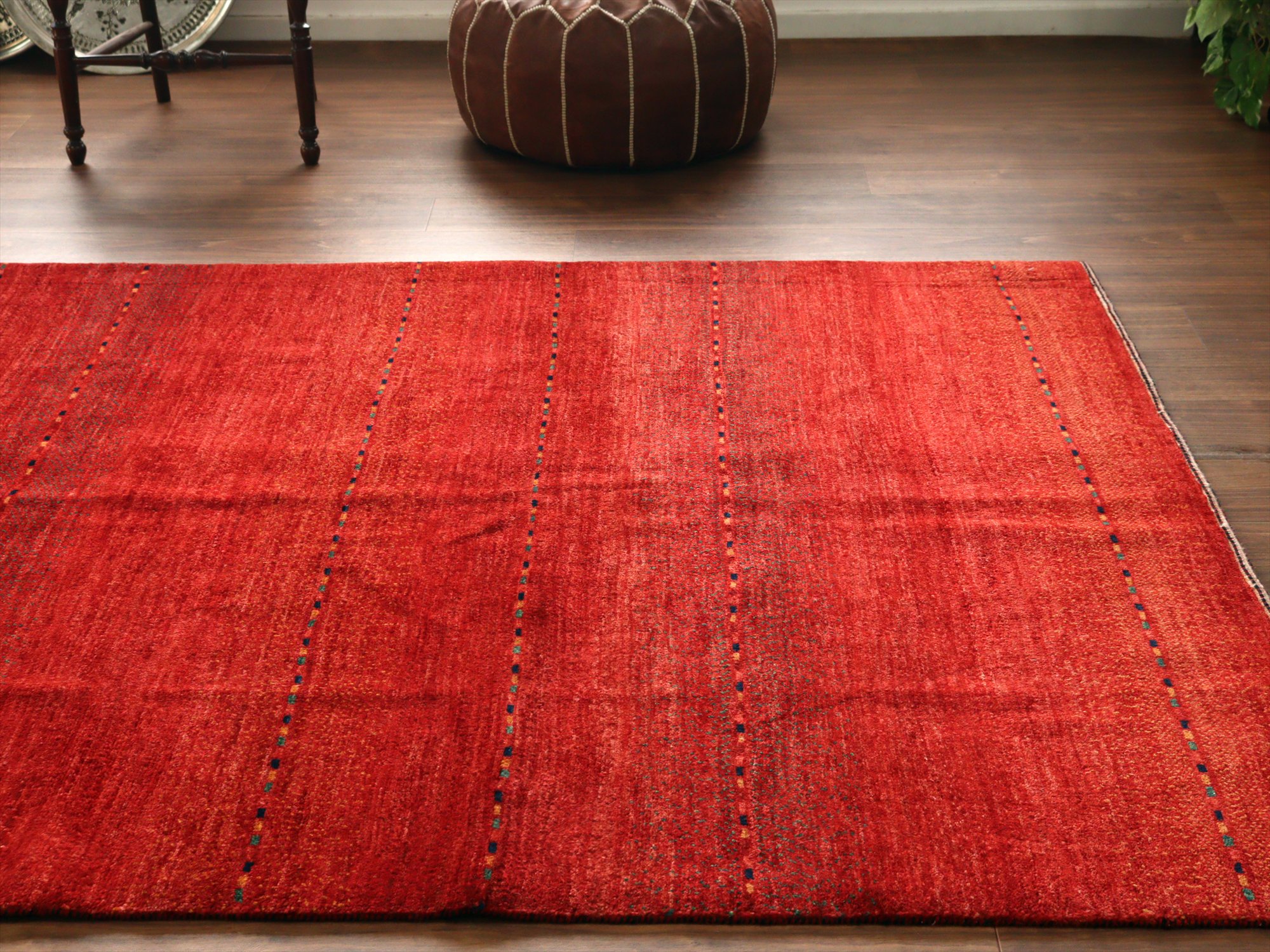 濃淡のあるレッドが繊細に表現された、シンプルなボーダーデザインのギャッベ。深みのある赤からやや明るい朱色へと移ろう、自然なグラデーションが一面に広がり、力強さと温もりを感じさせます。さりげなく織り込まれた小さな色糸により、ボーダーが成されシンプルながらもアクセントの効いた1枚に。