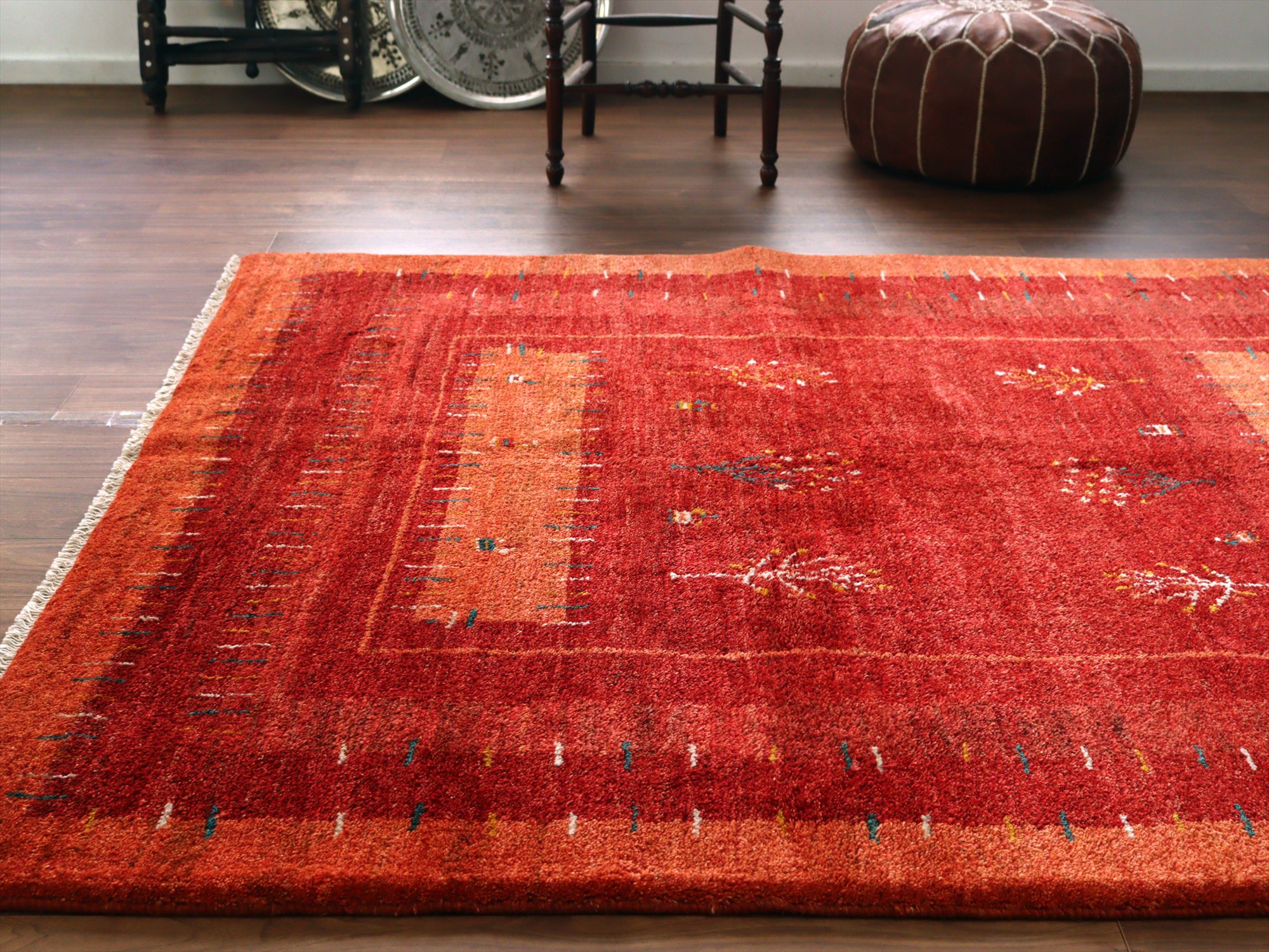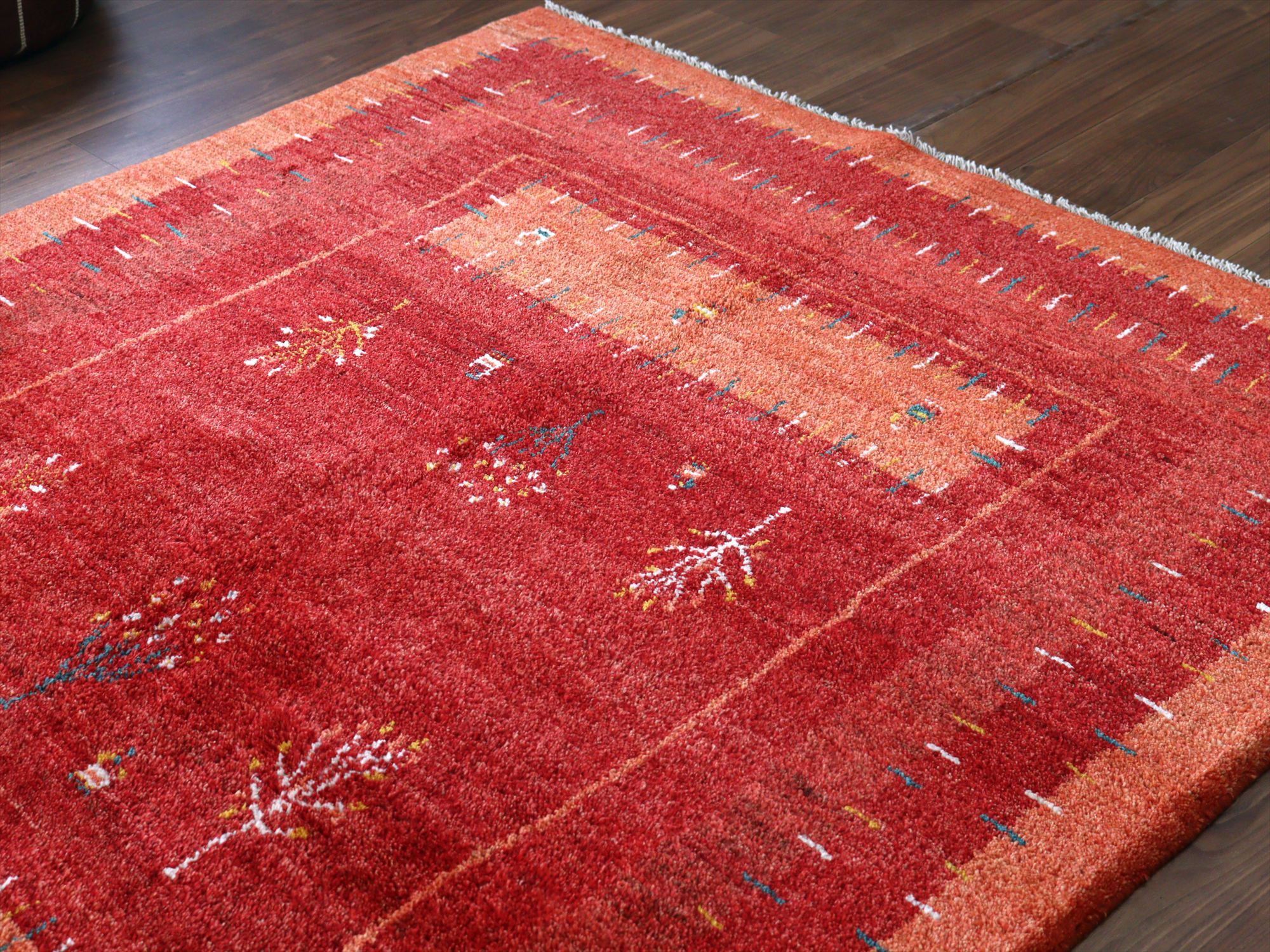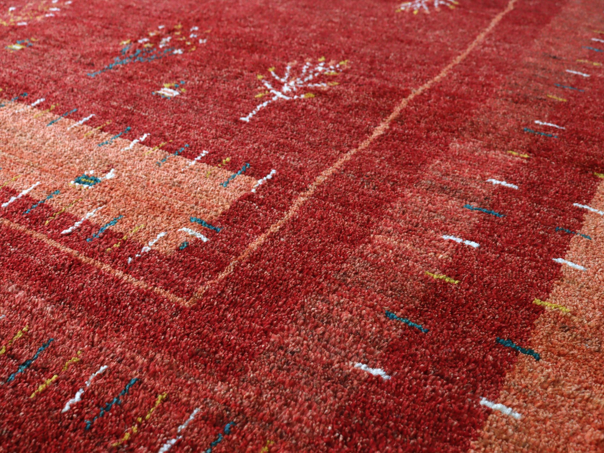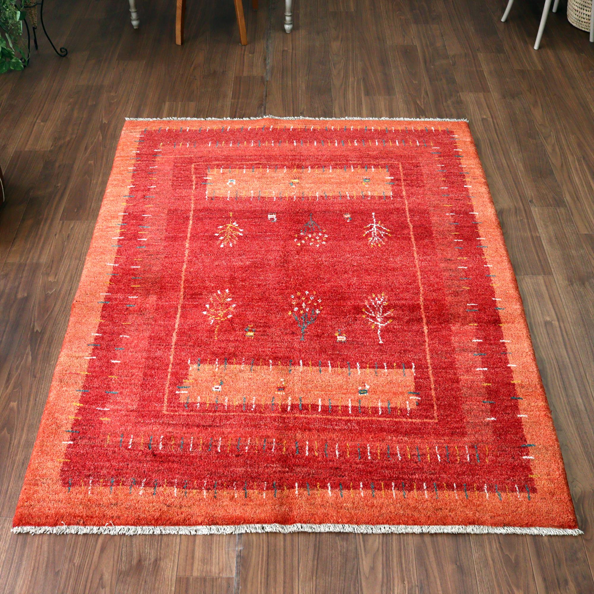 濃淡のあるレッドの色合いを活かして織られたギャッベ。樹々や羊たちが織られ、遊牧民の生活の風景を思い起こさせるような素朴な雰囲気の1枚です。