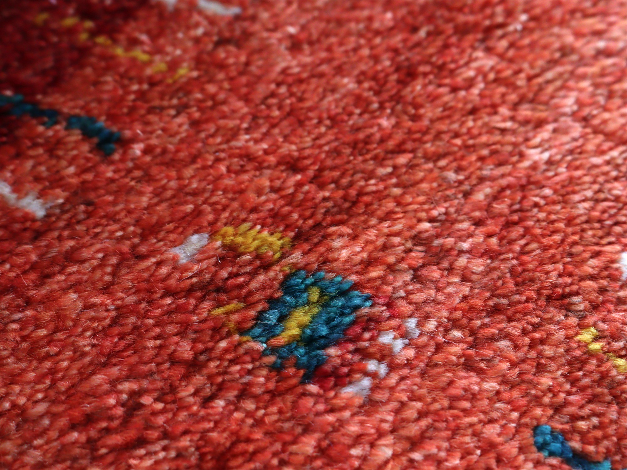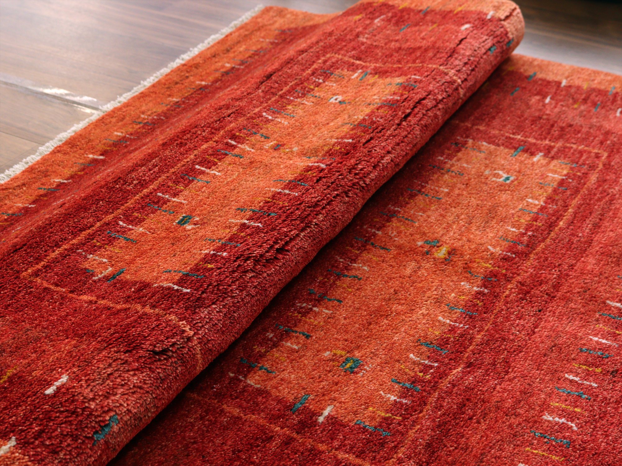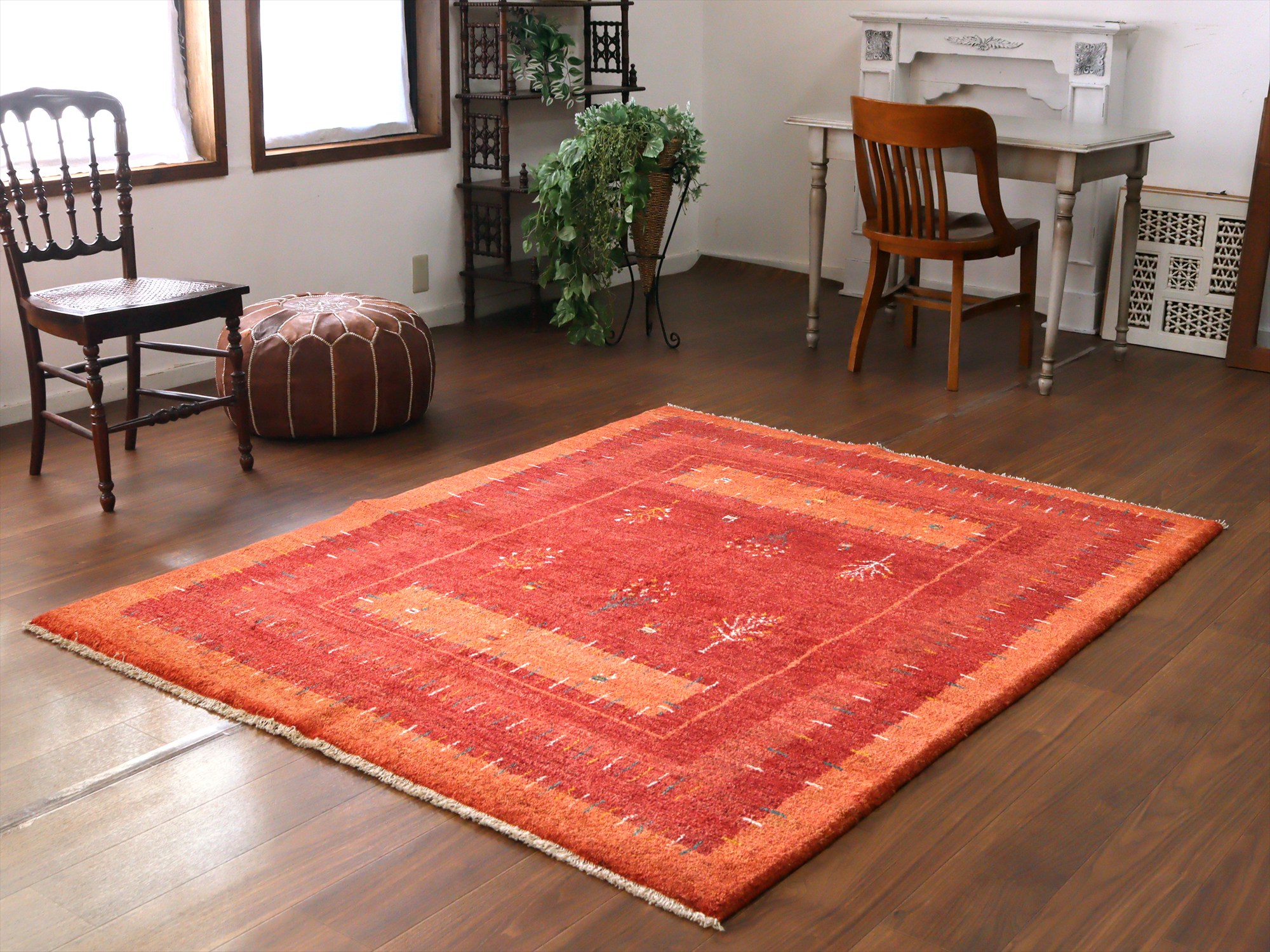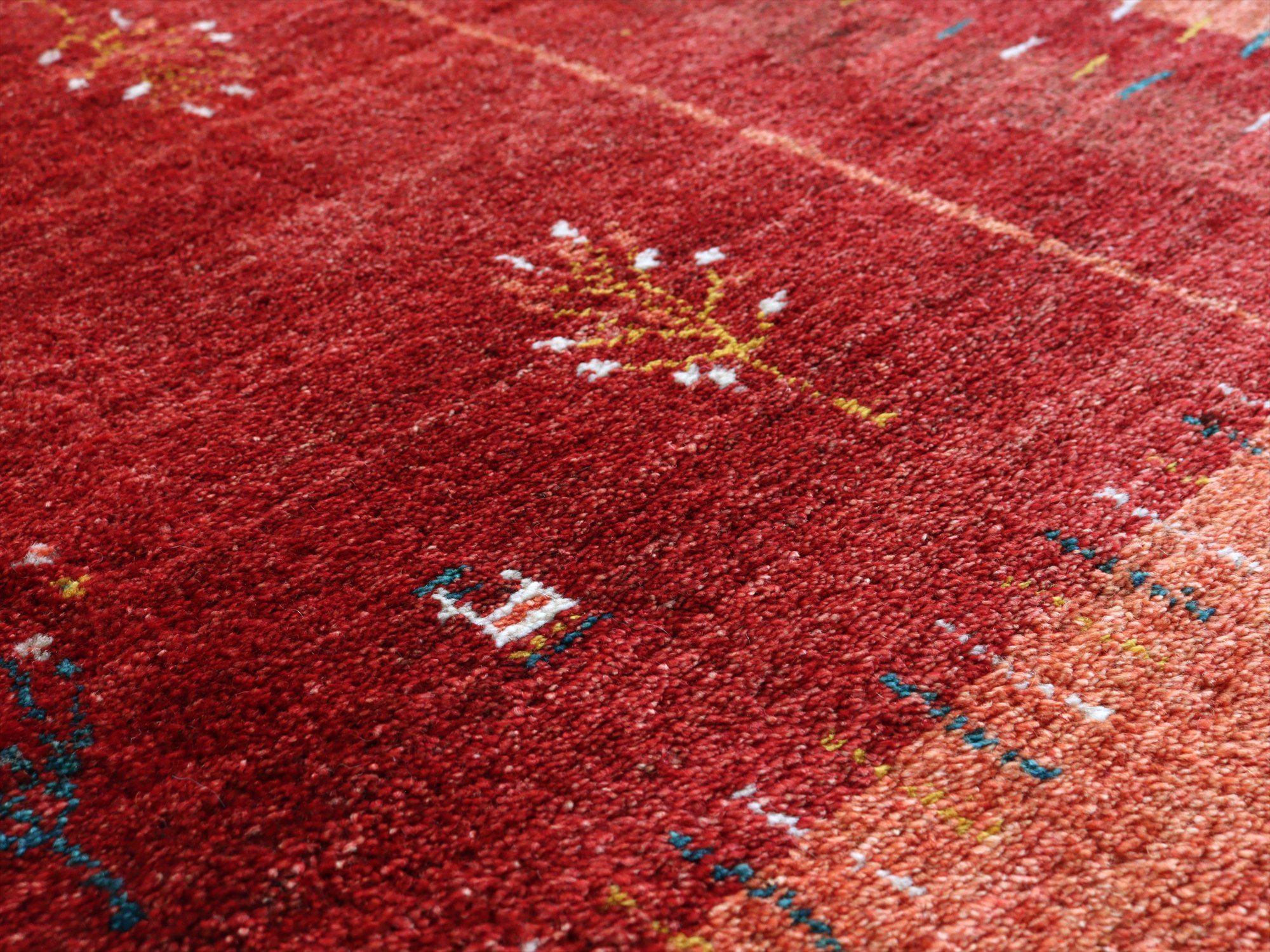 濃淡のあるレッドの色合いを活かして織られたギャッベ。樹々や羊たちが織られ、遊牧民の生活の風景を思い起こさせるような素朴な雰囲気の1枚です。