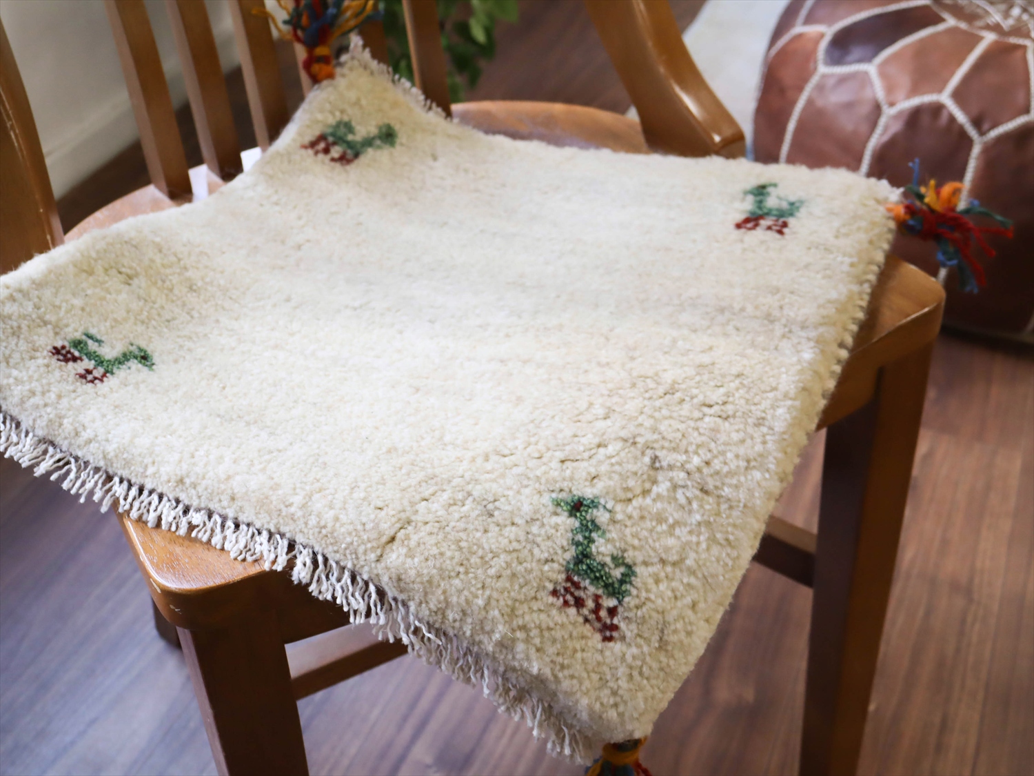 染めていない羊毛のアイボリーの地に、動物モチーフがはいったギャッベの人気定番デザイン。ところどころ羊毛のブラウンやグレーの毛が混じっています。