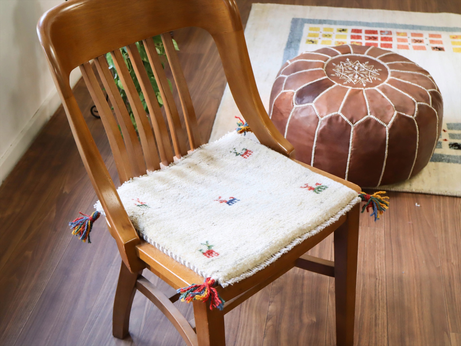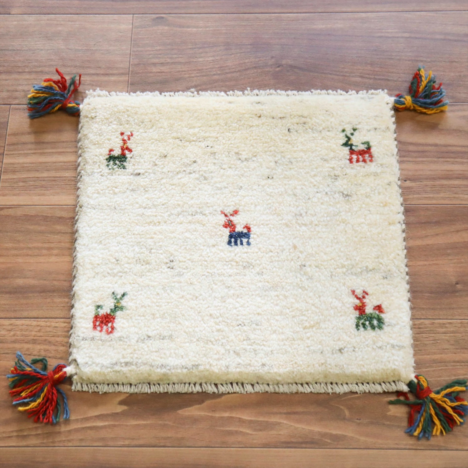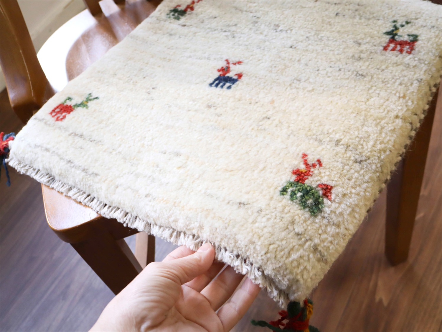 染めていない羊毛のアイボリーの地に、動物モチーフがはいったギャッベの人気定番デザイン。ところどころ羊毛のブラウンやグレーの毛が混じっています。