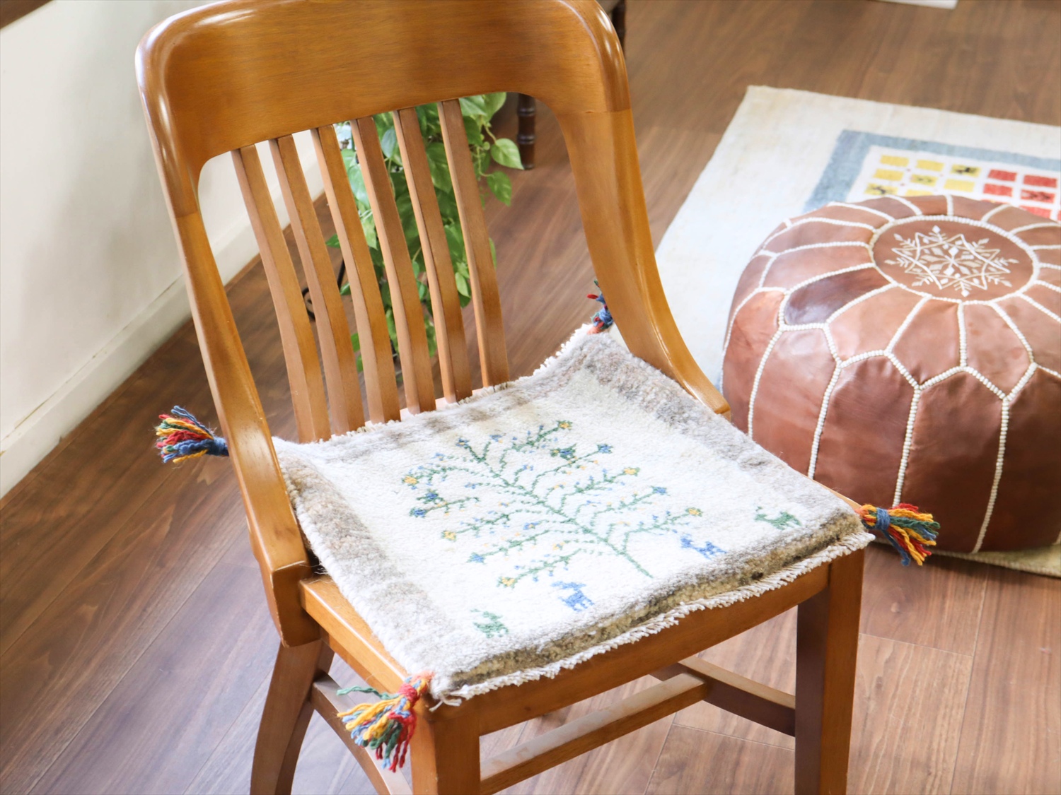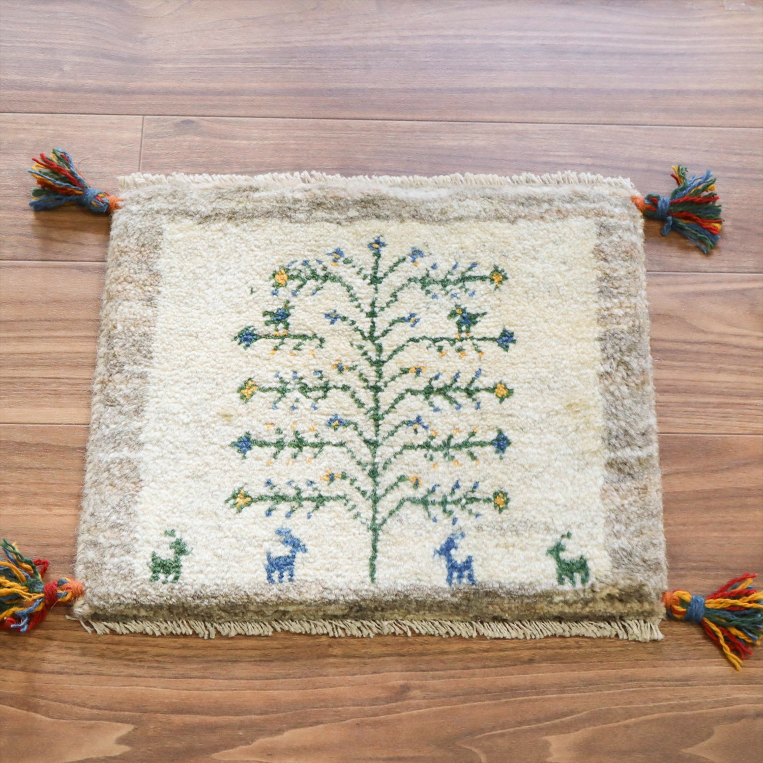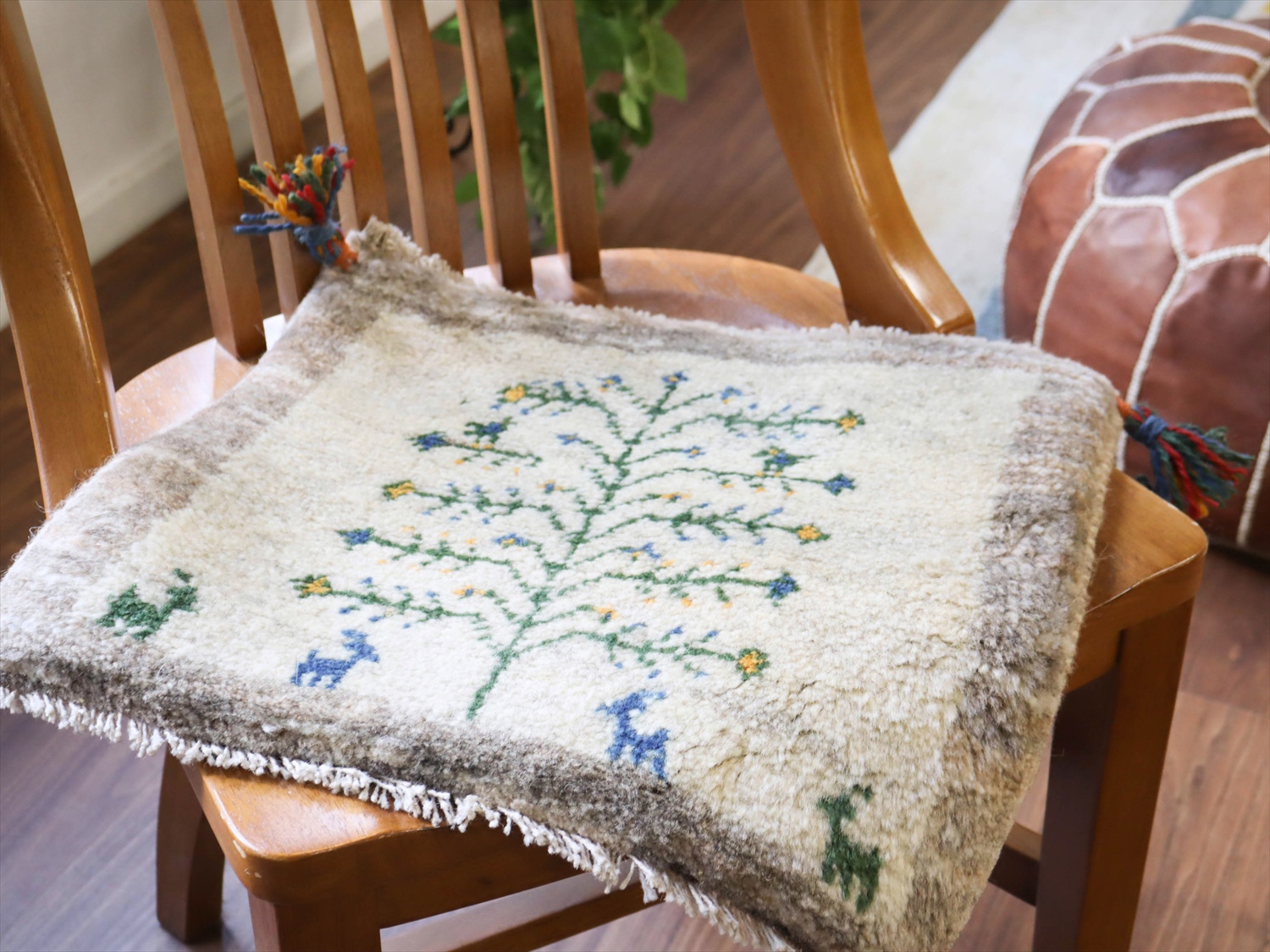 枝葉を伸ばす生命の木が織り込まれた定番のデザイン。枝の上にいるのは鳥でしょうか。色やモチーフなどは、一枚一枚に個性があり、手織りならではの楽しさがありますね。