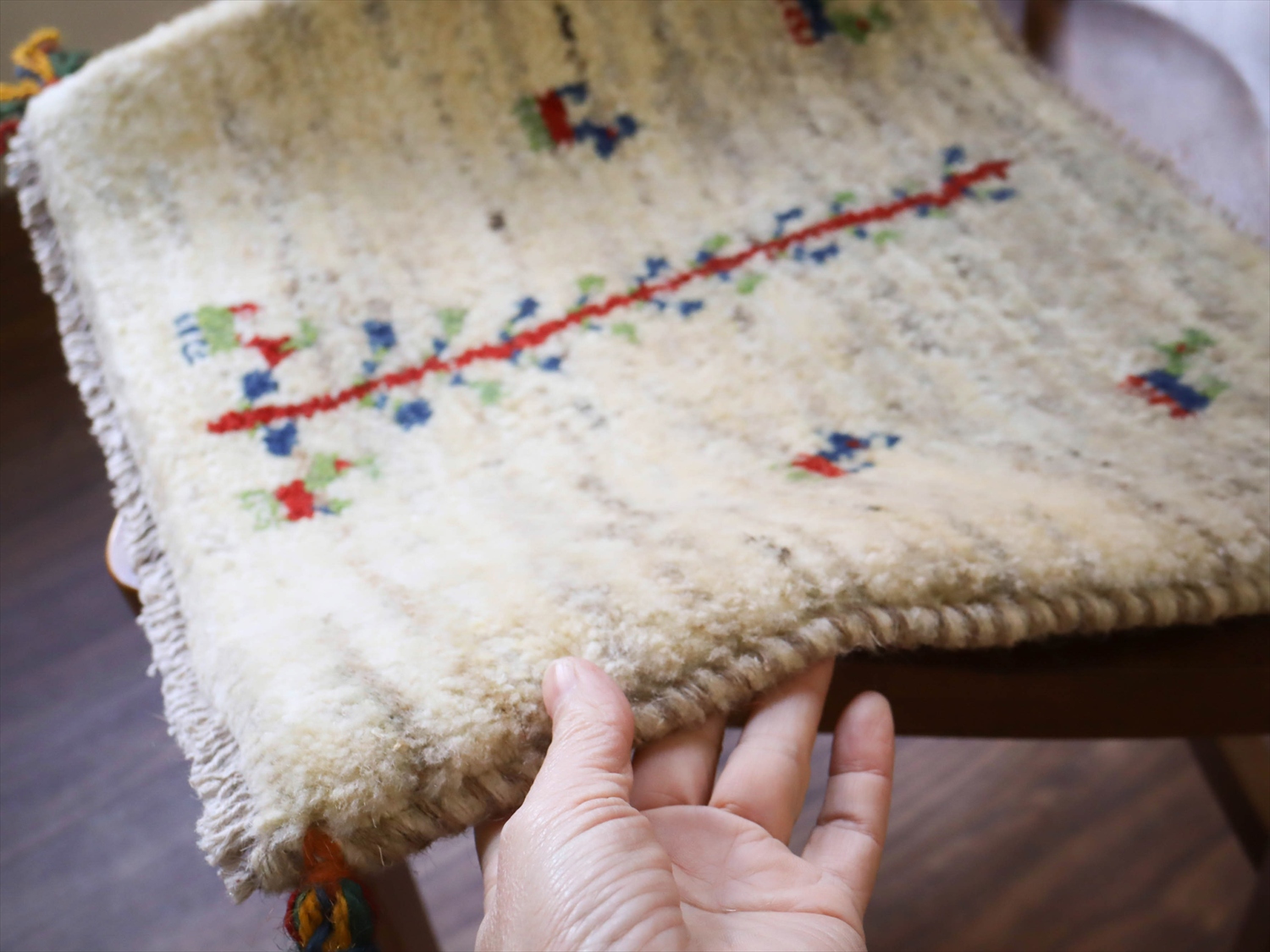 毛足を含めたギャッベの厚みは2cm弱で、少し横長サイズのやわらかな織り。