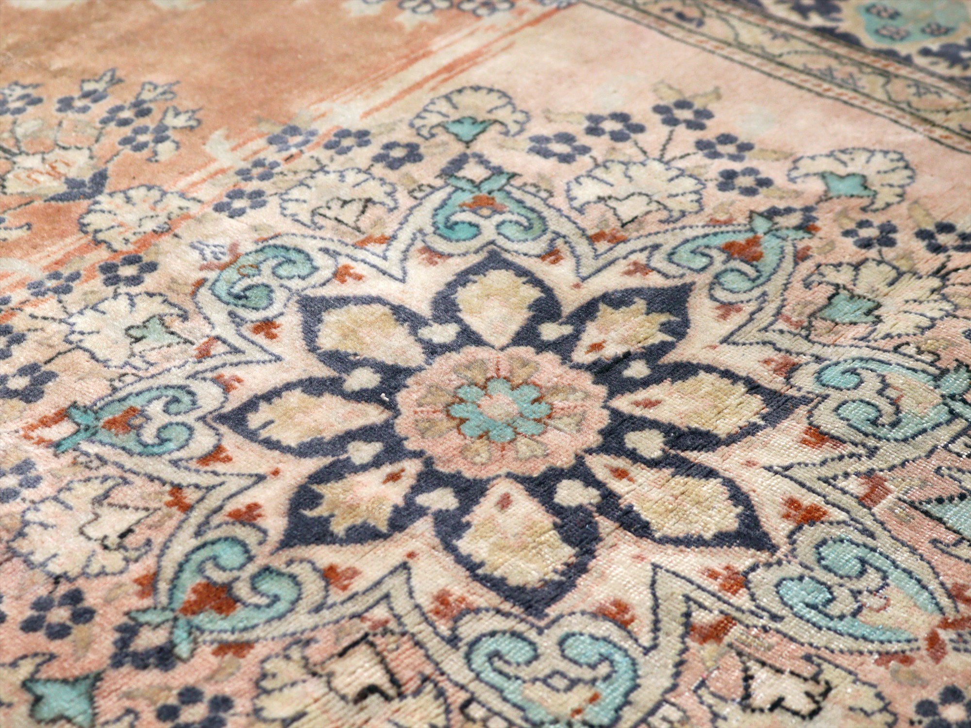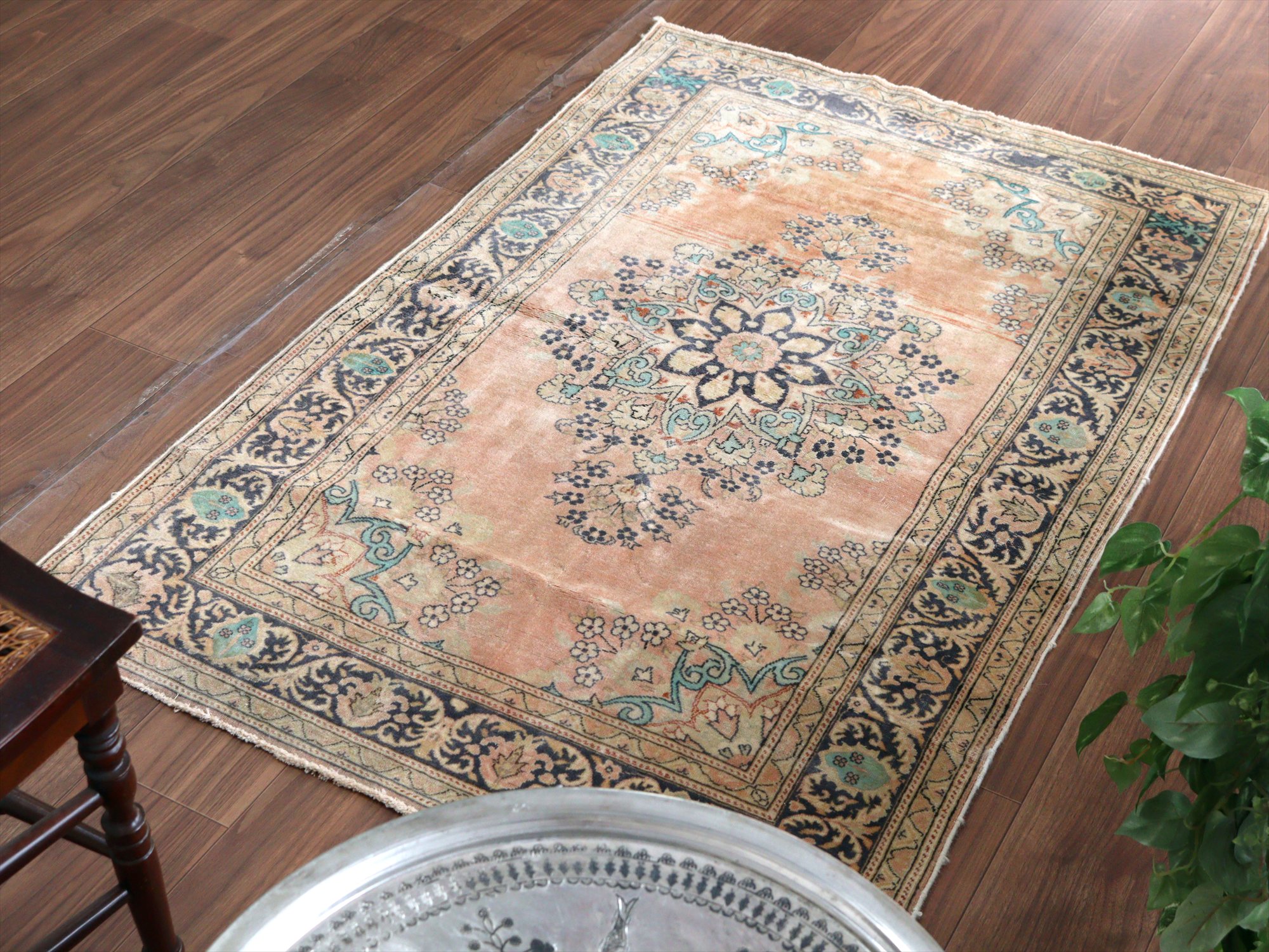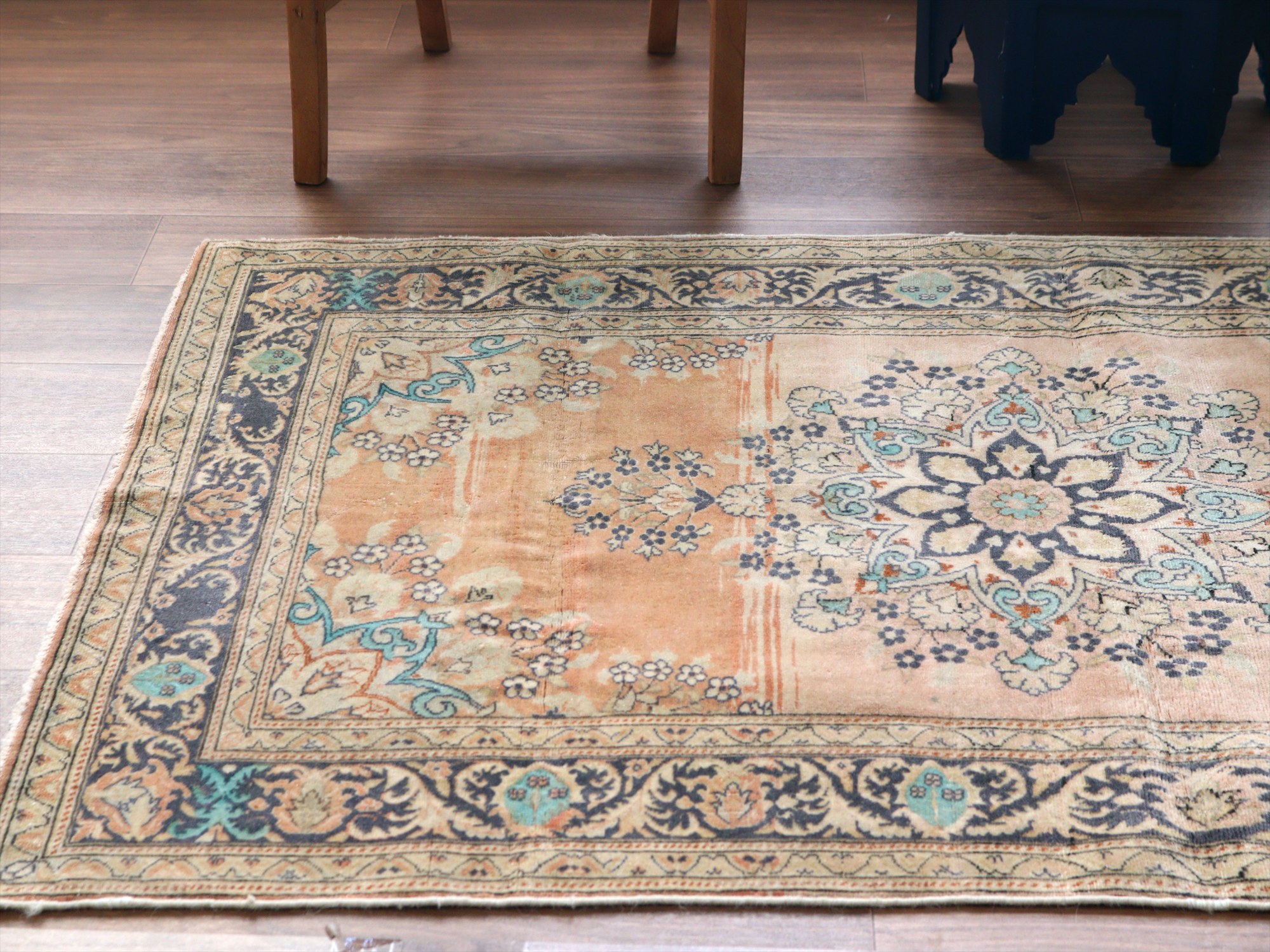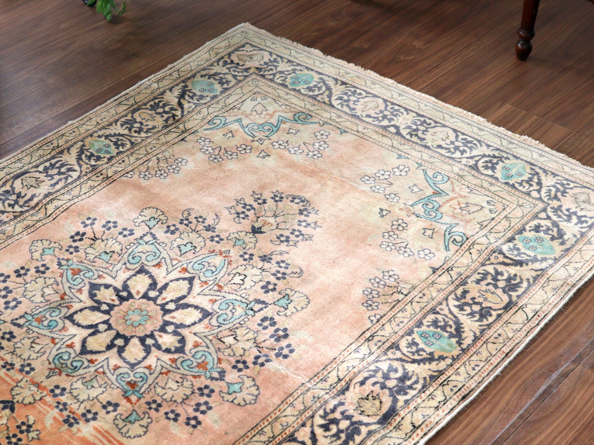 オールドカーペット パステルカラー148×95cm 花形のメダリオン ヴィンテージラグ