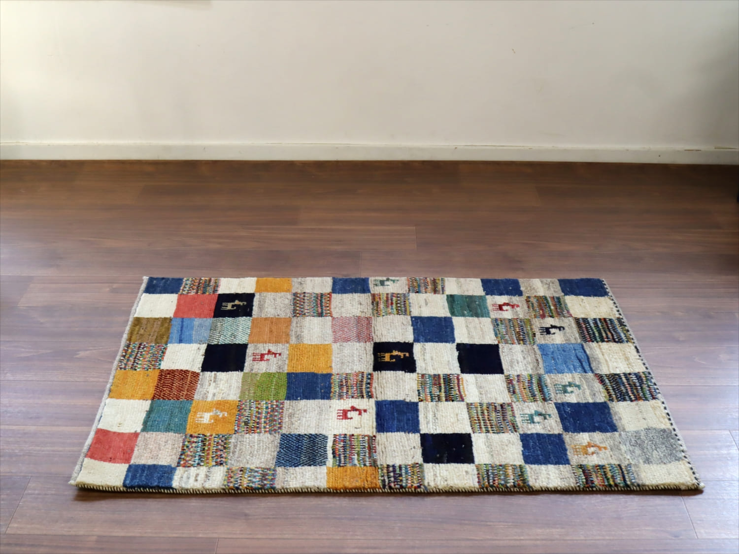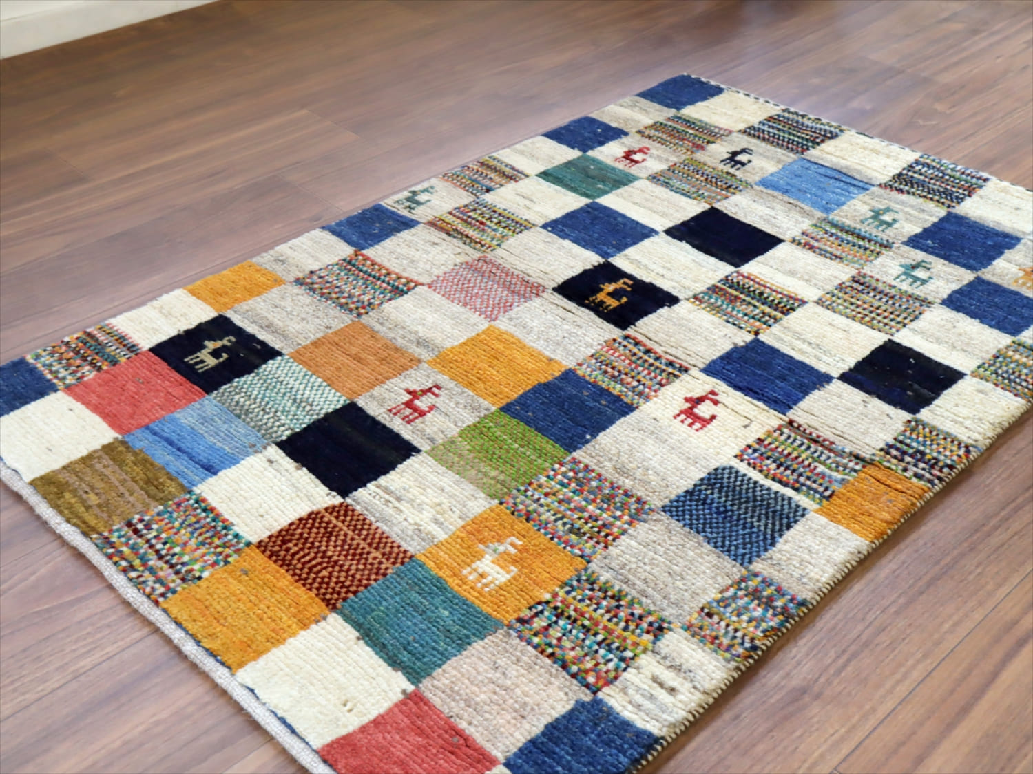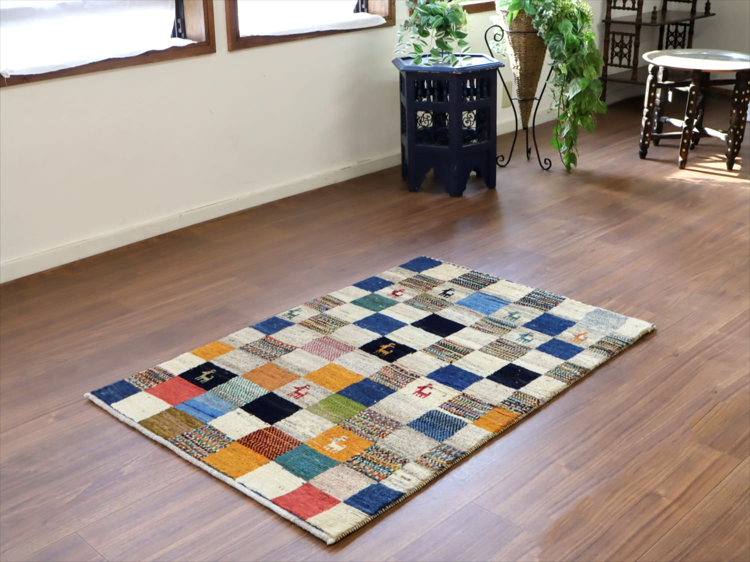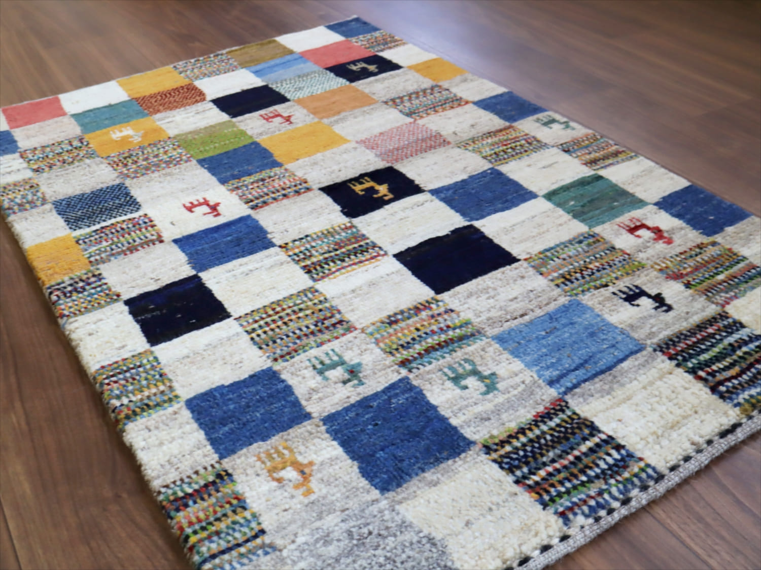 カシュカイ族の伝統的なギャッベをアレンジしたタイルパターン。白っぽく見えている部分は、染めていない天然の羊毛の色でアイボリーやグレー、その間に単色のオレンジやネイビーブルー、カラフルなドットミックスがランダムに配置されて、ユニークな一枚に仕上がっています。