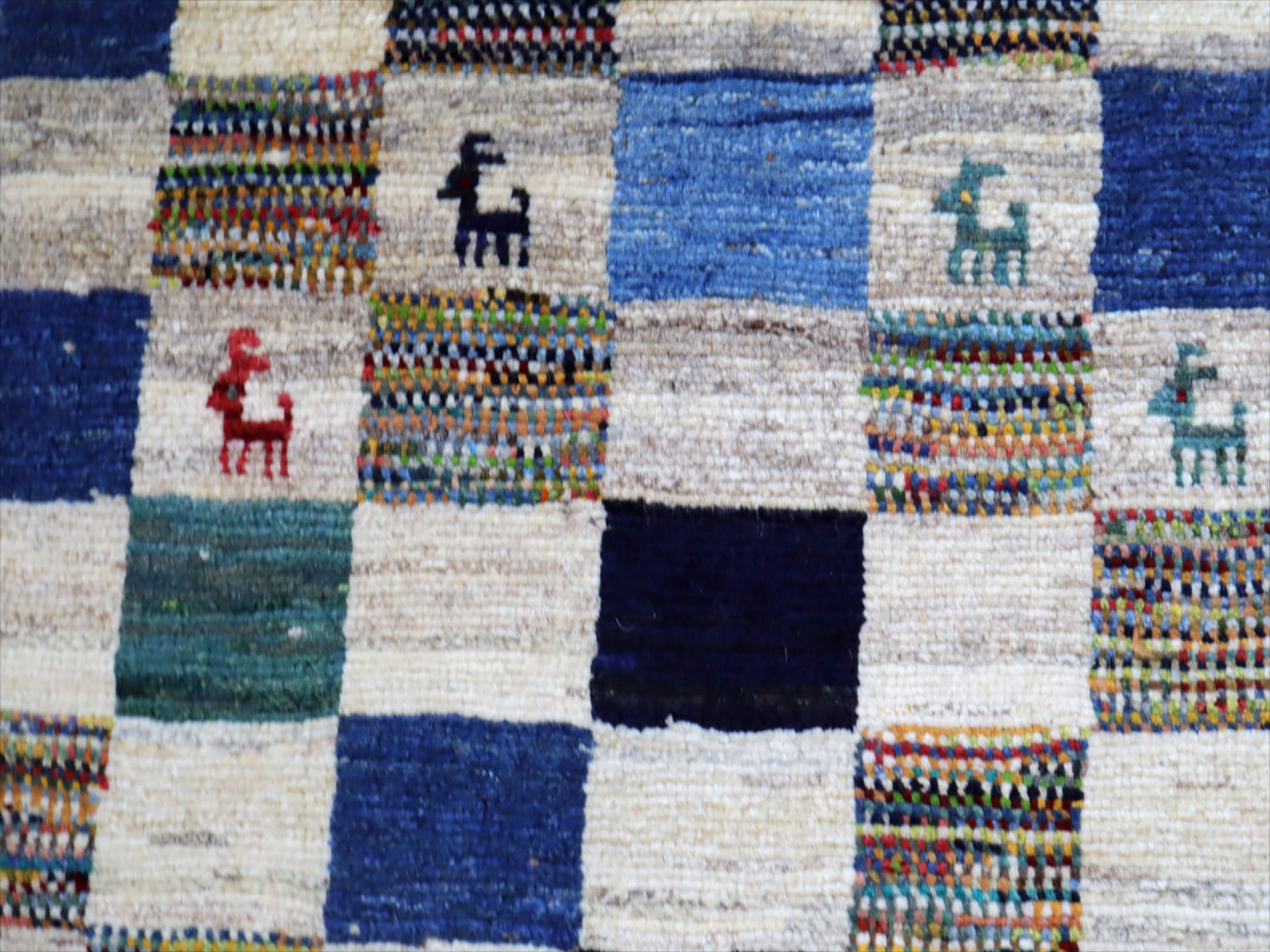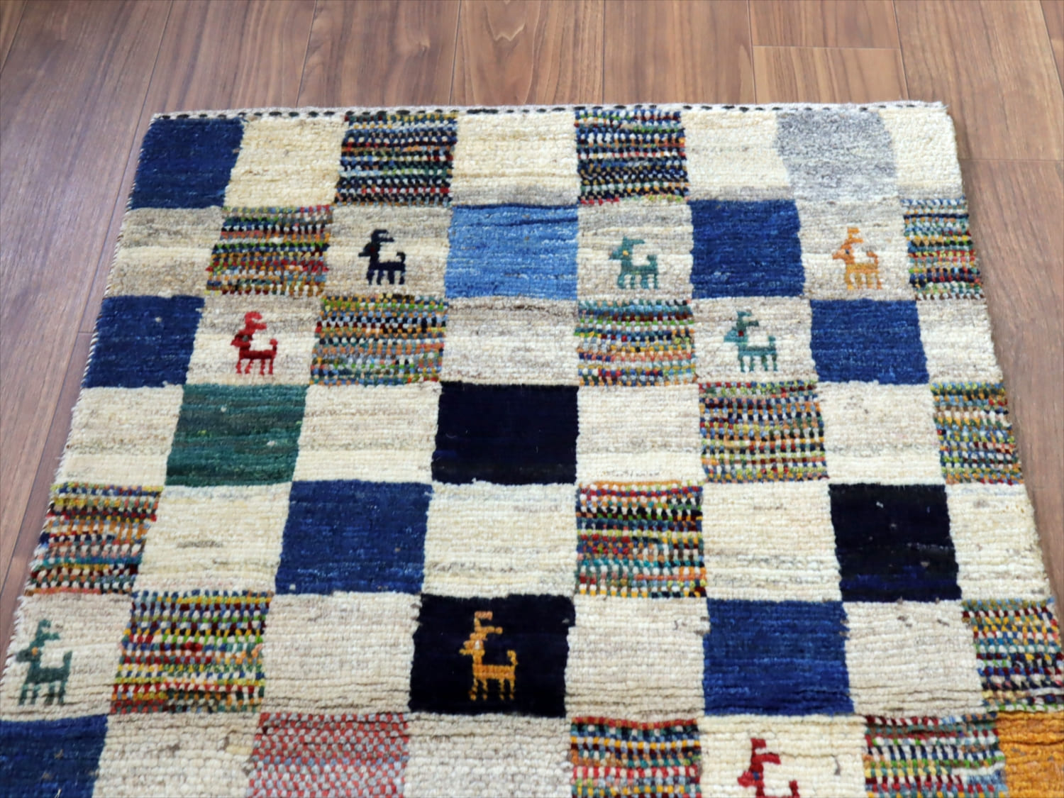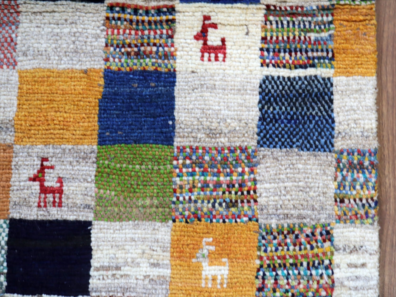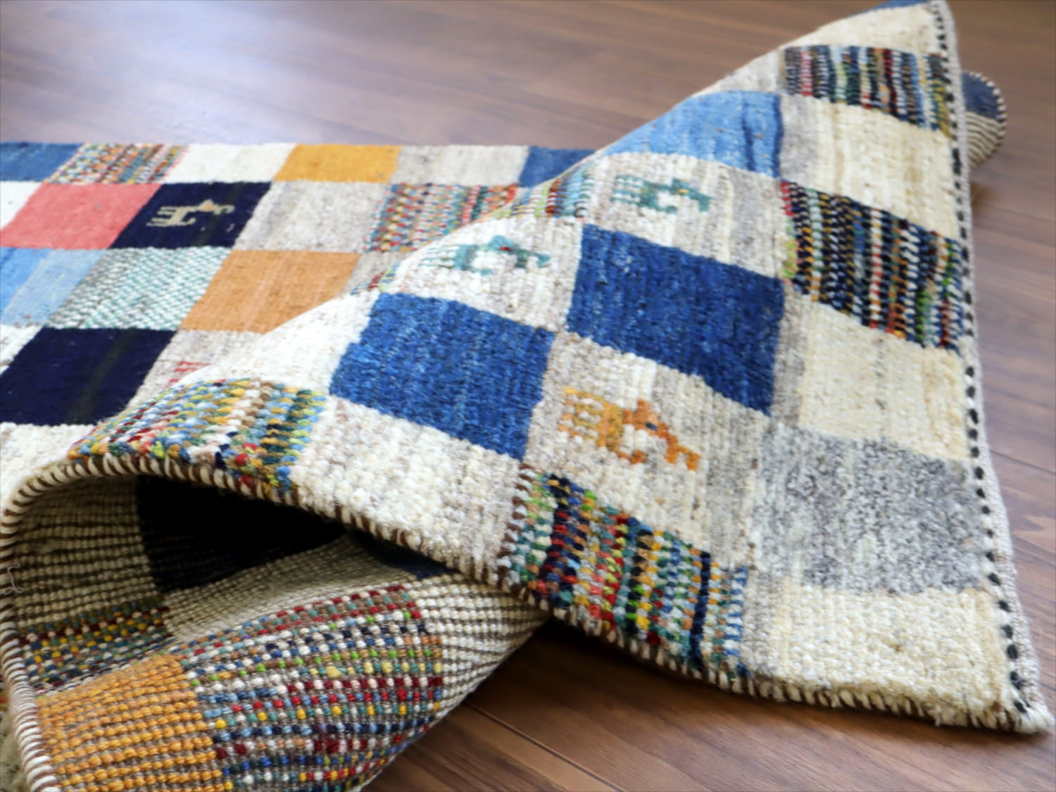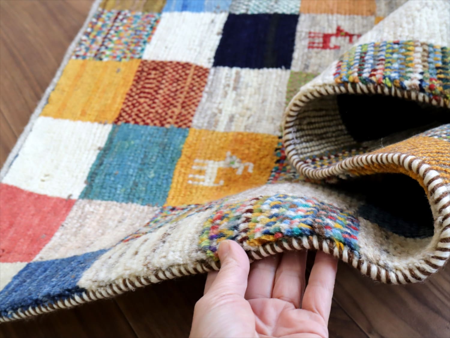 パイル(毛足)はすっきり刈り込んであり、ギャベ全体の厚みは1.3-1.4cm程度。