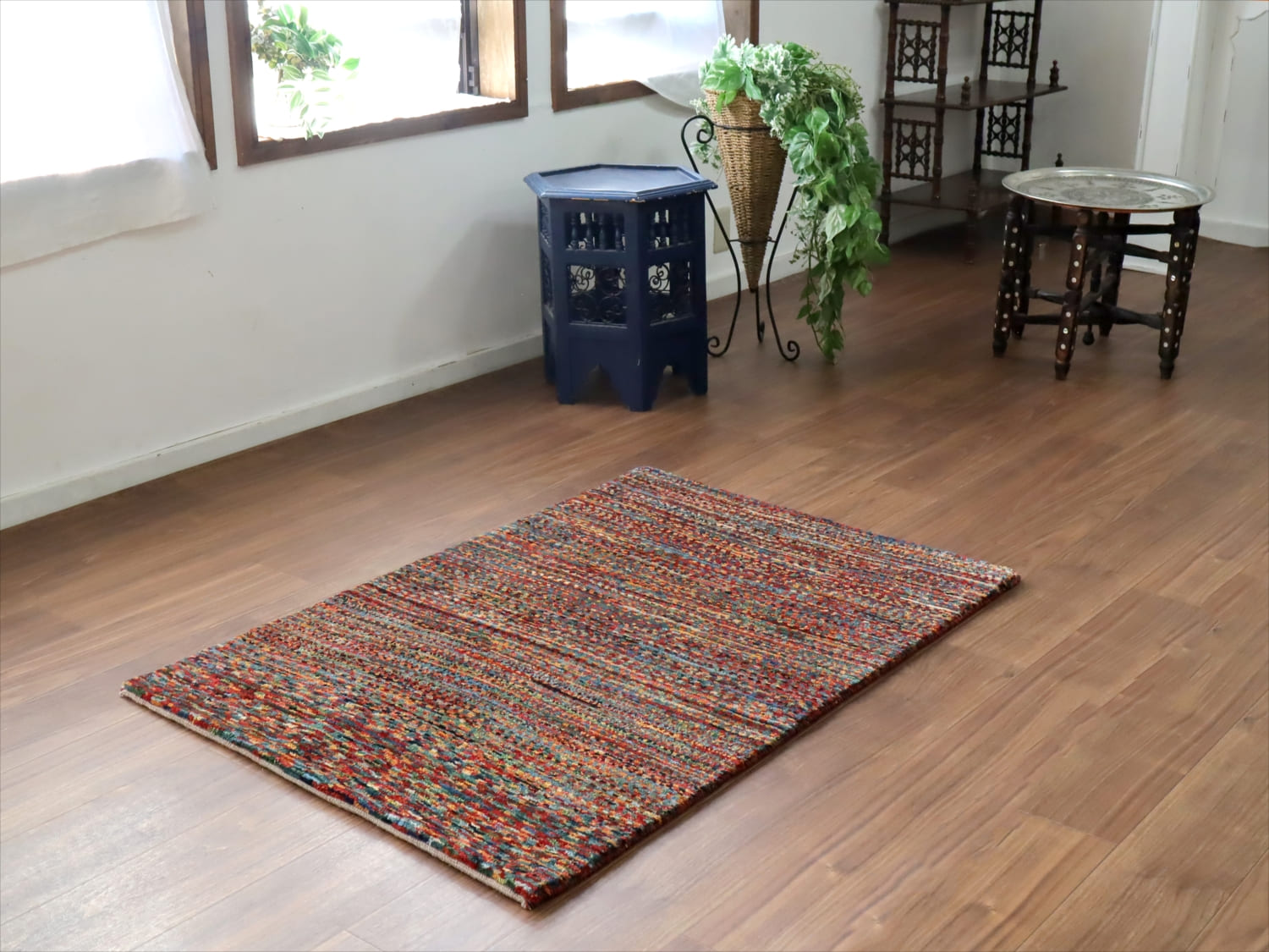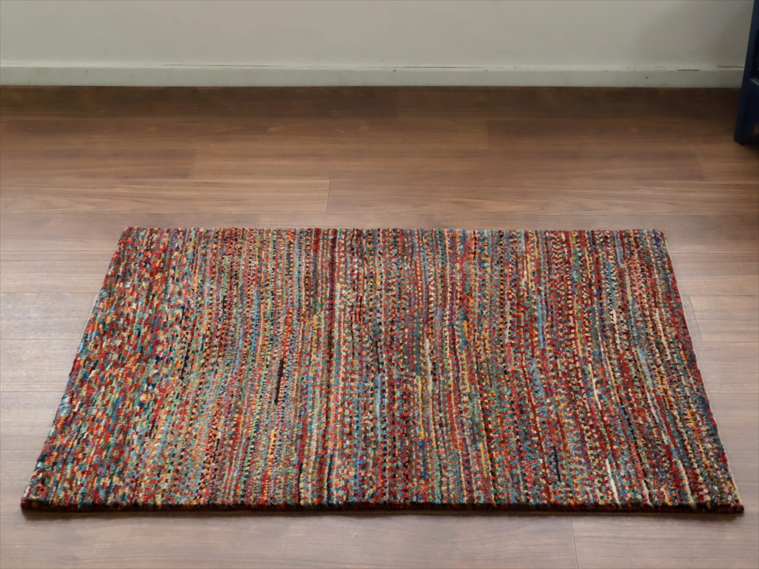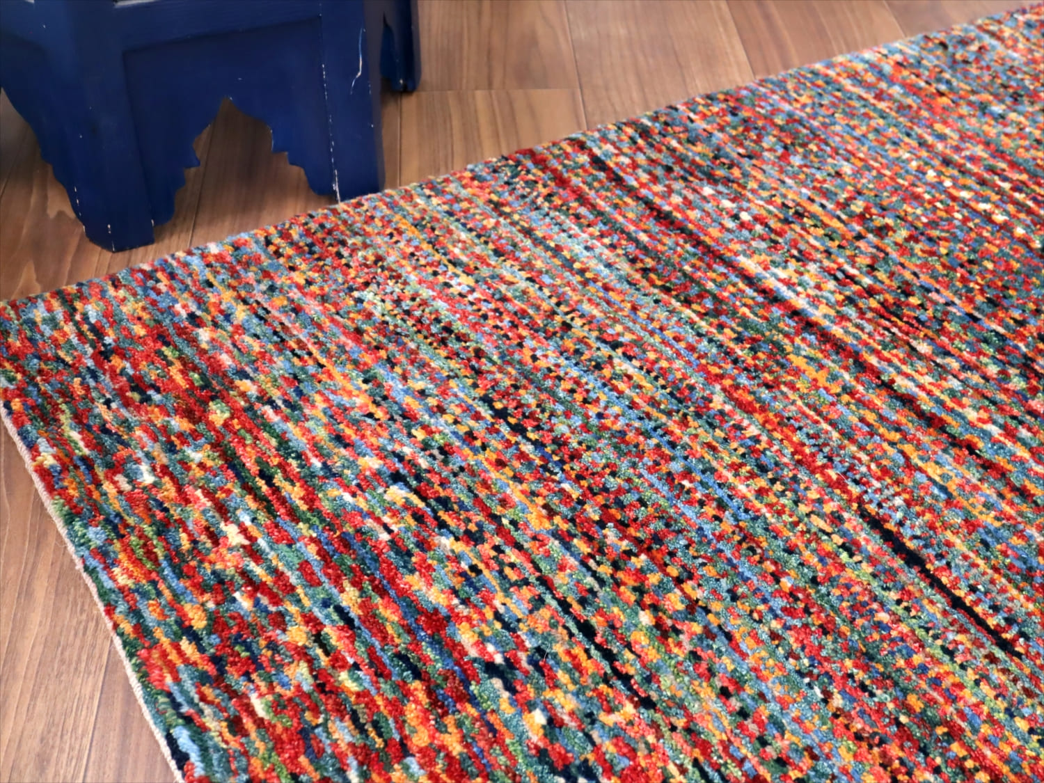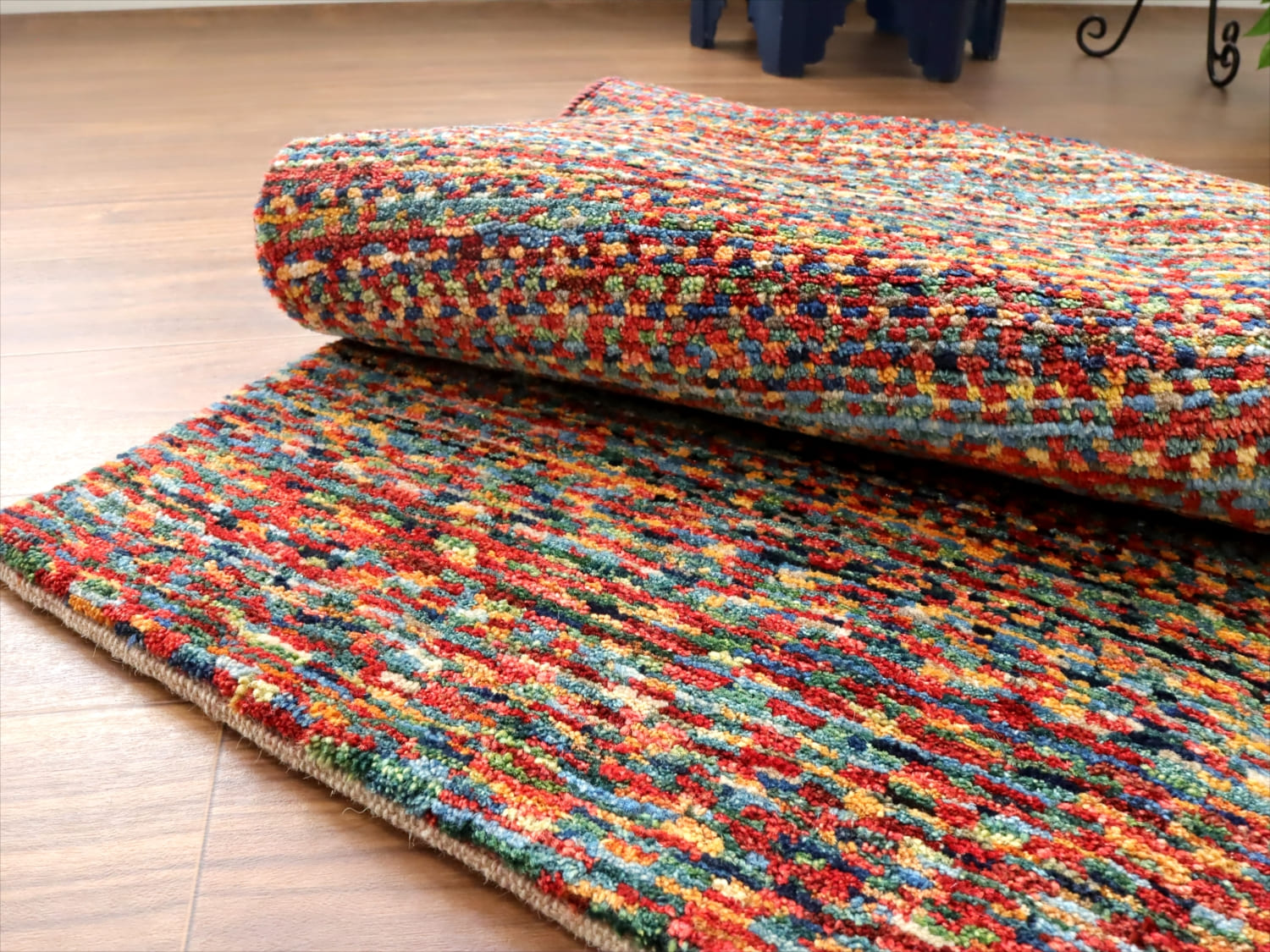 パイルを含めたギャッベの厚みは、1.6cm程度で、分厚いという感じではありませんが、ふっくらとしています。ぎゅっと織り目が詰まって、弾力があります。