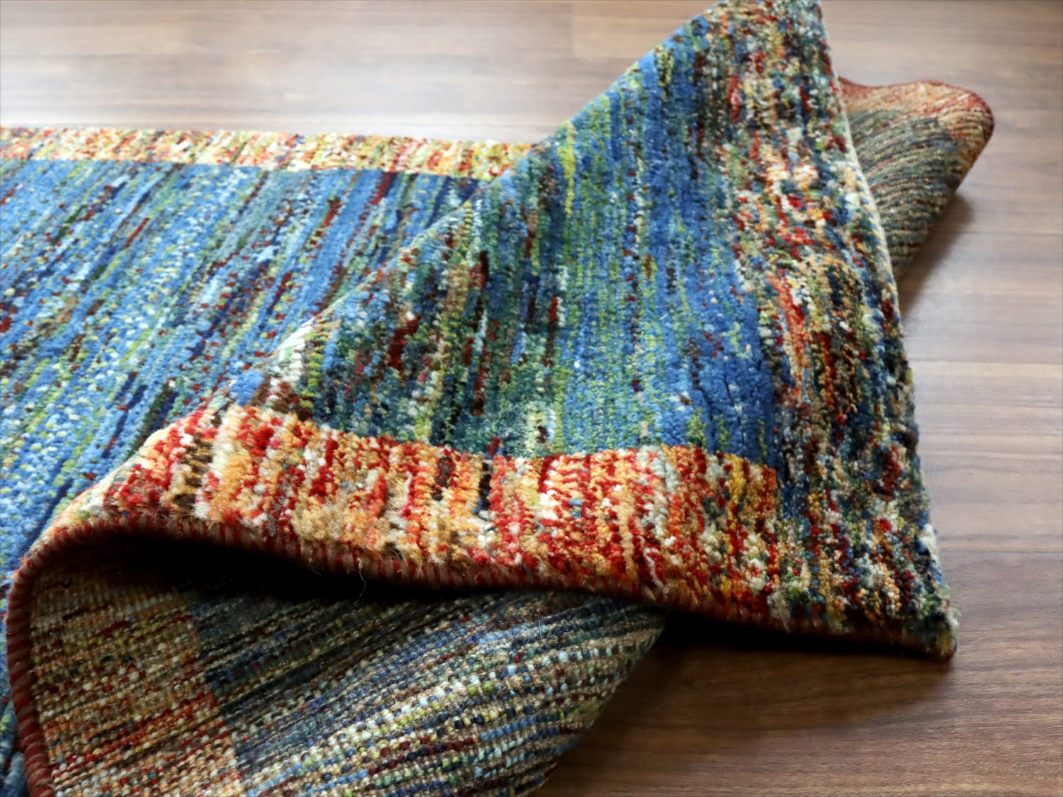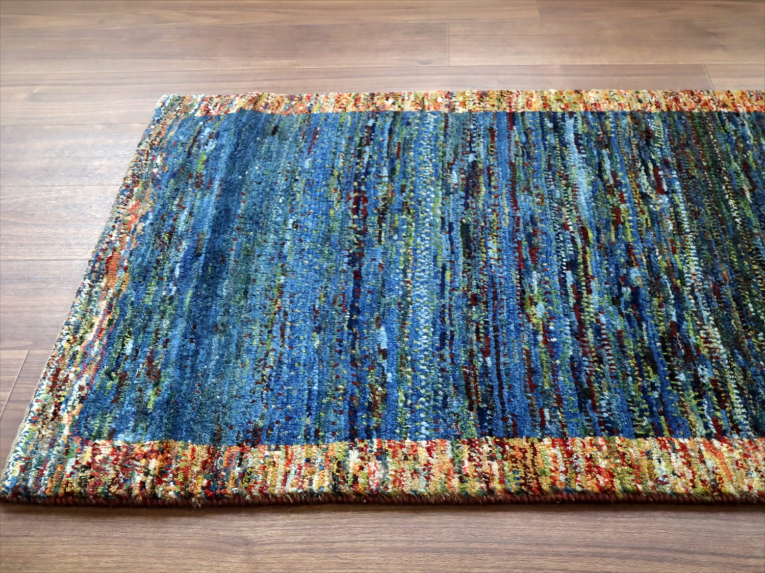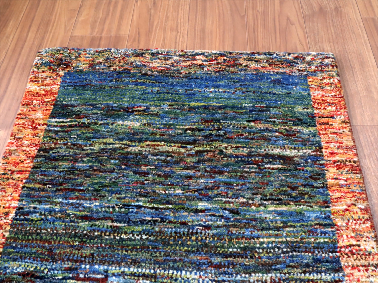 中央は、ブルーとグリーンを合わせたグラデーション、周囲のボーダーは何色もの毛糸をミックスしてドット上に織りあげてあります。