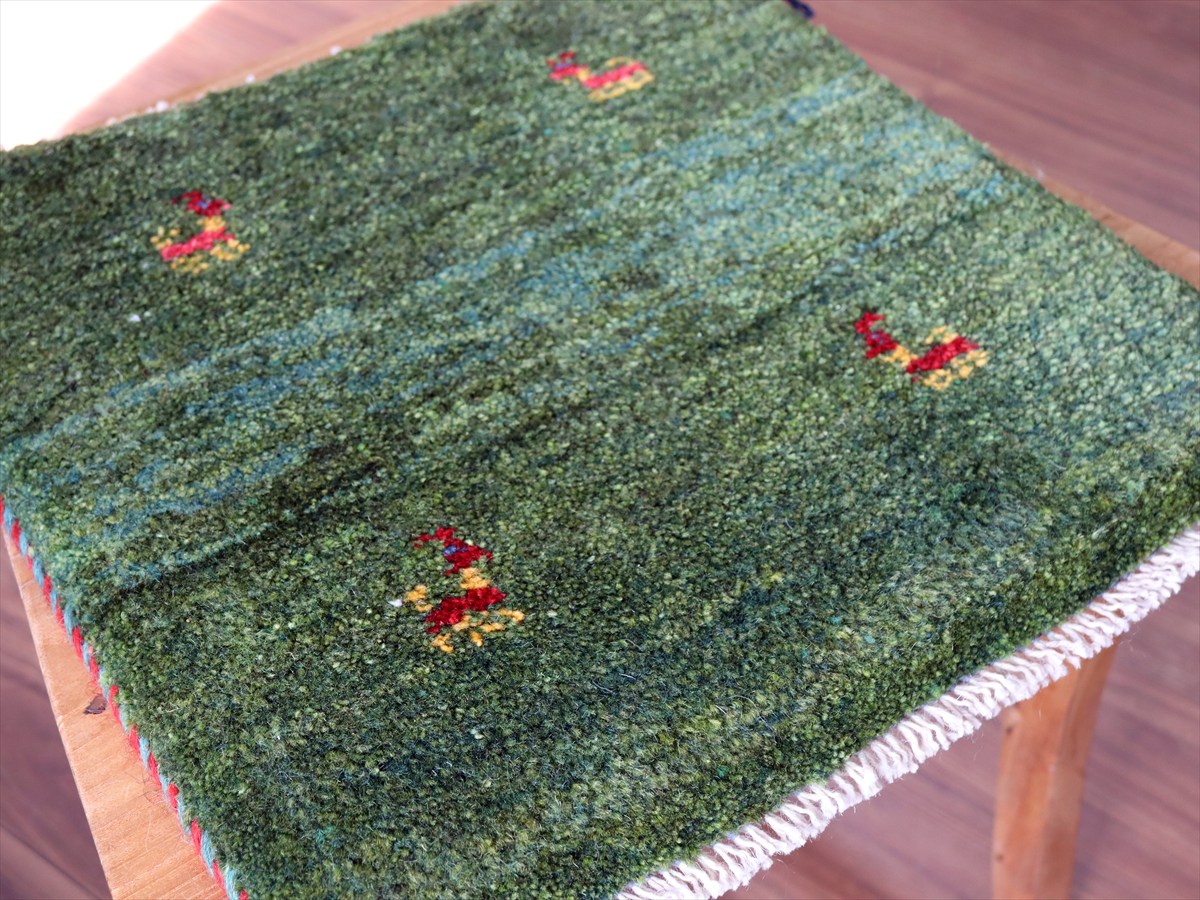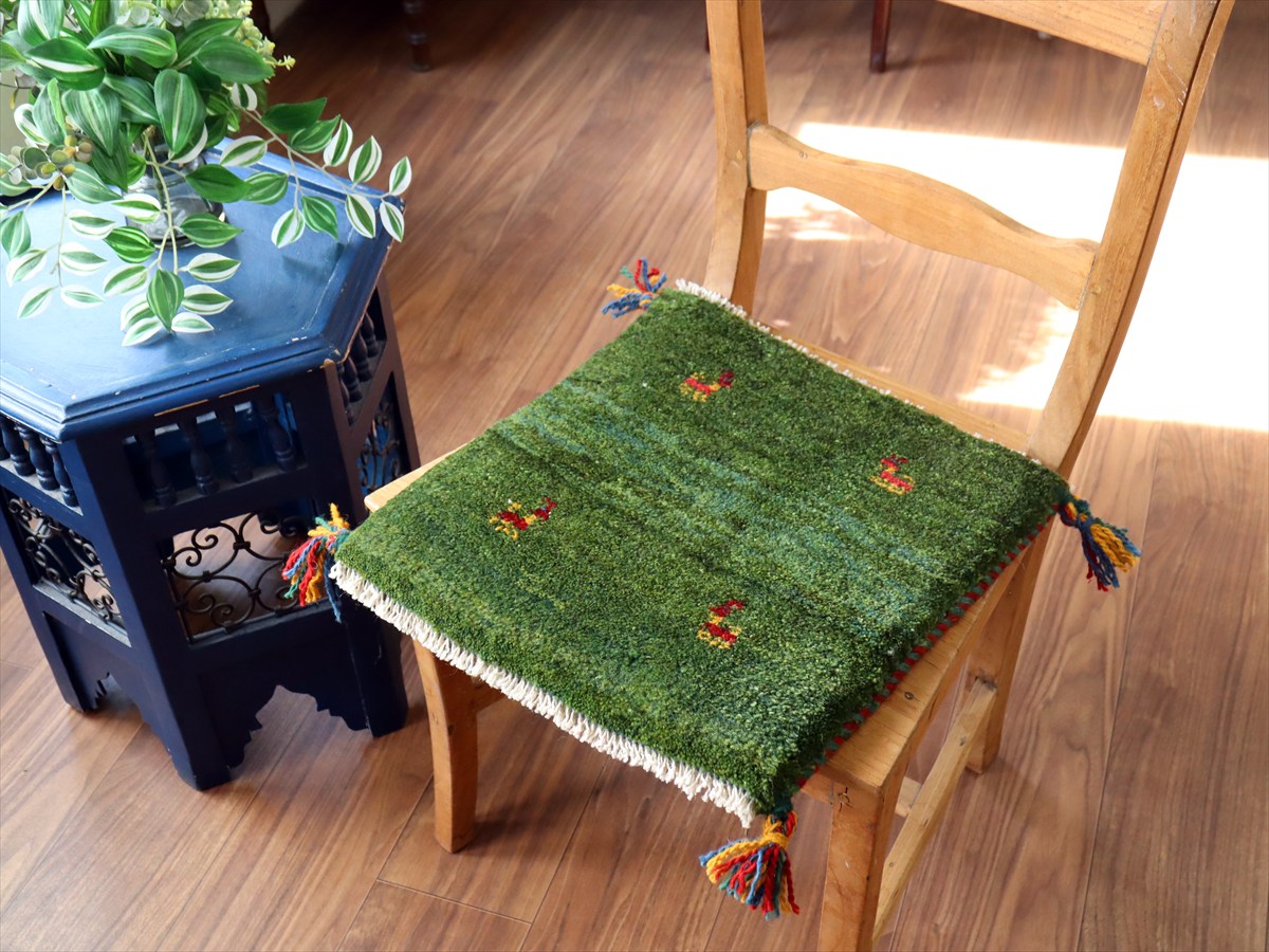 何枚も集めたくなる、40cm角の座布団サイズギャベ。四隅に大きなポンポンのついた、伝統的なスタイルでおられています。フローリングに並べて座布団がわりに使ったり、ベンチやダイニングチェアの座面など、使い方はいろいろ。壁にタペストリーのように飾るのもおすすめです。