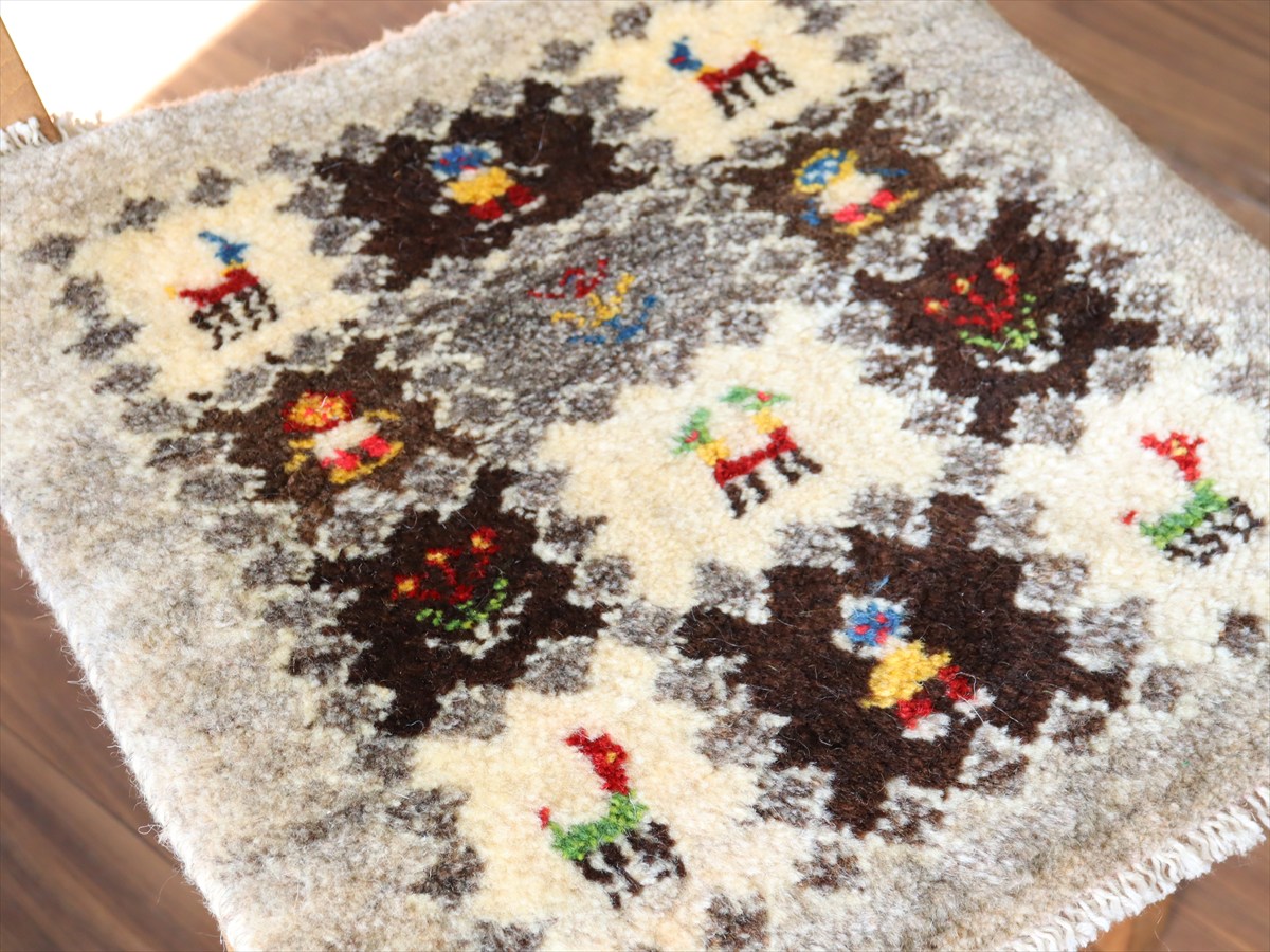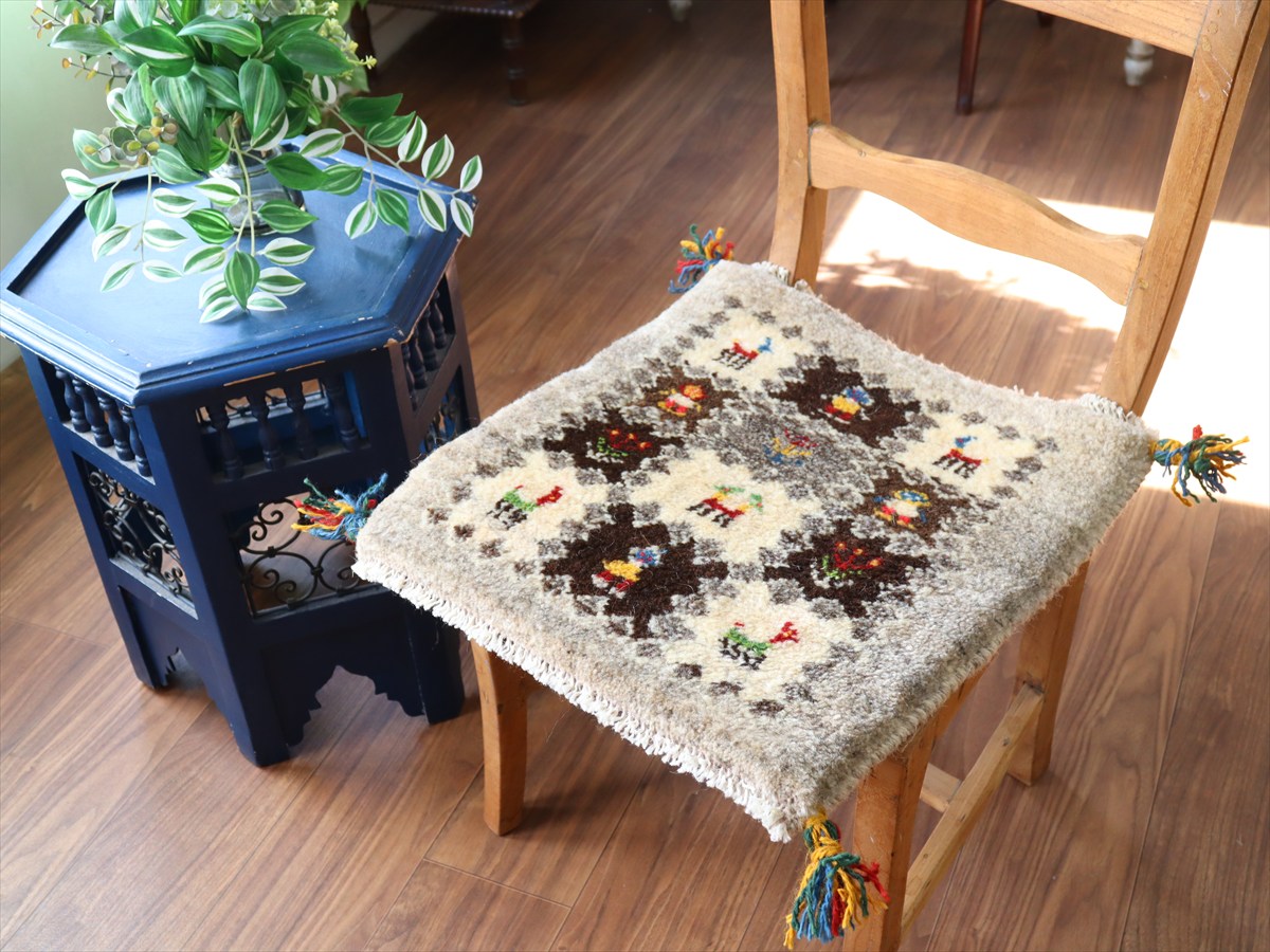 何枚も集めたくなる、40cm角の座布団サイズギャベ。四隅に大きなポンポンのついた、伝統的なスタイルで織られています。フローリングに並べて座布団がわりに使ったり、ベンチやダイニングチェアの座面など、使い方はいろいろ。壁にタペストリーのように飾るのもおすすめです。