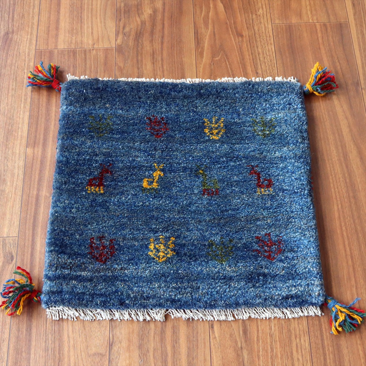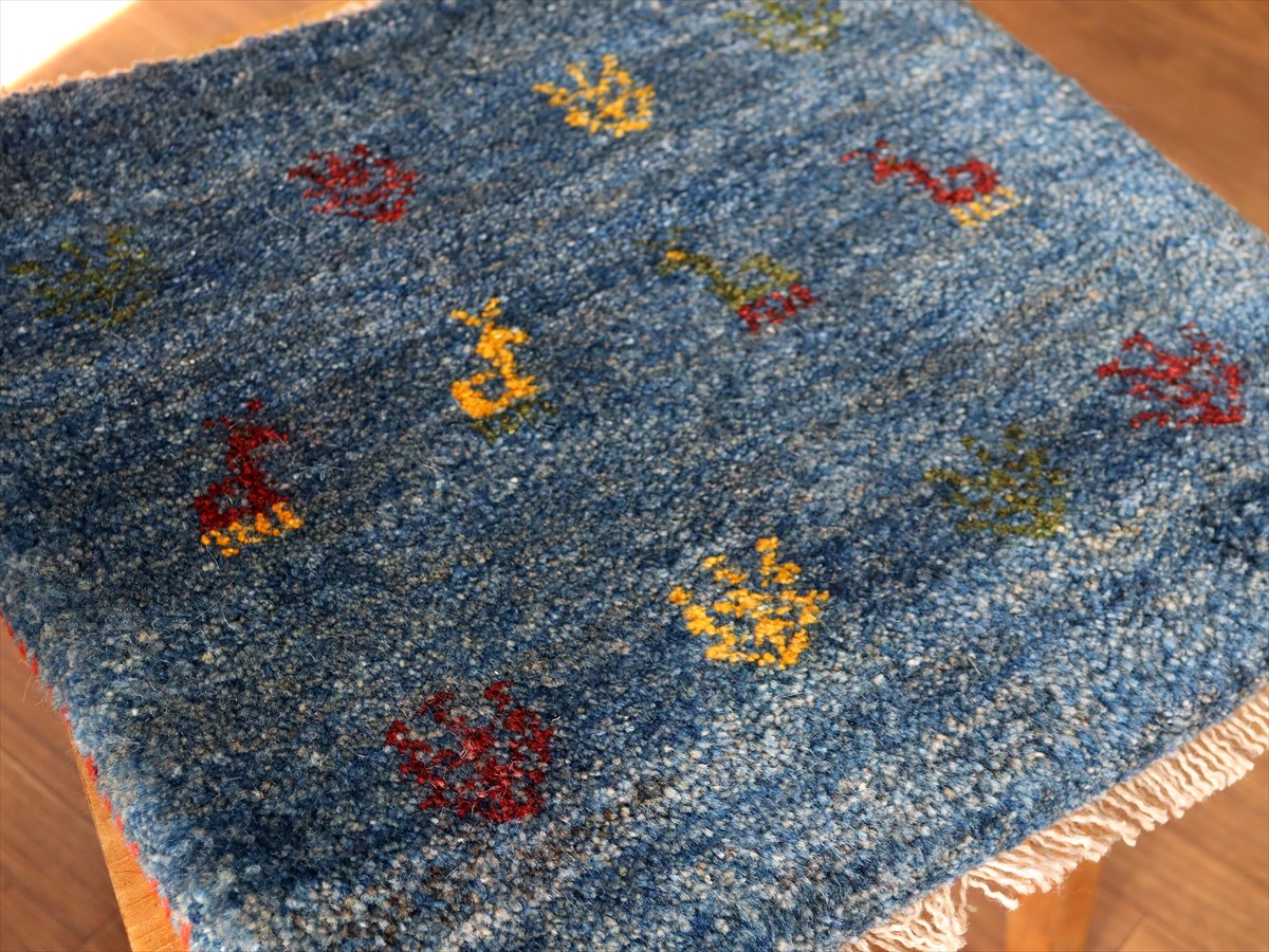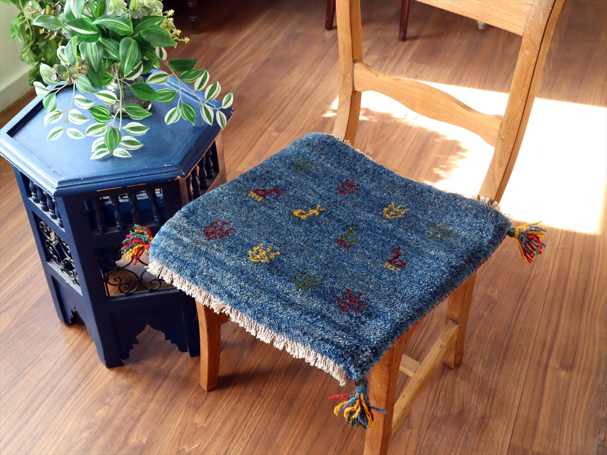 何枚も集めたくなる、40cm角の座布団サイズギャベ。四隅に大きなポンポンのついた、伝統的なスタイルでおられています。フローリングに並べて座布団がわりに使ったり、ベンチやダイニングチェアの座面など、使い方はいろいろ。壁にタペストリーのように飾るのもおすすめです。