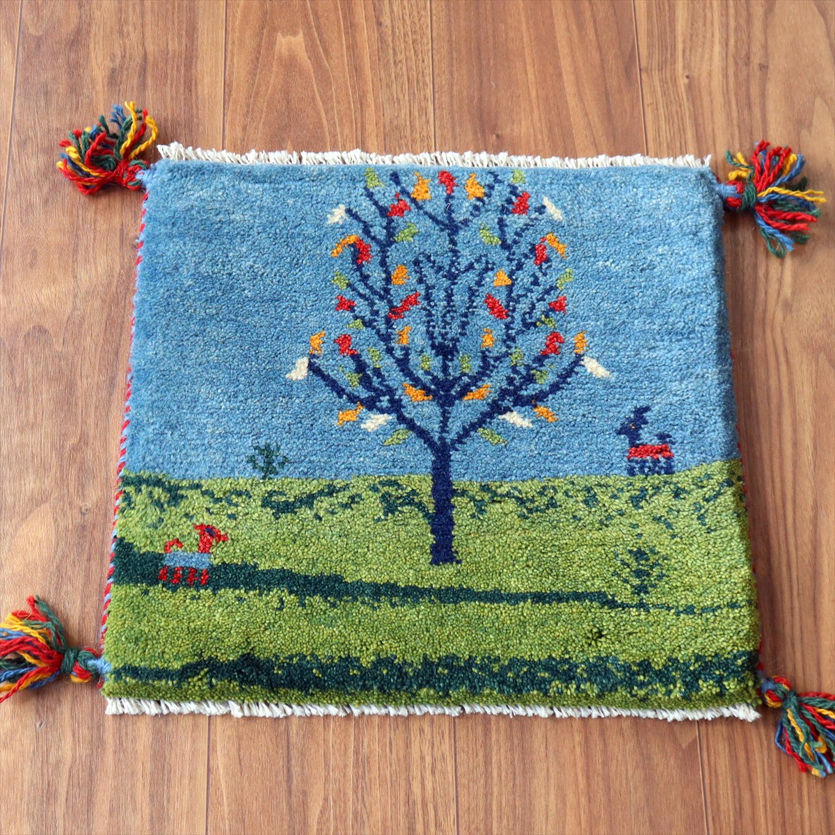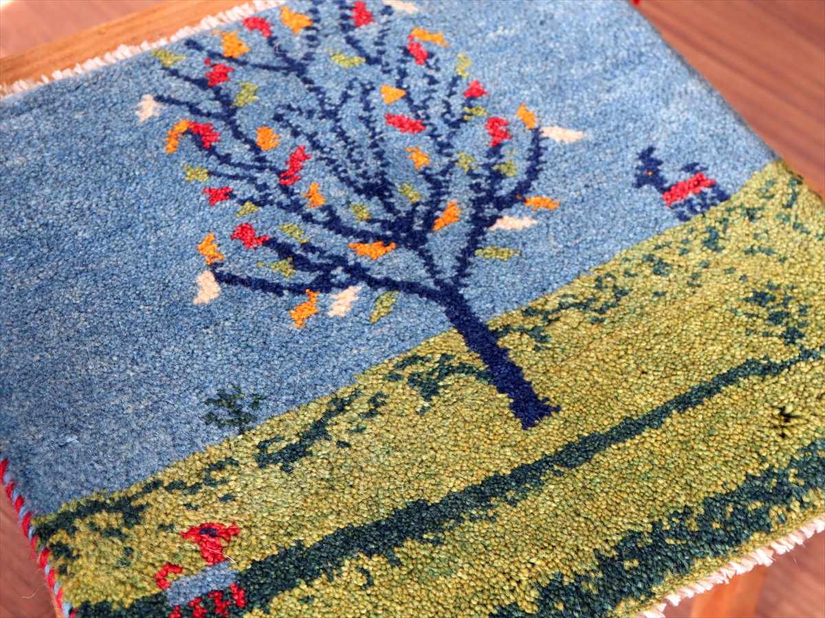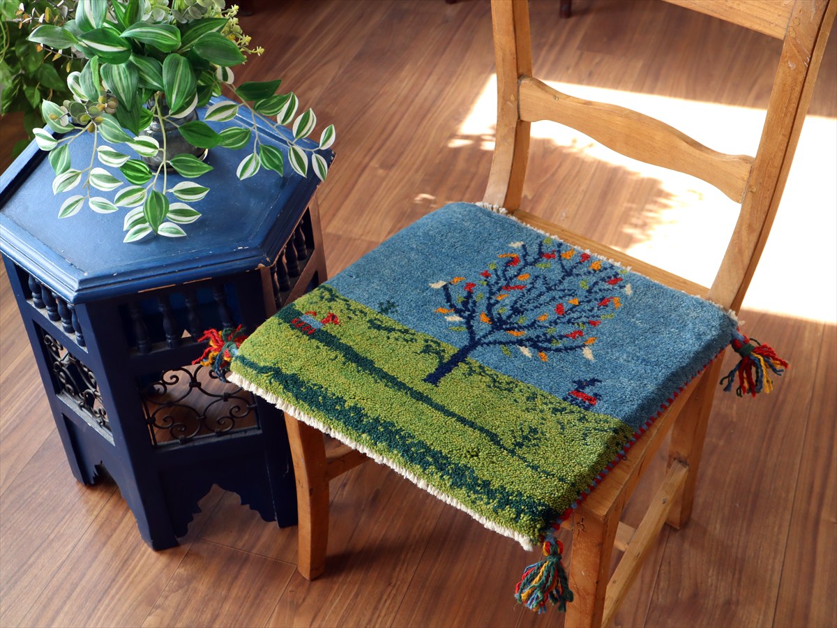 何枚も集めたくなる、40cm角の座布団サイズギャベ。四隅に大きなポンポンのついた、伝統的なスタイルでおられています。フローリングに並べて座布団がわりに使ったり、ベンチやダイニングチェアの座面など、使い方はいろいろ。壁にタペストリーのように飾るのもおすすめです。