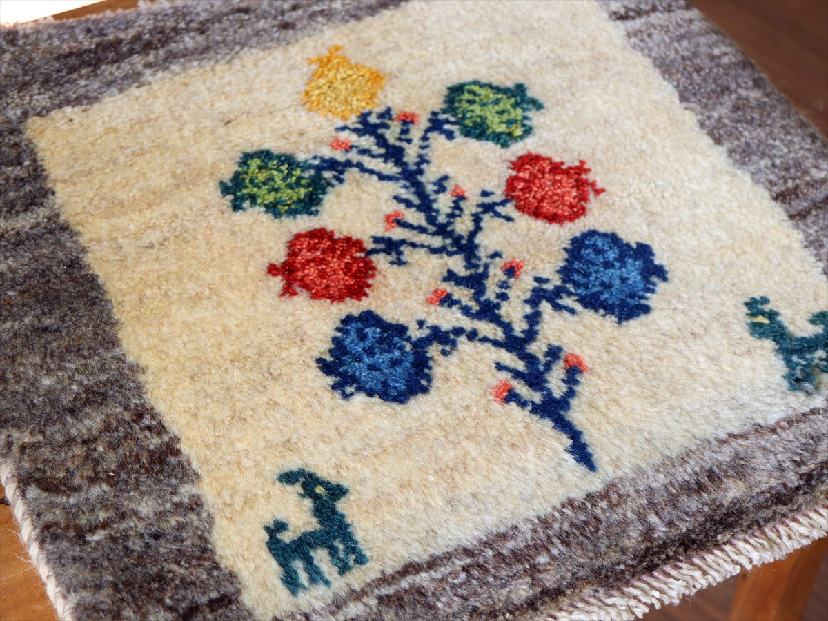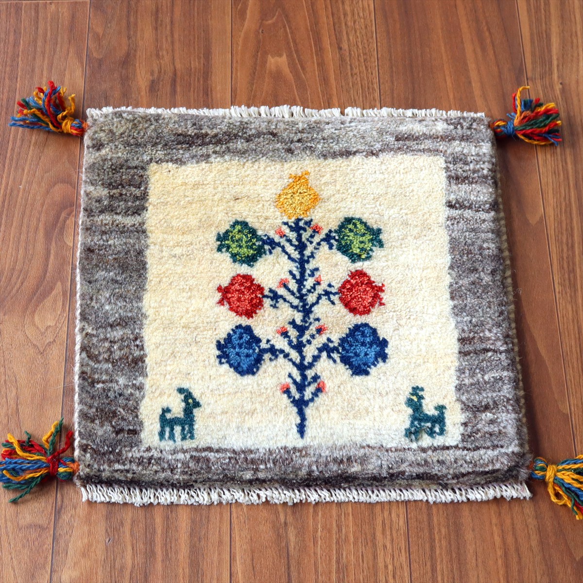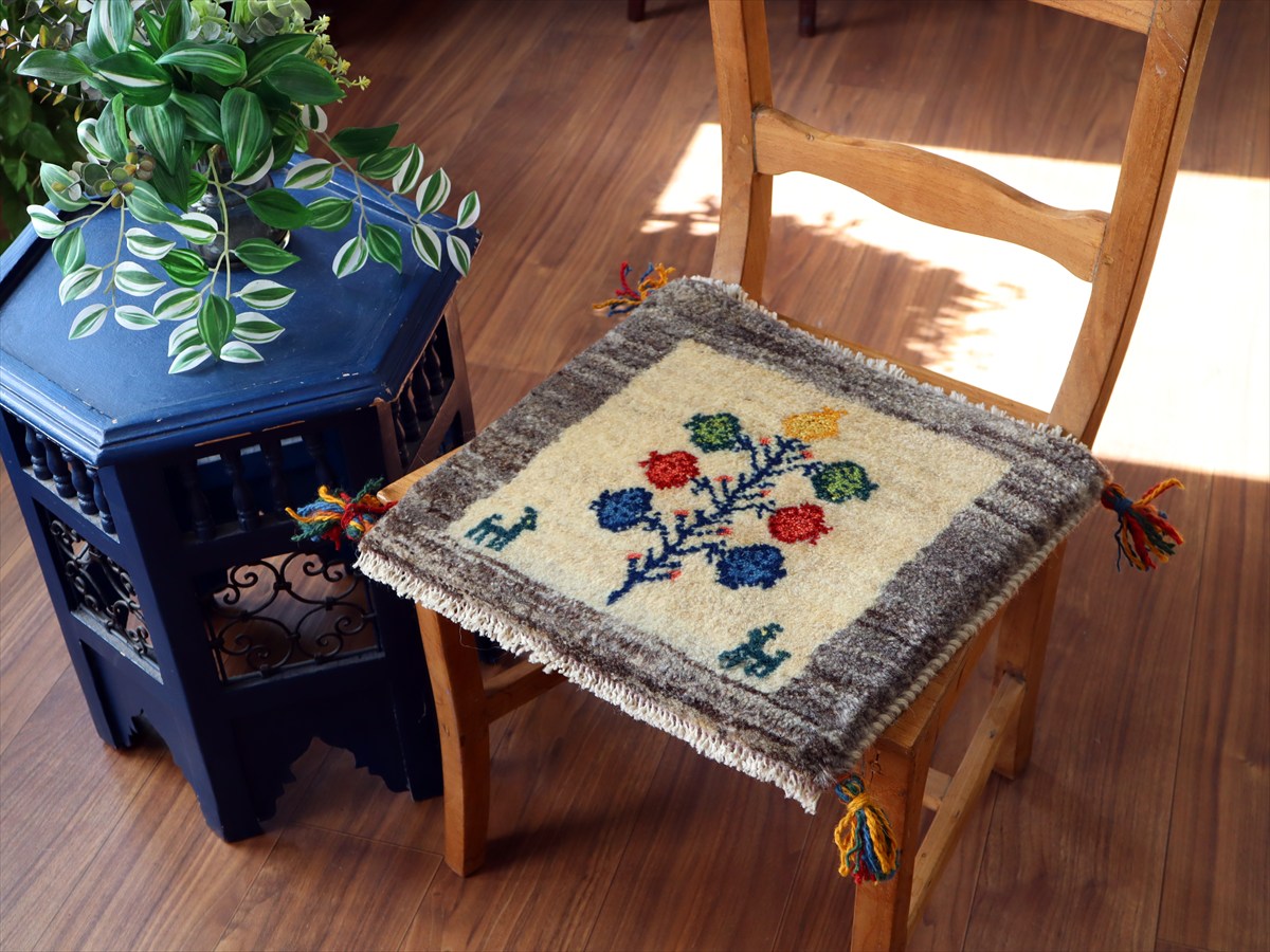 何枚も集めたくなる、40cm角の座布団サイズギャベ。四隅に大きなポンポンのついた、伝統的なスタイルで織られています。フローリングに並べて座布団がわりに使ったり、ベンチやダイニングチェアの座面など、使い方はいろいろ。壁にタペストリーのように飾るのもおすすめです。
