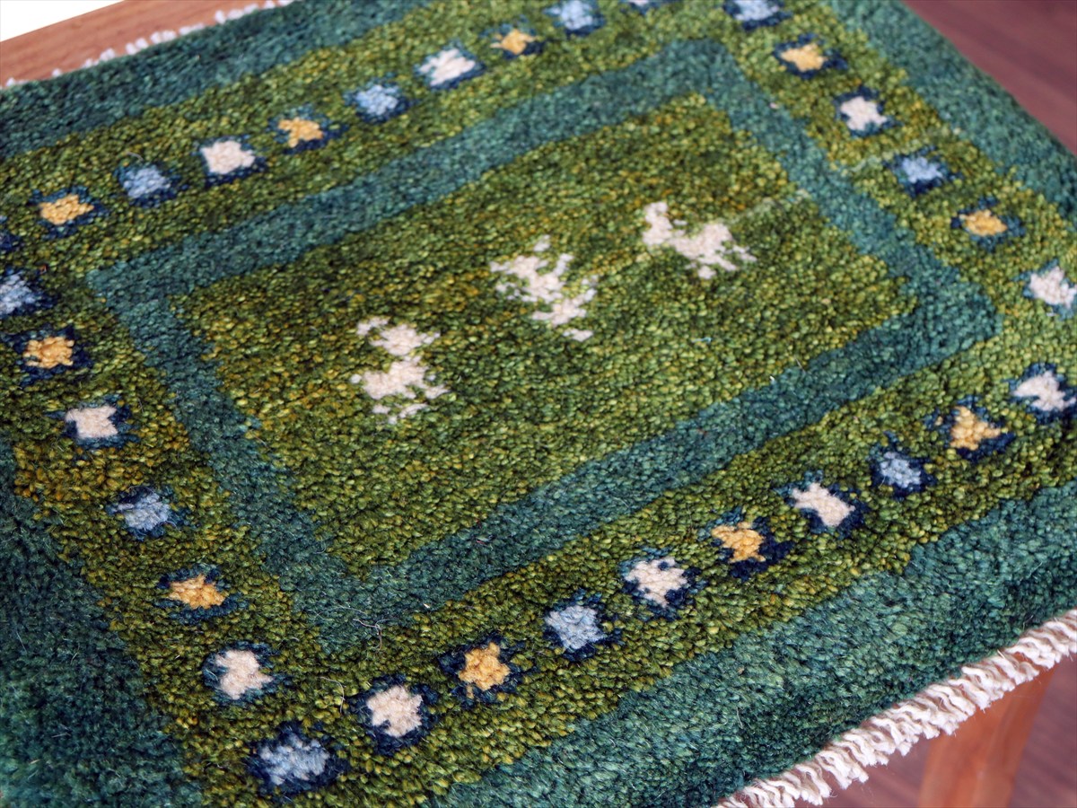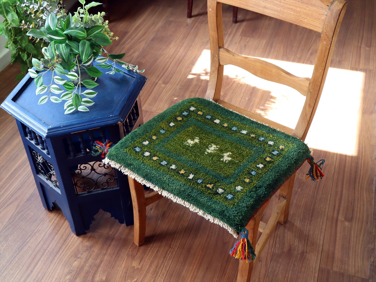 何枚も集めたくなる、40cm角の座布団サイズギャベ。四隅に大きなポンポンのついた、伝統的なスタイルでおられています。フローリングに並べて座布団がわりに使ったり、ベンチやダイニングチェアの座面など、使い方はいろいろ。壁にタペストリーのように飾るのもおすすめです。