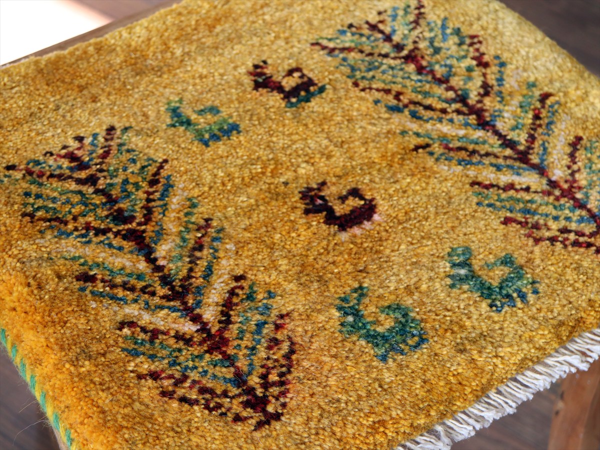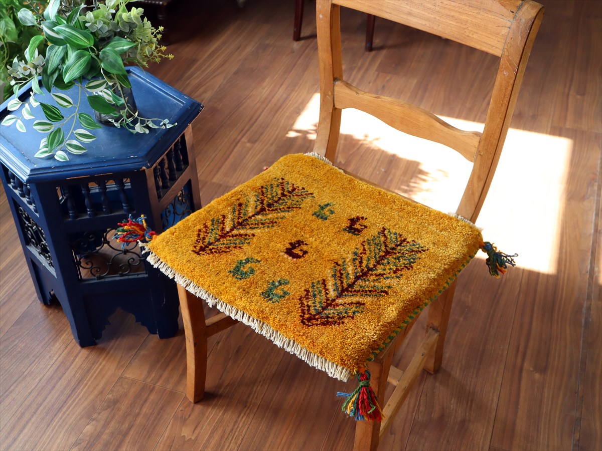 何枚も集めたくなる、40cm角の座布団サイズギャベ。四隅に大きなポンポンのついた、伝統的なスタイルでおられています。フローリングに並べて座布団がわりに使ったり、ベンチやダイニングチェアの座面など、使い方はいろいろ。壁にタペストリーのように飾るのもおすすめです。