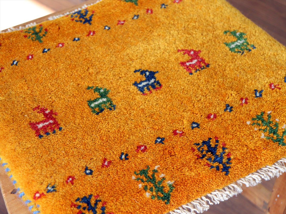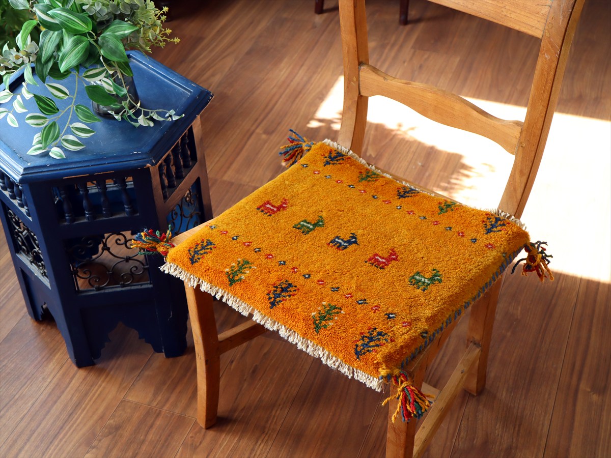 何枚も集めたくなる、40cm角の座布団サイズギャベ。四隅に大きなポンポンのついた、伝統的なスタイルでおられています。フローリングに並べて座布団がわりに使ったり、ベンチやダイニングチェアの座面など、使い方はいろいろ。壁にタペストリーのように飾るのもおすすめです。