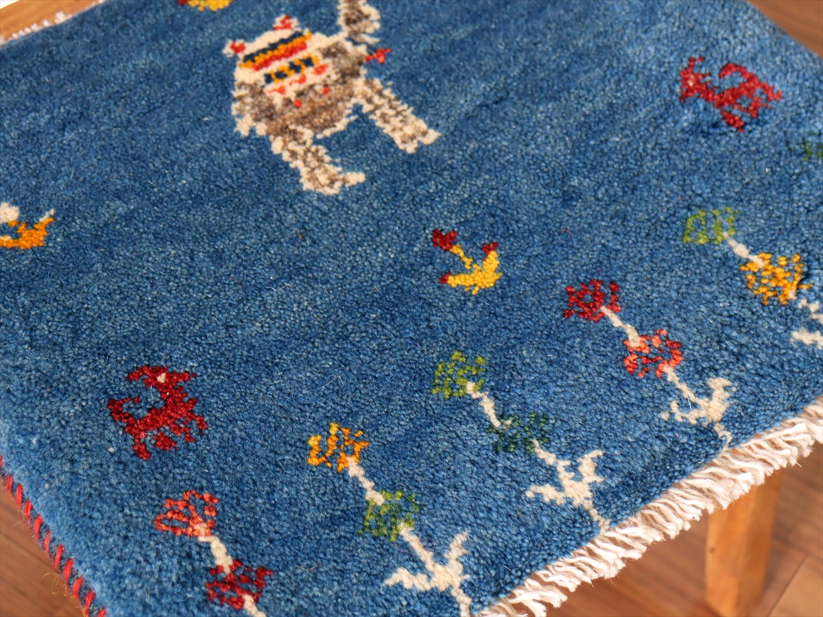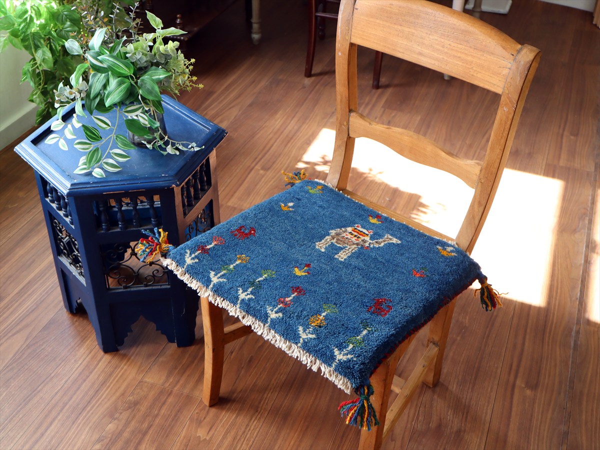何枚も集めたくなる、40cm角の座布団サイズギャベ。四隅に大きなポンポンのついた、伝統的なスタイルでおられています。フローリングに並べて座布団がわりに使ったり、ベンチやダイニングチェアの座面など、使い方はいろいろ。壁にタペストリーのように飾るのもおすすめです。