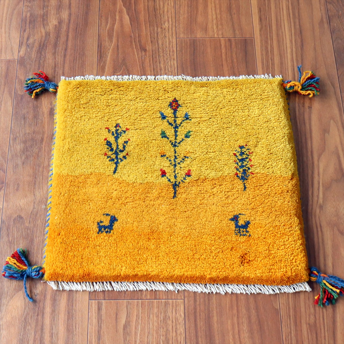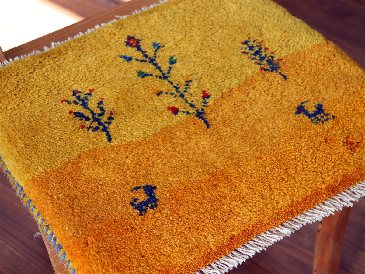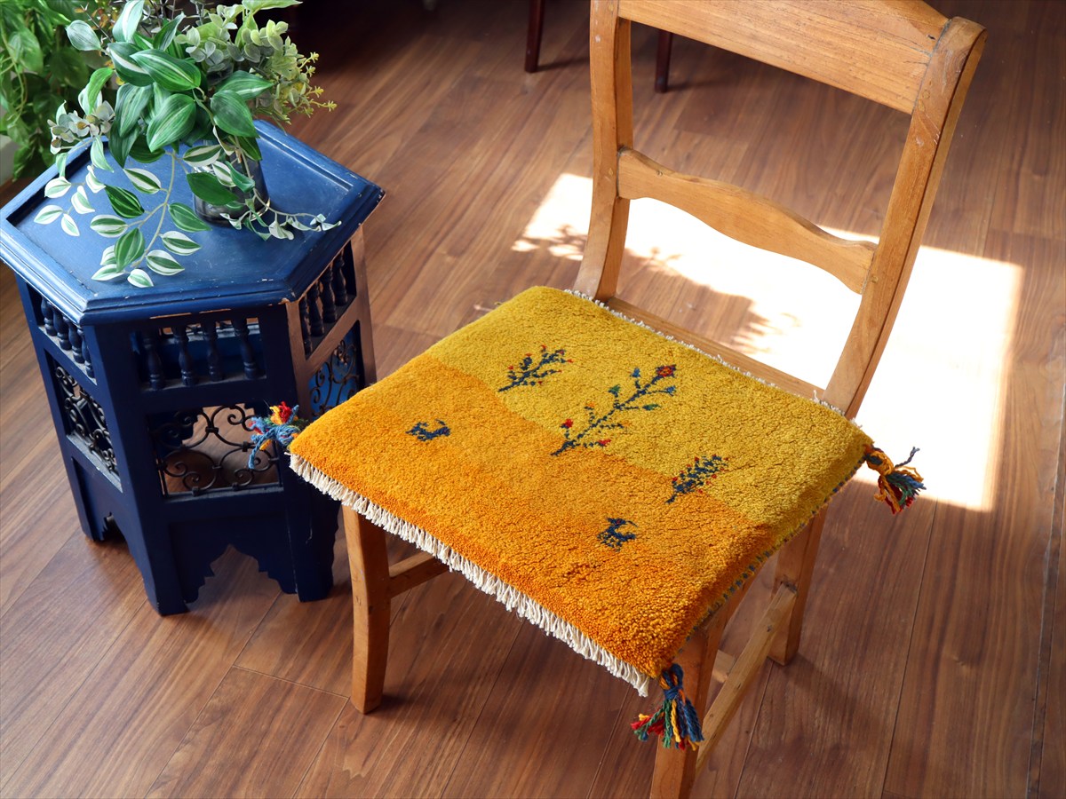 何枚も集めたくなる、40cm角の座布団サイズギャベ。四隅に大きなポンポンのついた、伝統的なスタイルでおられています。フローリングに並べて座布団がわりに使ったり、ベンチやダイニングチェアの座面など、使い方はいろいろ。壁にタペストリーのように飾るのもおすすめです。