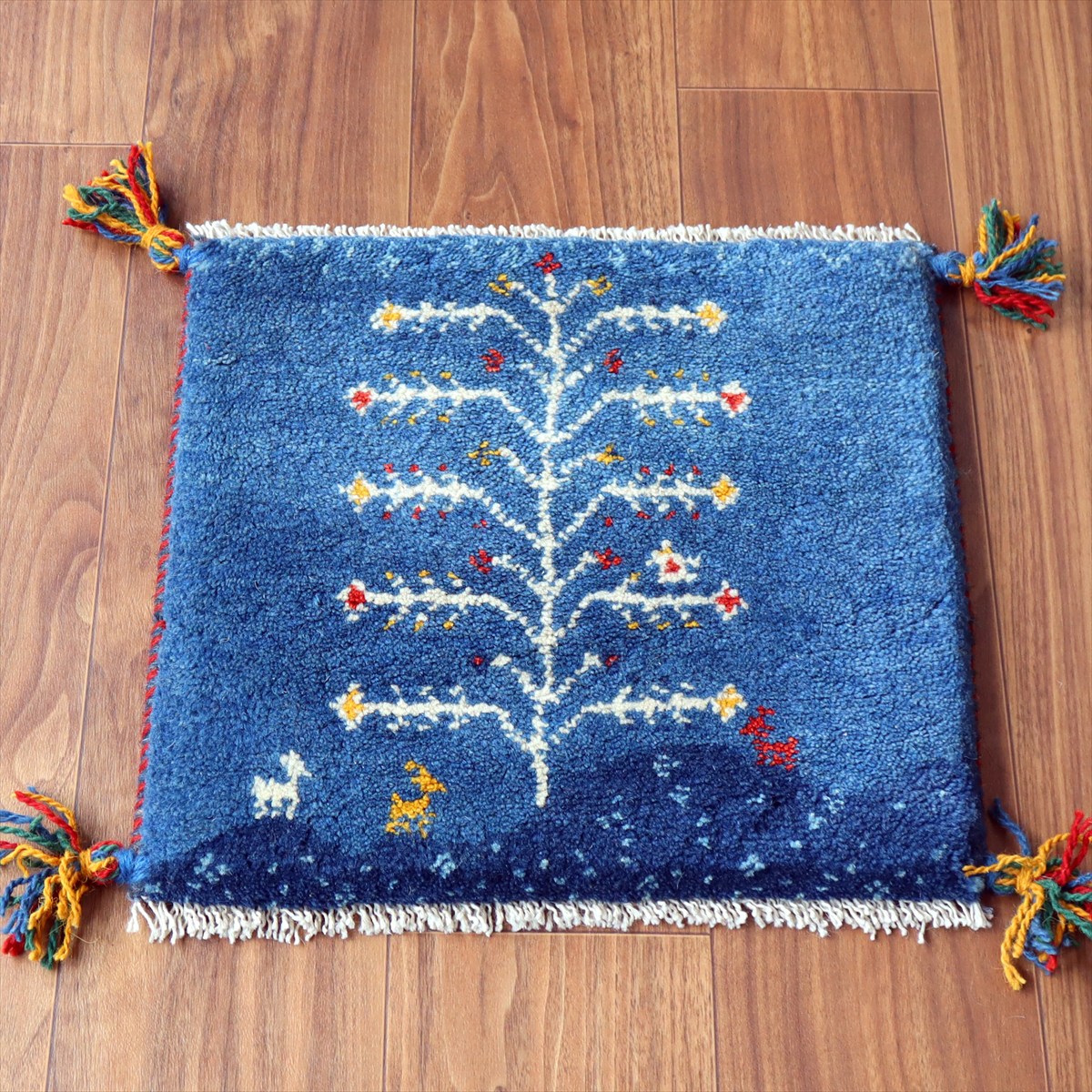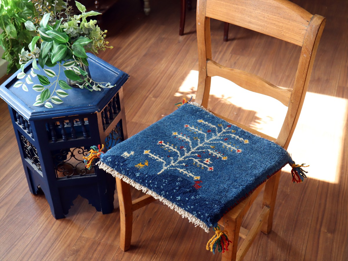 何枚も集めたくなる、40cm角の座布団サイズギャベ。四隅に大きなポンポンのついた、伝統的なスタイルでおられています。フローリングに並べて座布団がわりに使ったり、ベンチやダイニングチェアの座面など、使い方はいろいろ。壁にタペストリーのように飾るのもおすすめです。