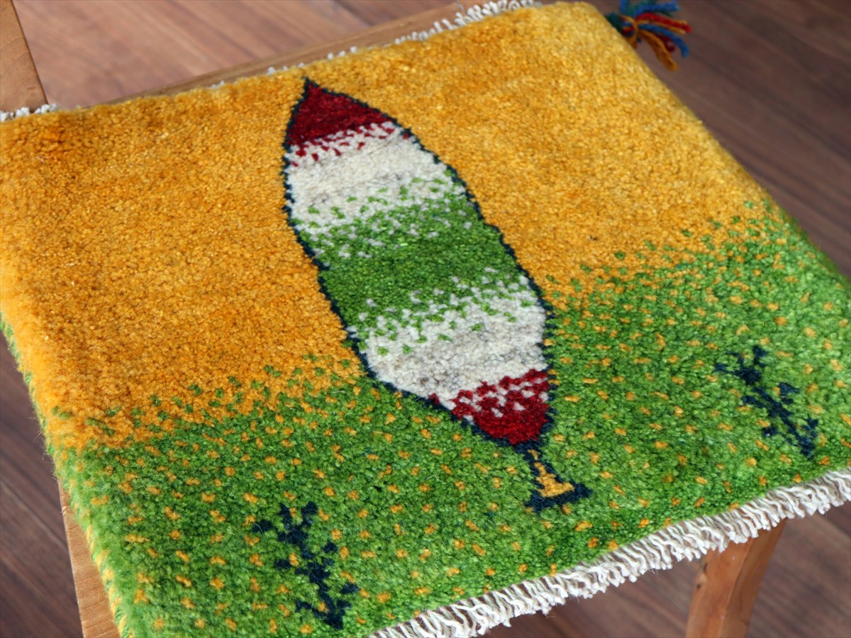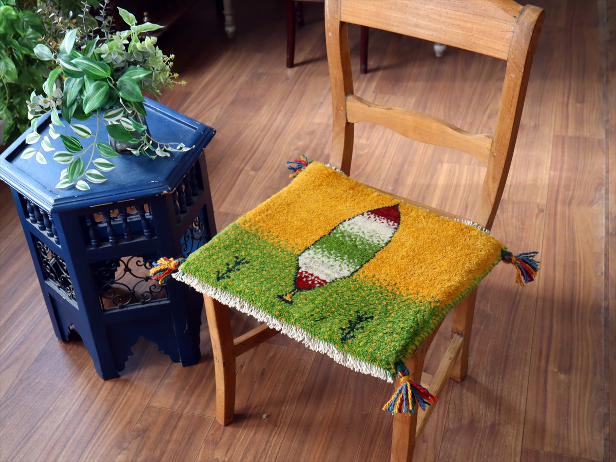 何枚も集めたくなる、40cm角の座布団サイズギャベ。四隅に大きなポンポンのついた、伝統的なスタイルでおられています。フローリングに並べて座布団がわりに使ったり、ベンチやダイニングチェアの座面など、使い方はいろいろ。壁にタペストリーのように飾るのもおすすめです。