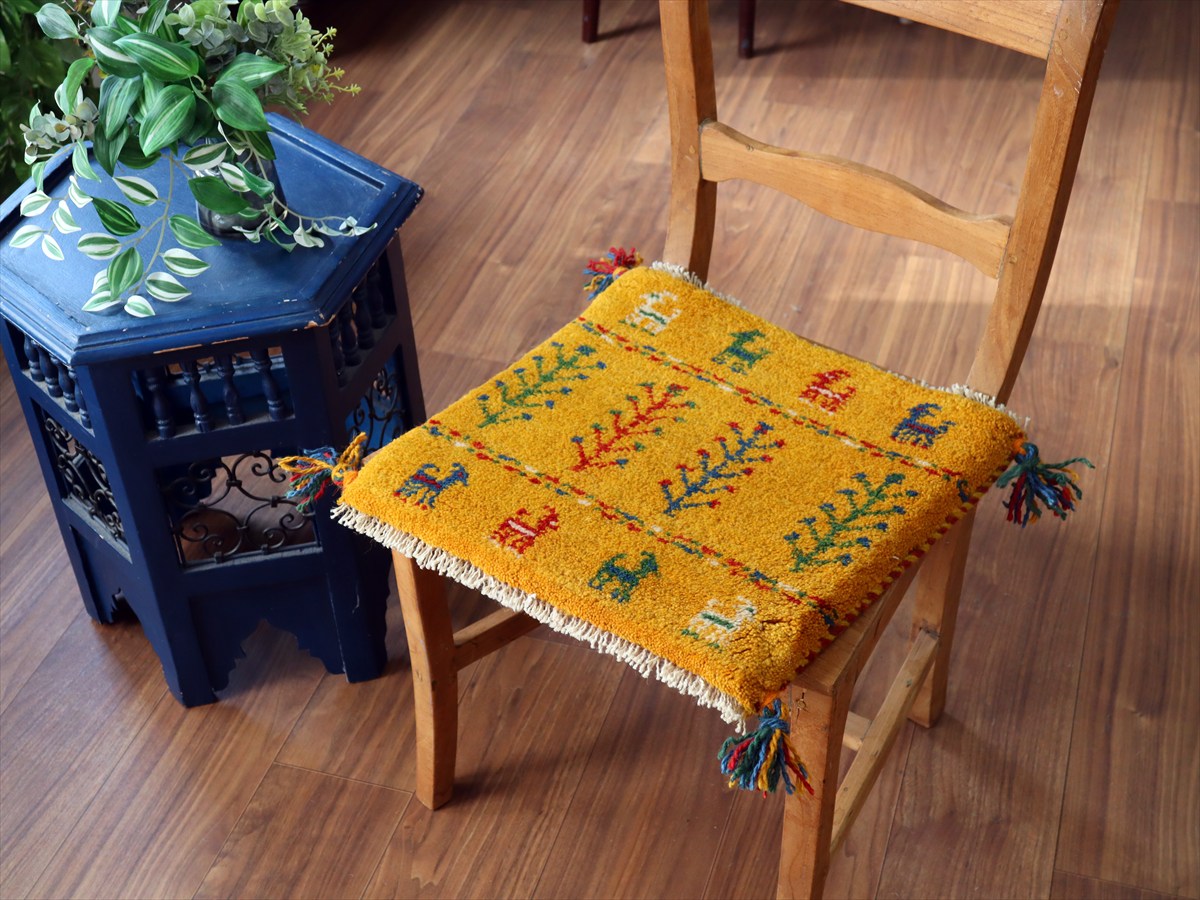 何枚も集めたくなる、40cm角の座布団サイズギャベ。四隅に大きなポンポンのついた、伝統的なスタイルでおられています。フローリングに並べて座布団がわりに使ったり、ベンチやダイニングチェアの座面など、使い方はいろいろ。壁にタペストリーのように飾るのもおすすめです。