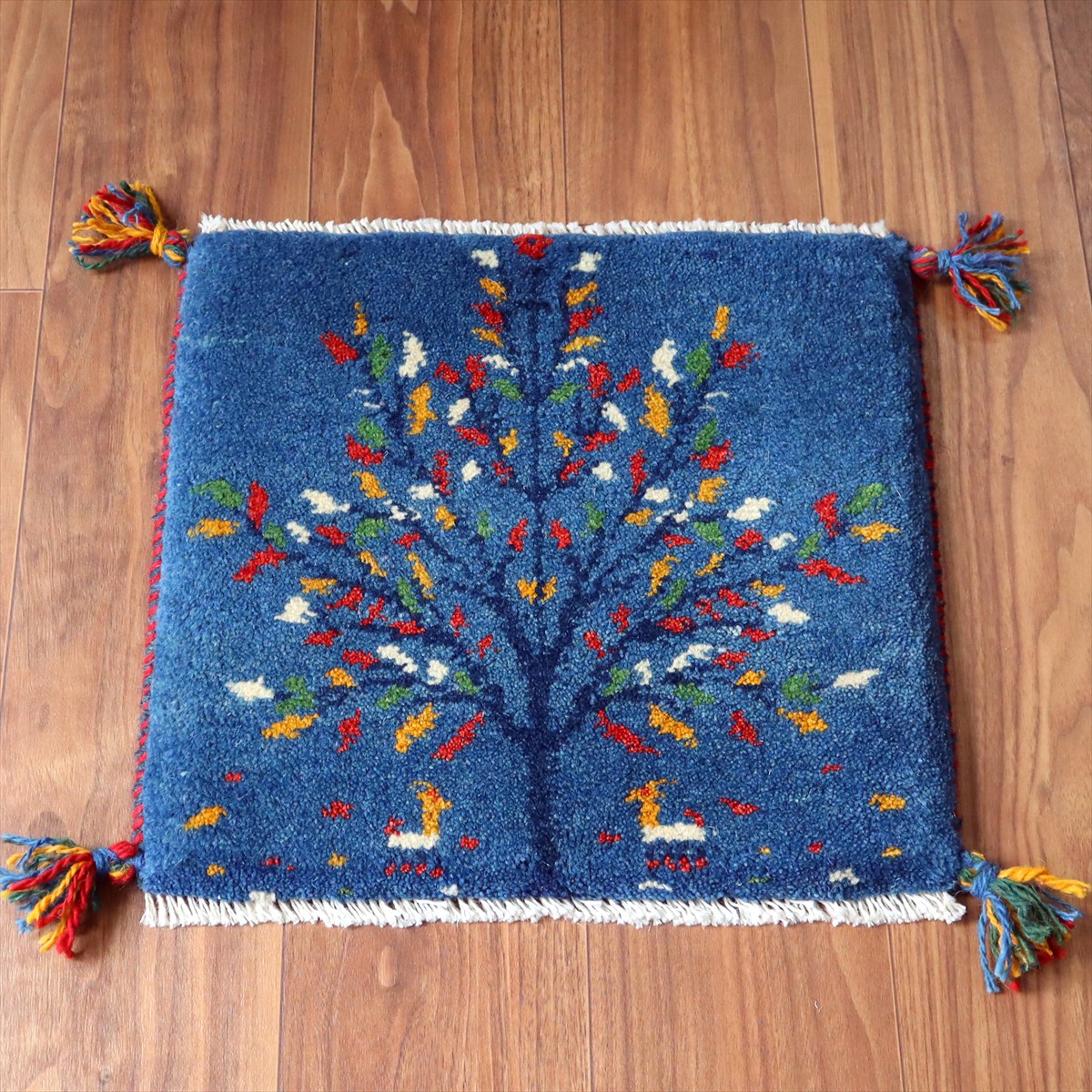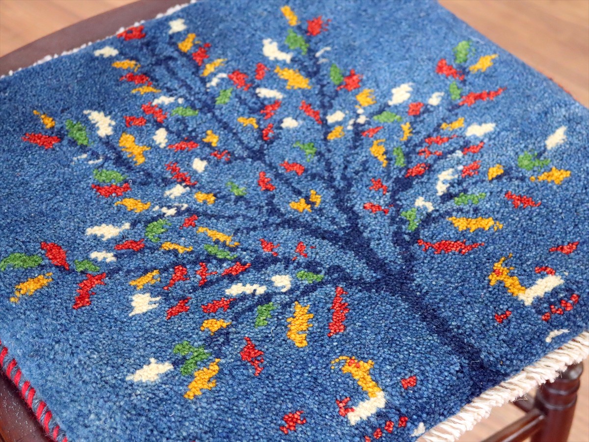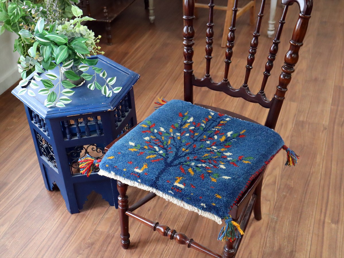 何枚も集めたくなる、40cm角の座布団サイズギャベ。四隅に大きなポンポンのついた、伝統的なスタイルでおられています。フローリングに並べて座布団がわりに使ったり、ベンチやダイニングチェアの座面など、使い方はいろいろ。壁にタペストリーのように飾るのもおすすめです。