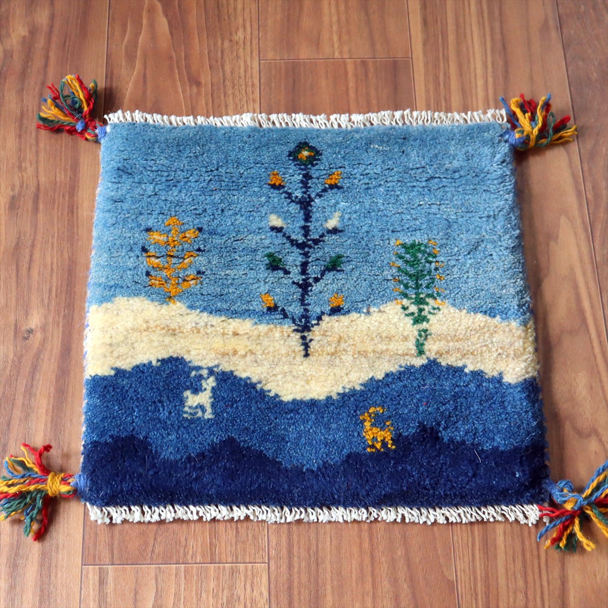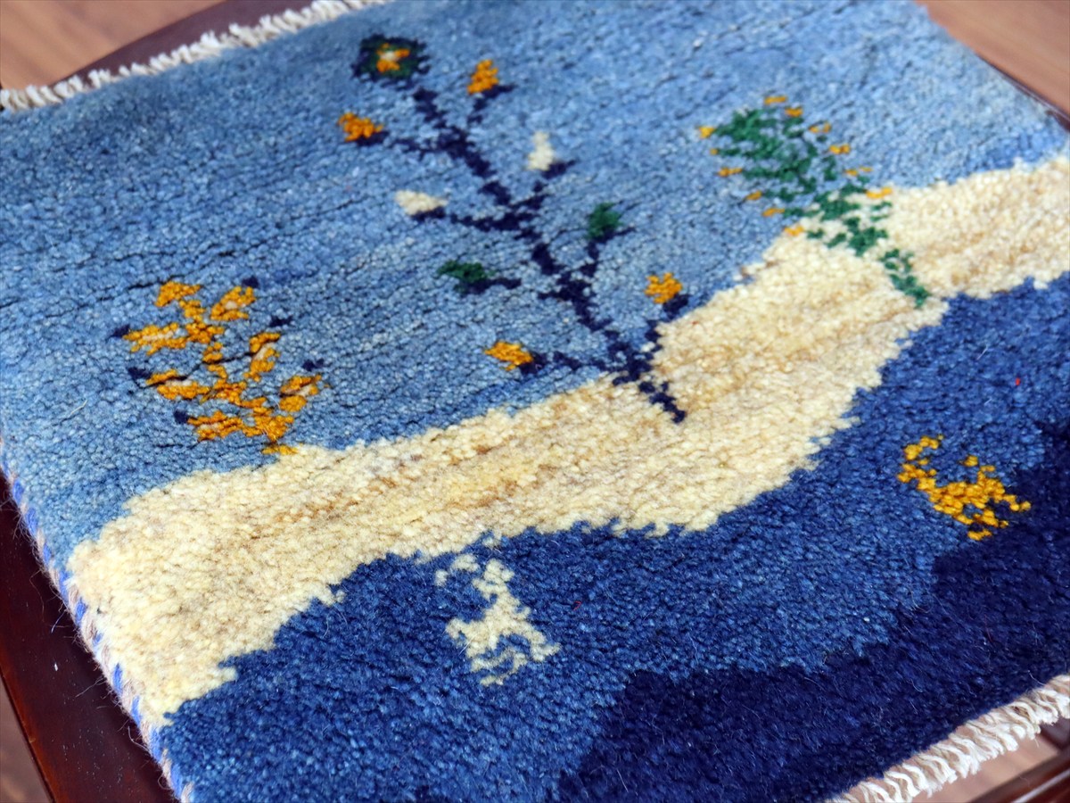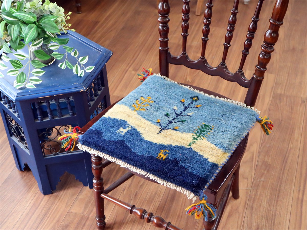 何枚も集めたくなる、40cm角の座布団サイズギャベ。四隅に大きなポンポンのついた、伝統的なスタイルでおられています。フローリングに並べて座布団がわりに使ったり、ベンチやダイニングチェアの座面など、使い方はいろいろ。壁にタペストリーのように飾るのもおすすめです。