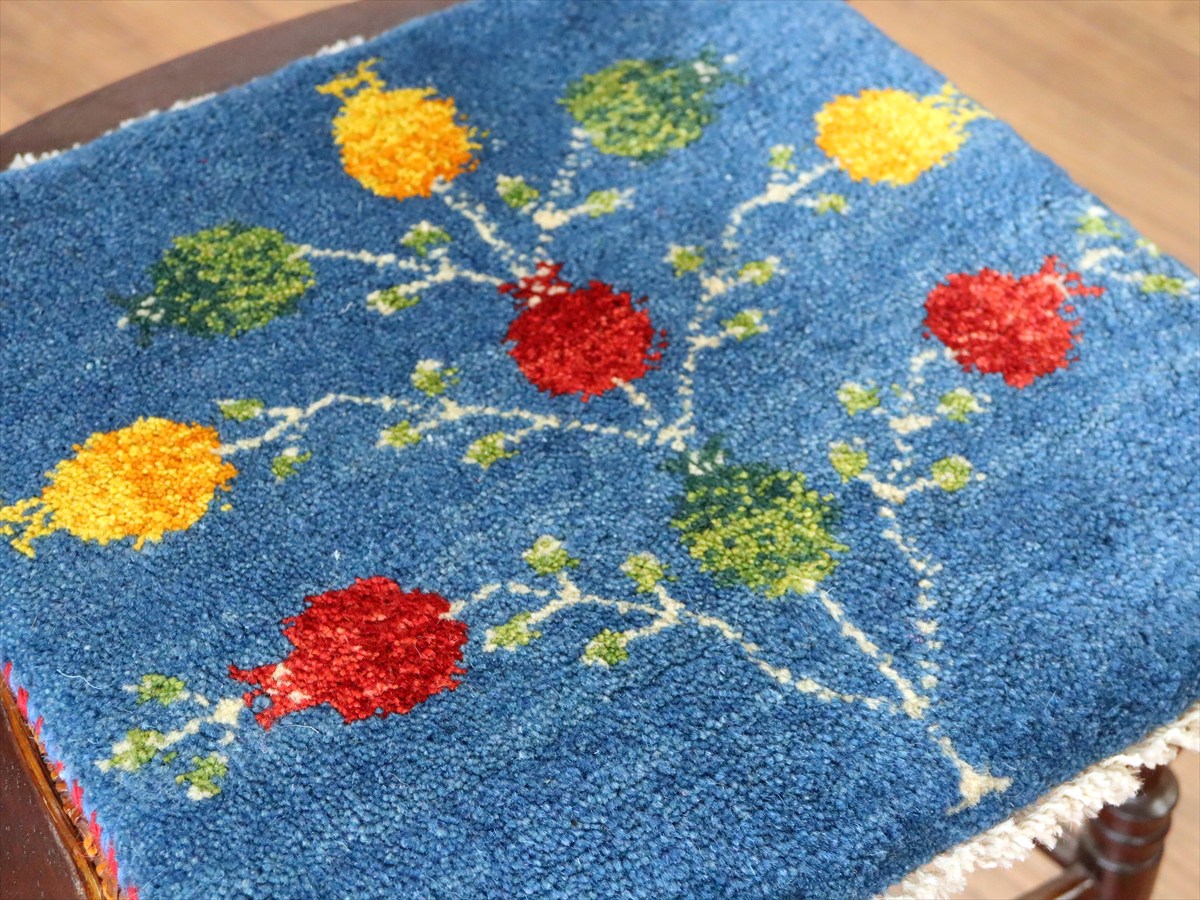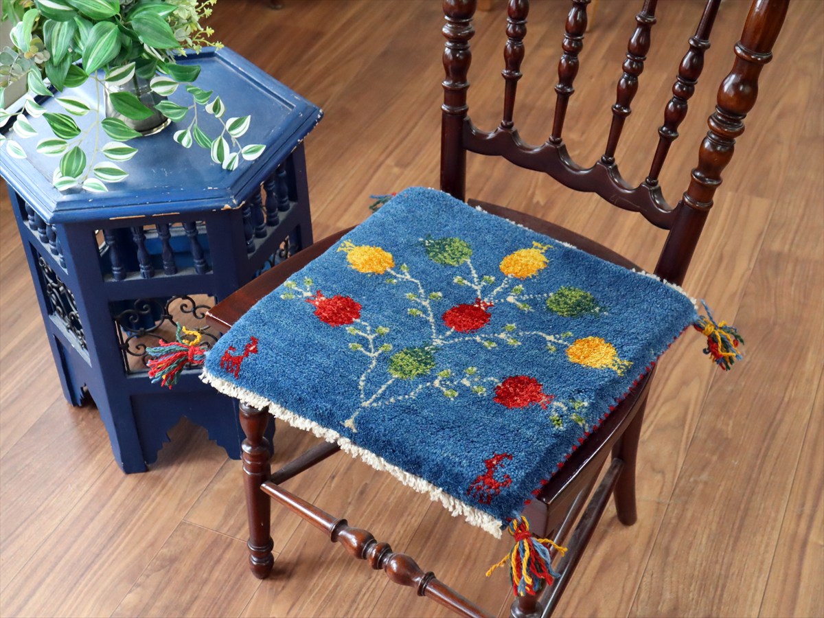 何枚も集めたくなる、40cm角の座布団サイズギャベ。四隅に大きなポンポンのついた、伝統的なスタイルでおられています。フローリングに並べて座布団がわりに使ったり、ベンチやダイニングチェアの座面など、使い方はいろいろ。壁にタペストリーのように飾るのもおすすめです。