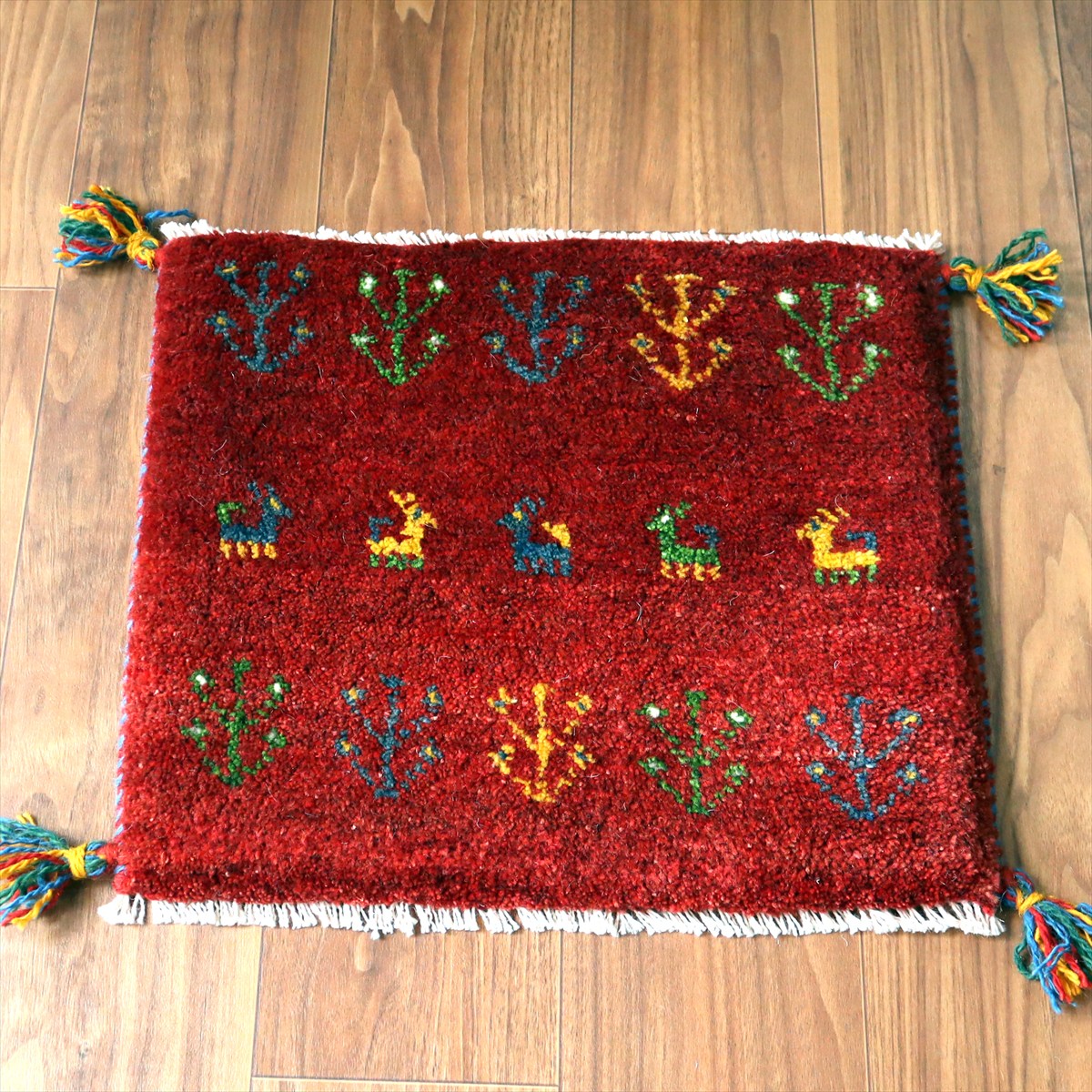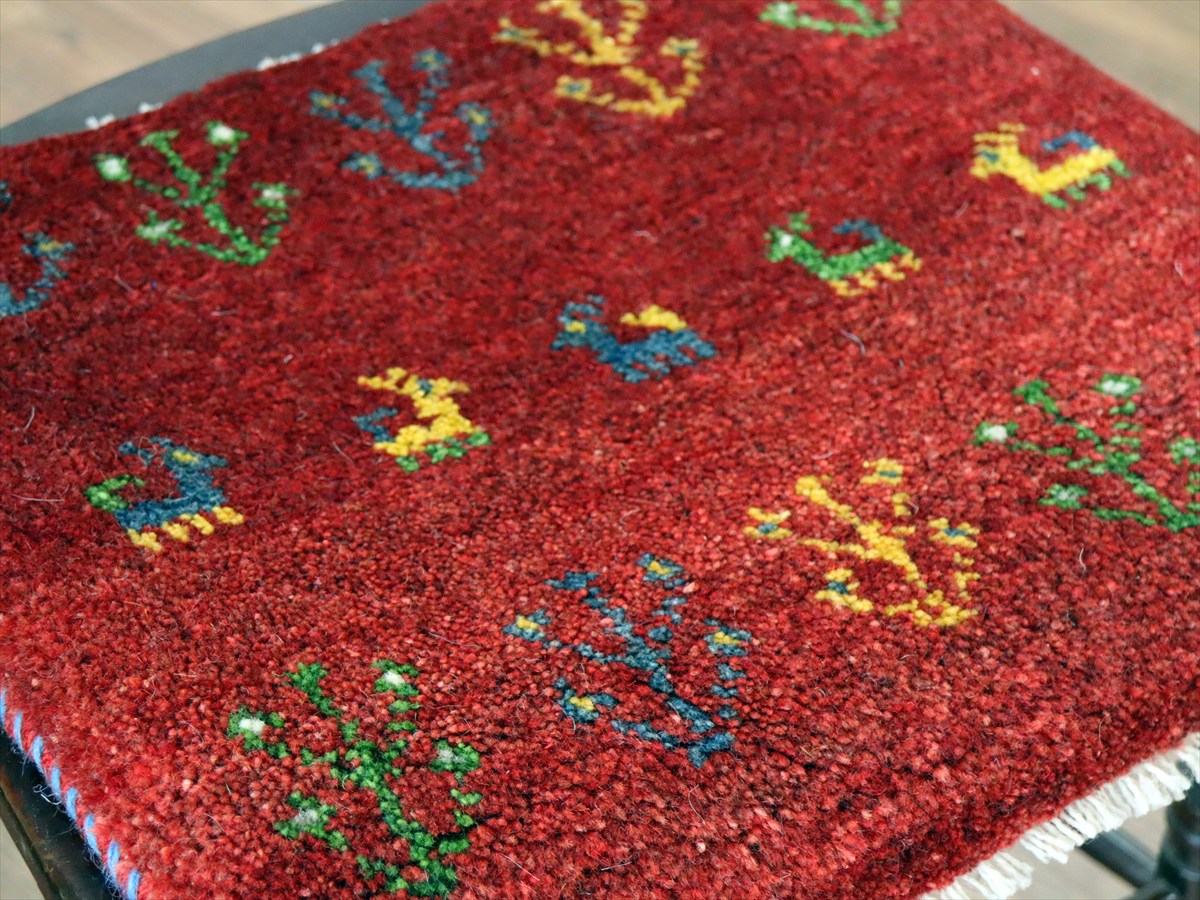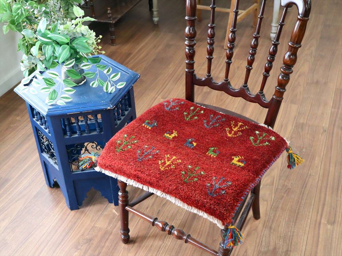 何枚も集めたくなる、40cm角の座布団サイズギャベ。四隅に大きなポンポンのついた、伝統的なスタイルでおられています。フローリングに並べて座布団がわりに使ったり、ベンチやダイニングチェアの座面など、使い方はいろいろ。壁にタペストリーのように飾るのもおすすめです。